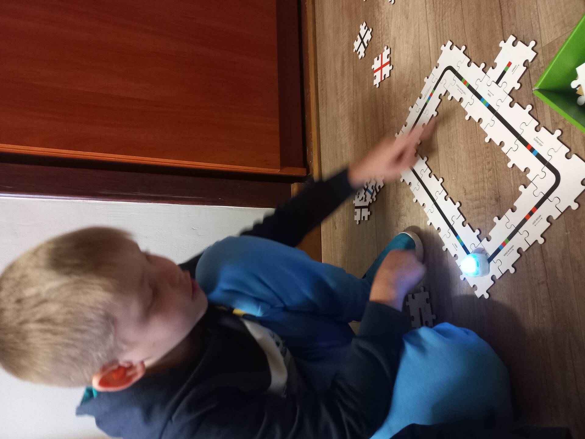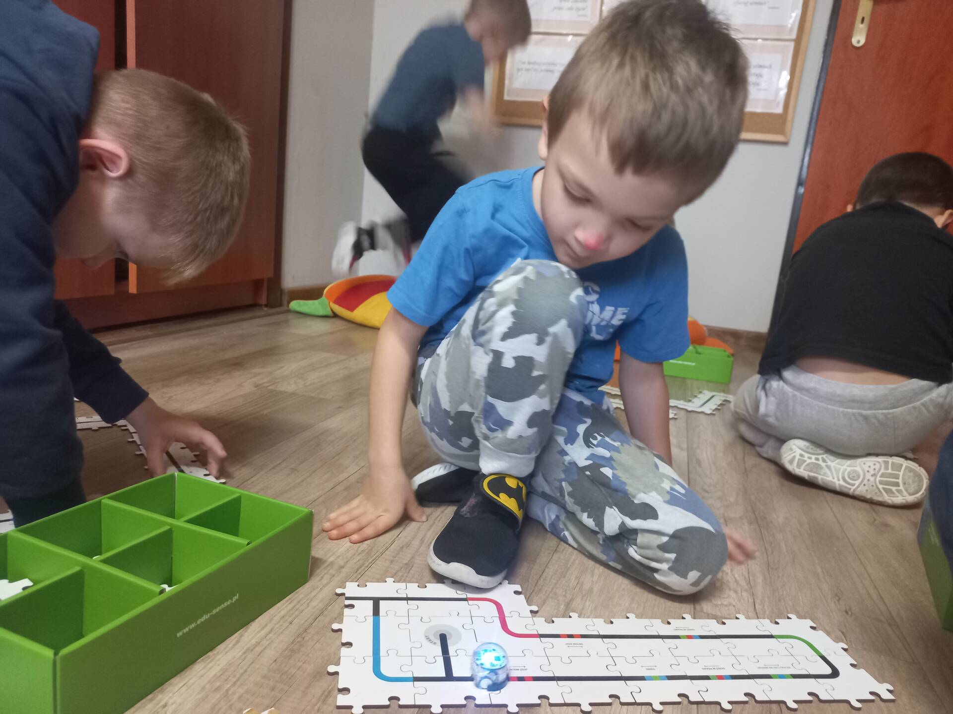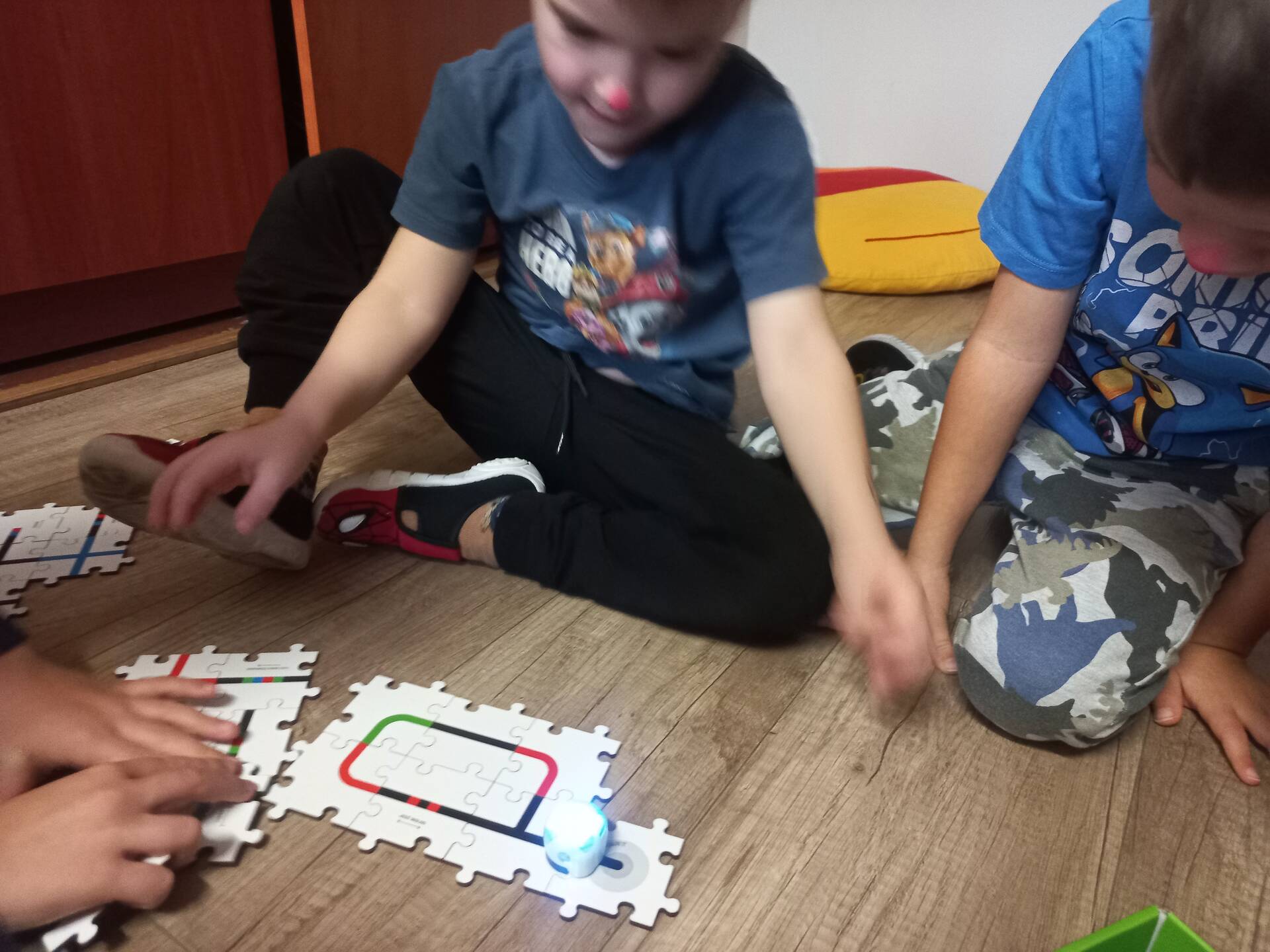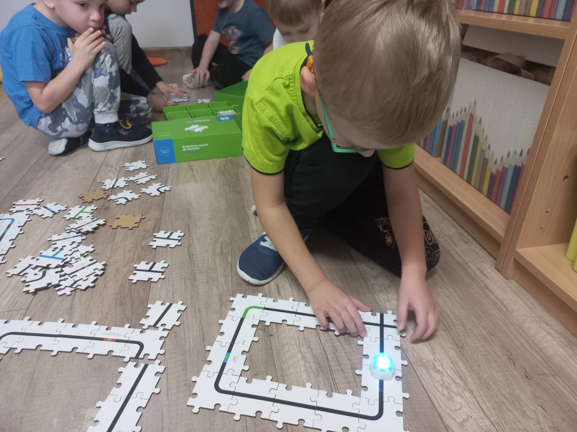 13.12.2024r. przedszkolaki układały na macie edukacyjnej choinkę według kodu. Później przyozdobiły ją „bombkami”. Na koniec zajęć z puzzli ułożyli bombki, po których poruszał się robot Ozobot.