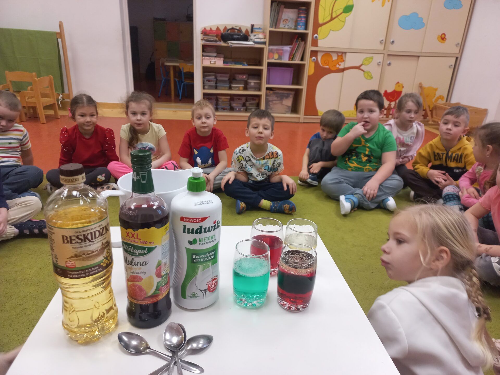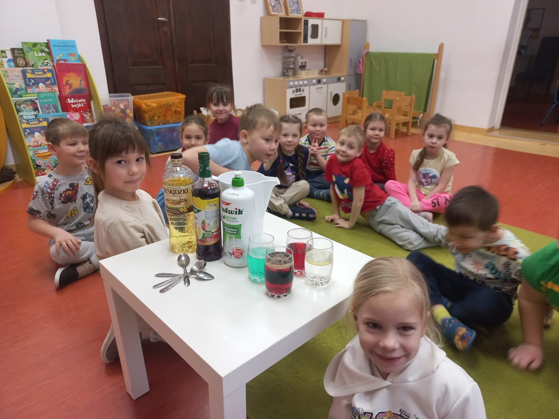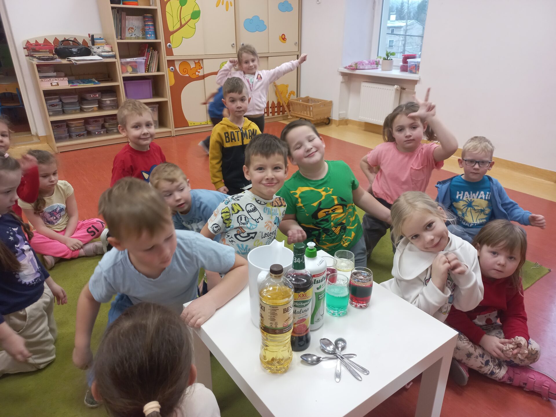 27.01.2026r. Dzieci z gr. Bławatki wzięły udział w zajęciach badawczych. Dzieci obserwowały doświadczenie z wodą i płynami (olejem, sokiem malinowym i płynem do naczyń). Przedszkolaki badały, które płyny połącza się wodą. Na koniec zajęć z wszystkich płynów wykonaliśmy kolorową warstwę. W zabawie dowolnej chłopcy zainspirowani kolorami płynów przygotowali wieżę z kolorowych kubków.