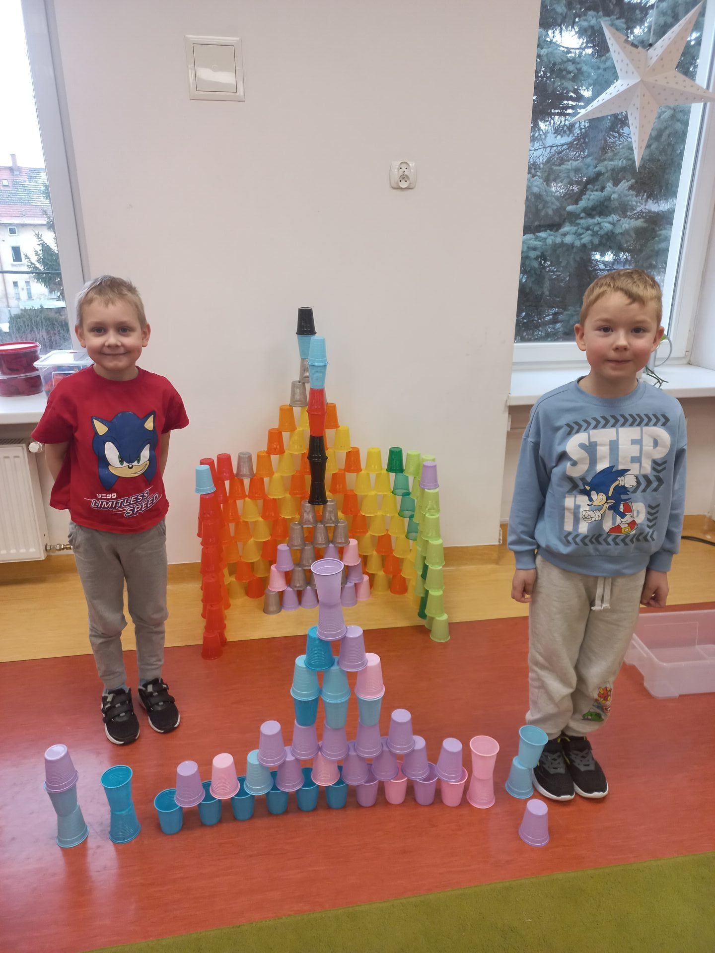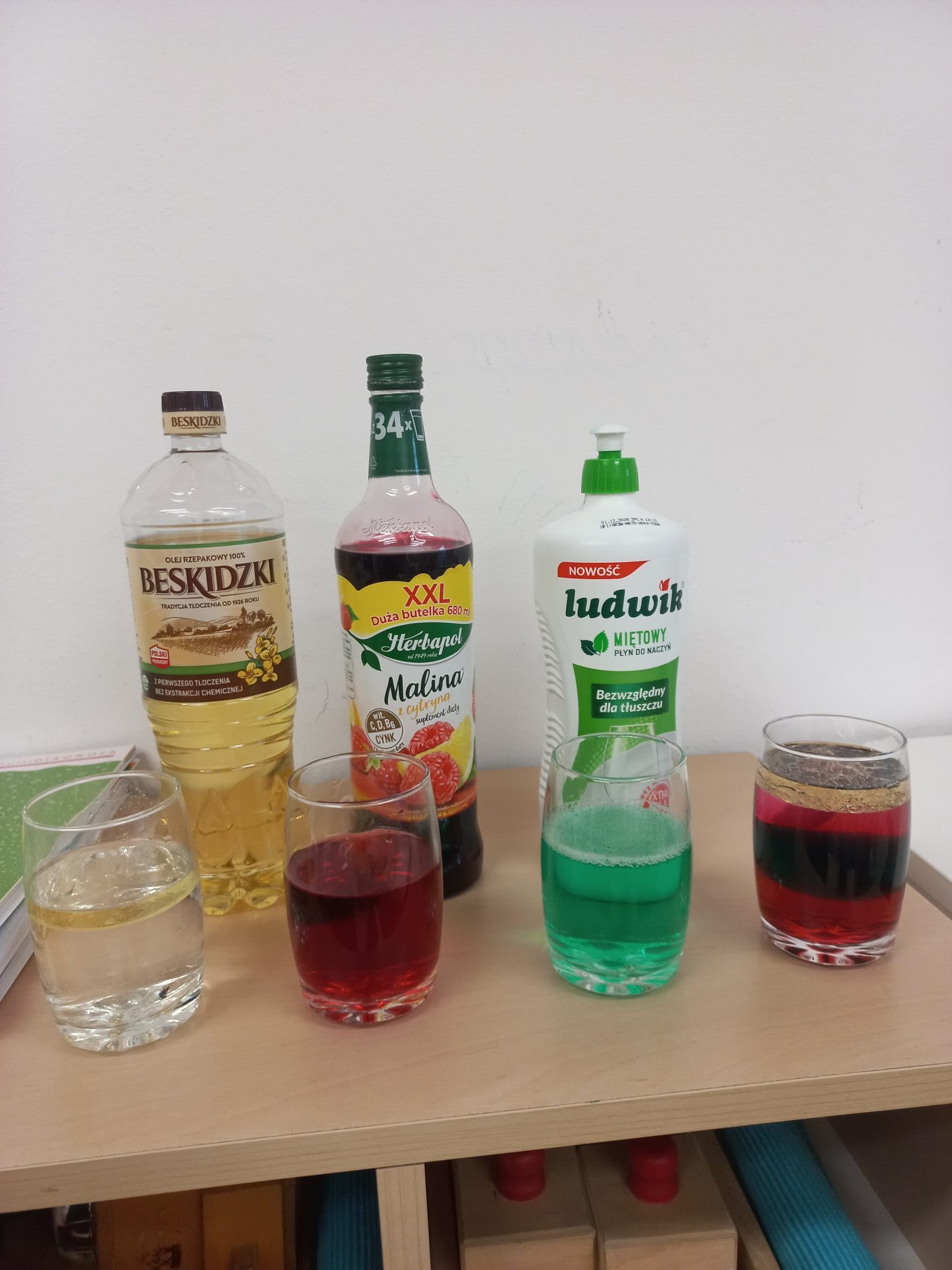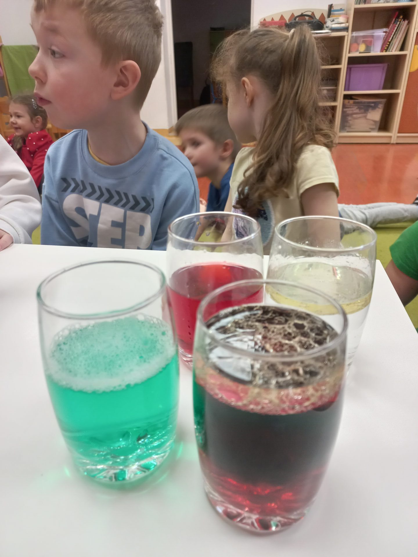 27.01.2026r. Dzieci z gr. Bławatki wzięły udział w zajęciach badawczych. Dzieci obserwowały doświadczenie z wodą i płynami (olejem, sokiem malinowym i płynem do naczyń). Przedszkolaki badały, które płyny połącza się wodą. Na koniec zajęć z wszystkich płynów wykonaliśmy kolorową warstwę. W zabawie dowolnej chłopcy zainspirowani kolorami płynów przygotowali wieżę z kolorowych kubków.