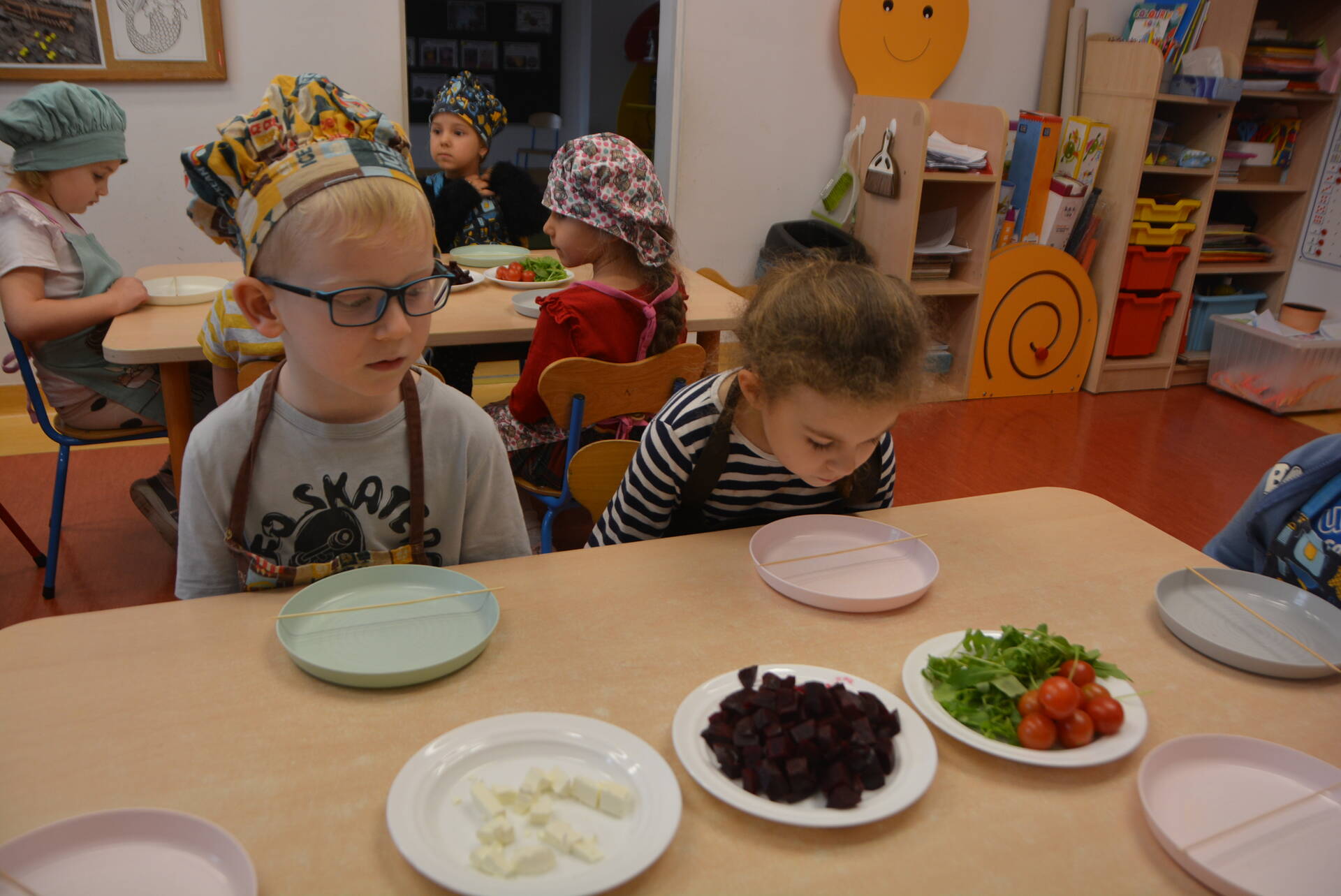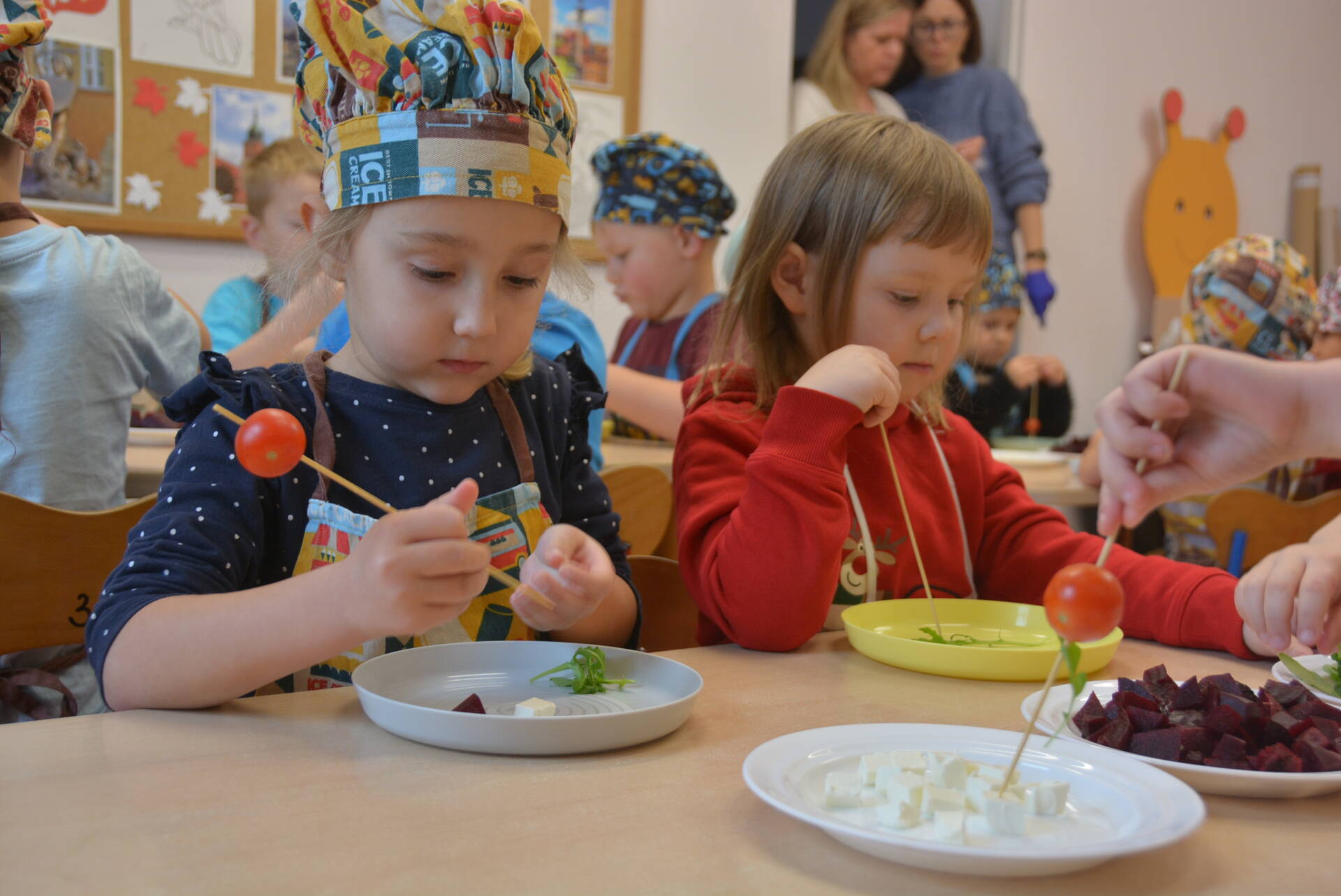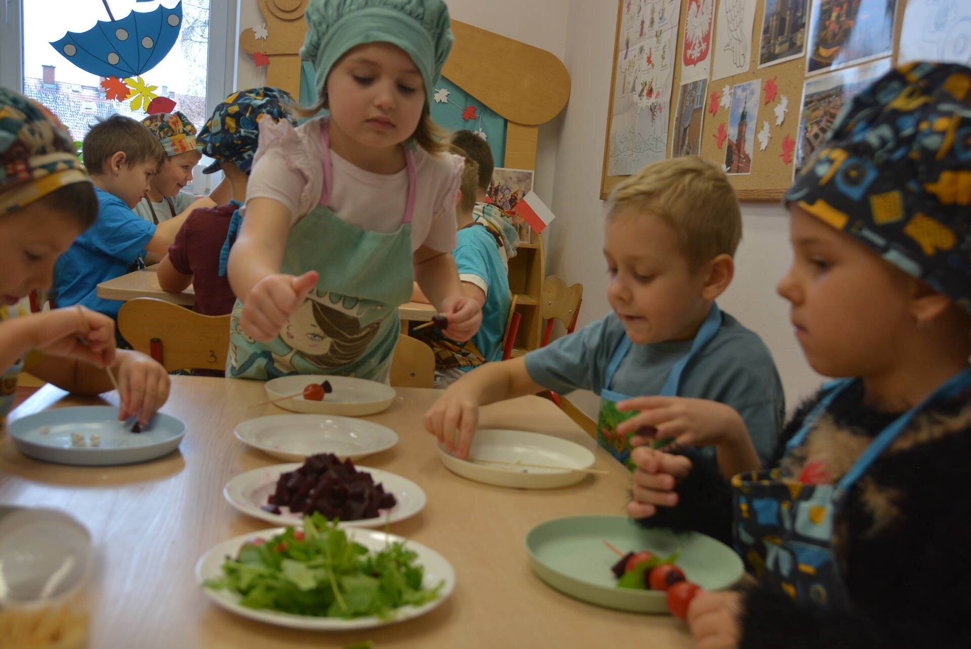 24 listopada – ten dzień Bławatki spędziły z burakiem czerwonym. Po zajęciach z panią Moniką o walorach odżywczych i wyglądzie buraka dzieci przystąpiły do komponowania zdrowych szaszłyków. Na patyczkach znalazły się kawałki buraka, sera, pomidorki i listki rukoli. Była to pyszna przekąska, zachęcająca do częstszego zjadania buraczka.