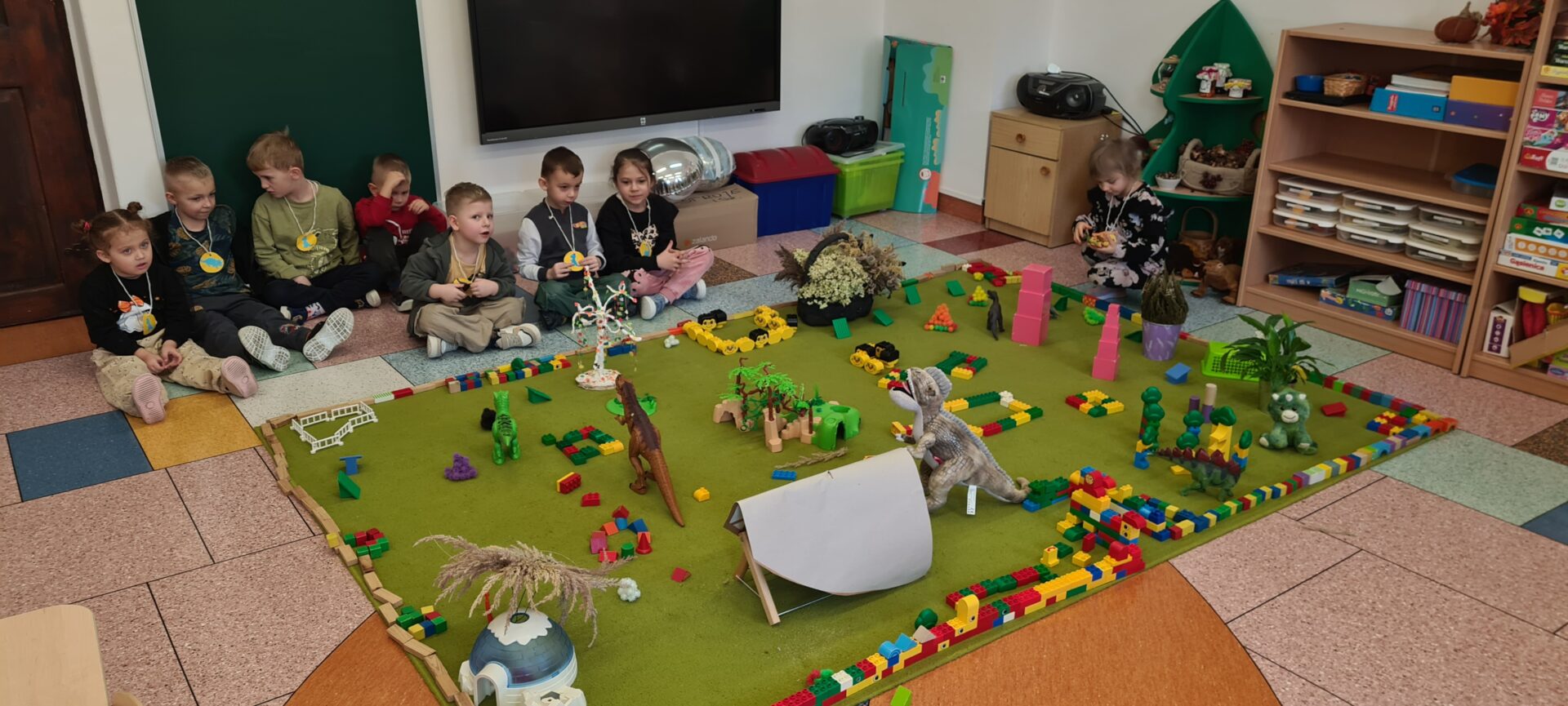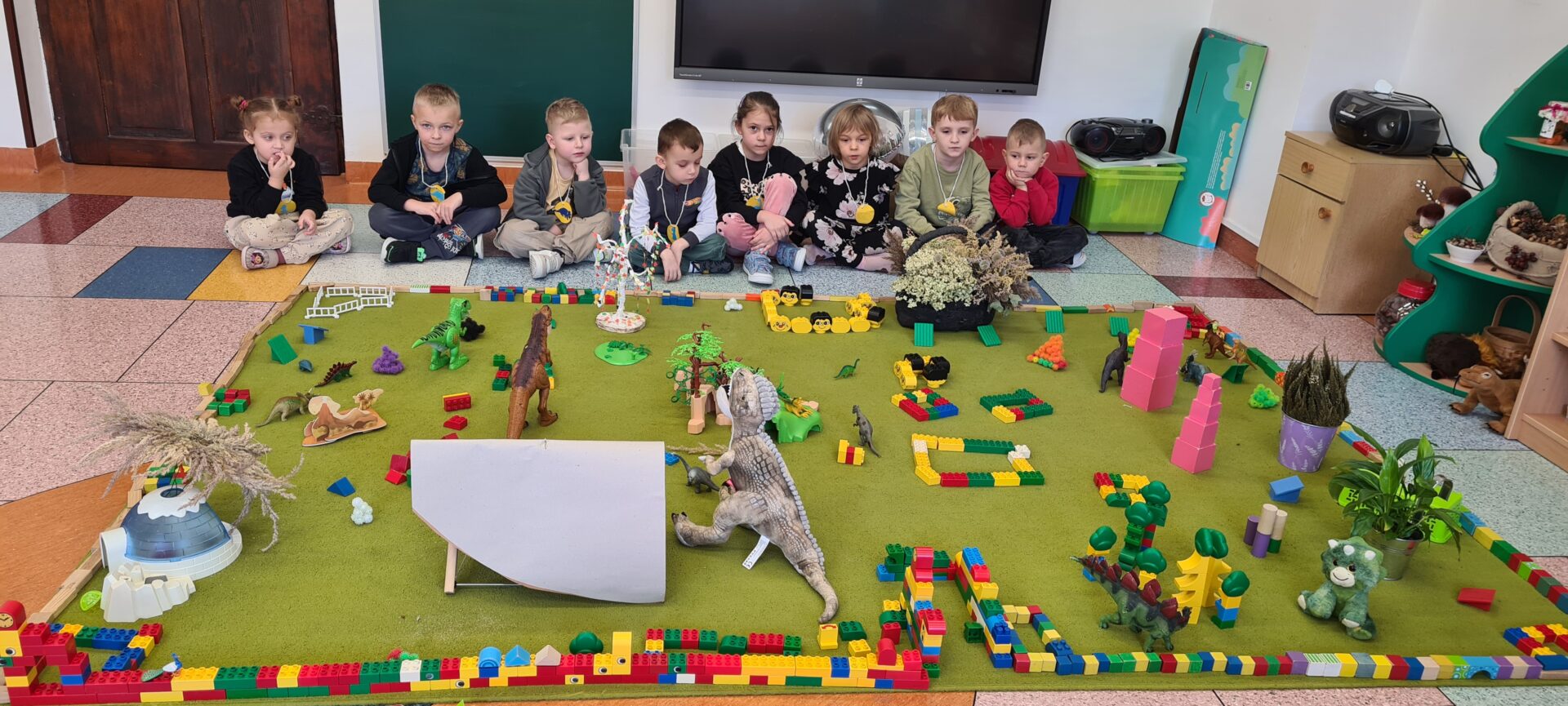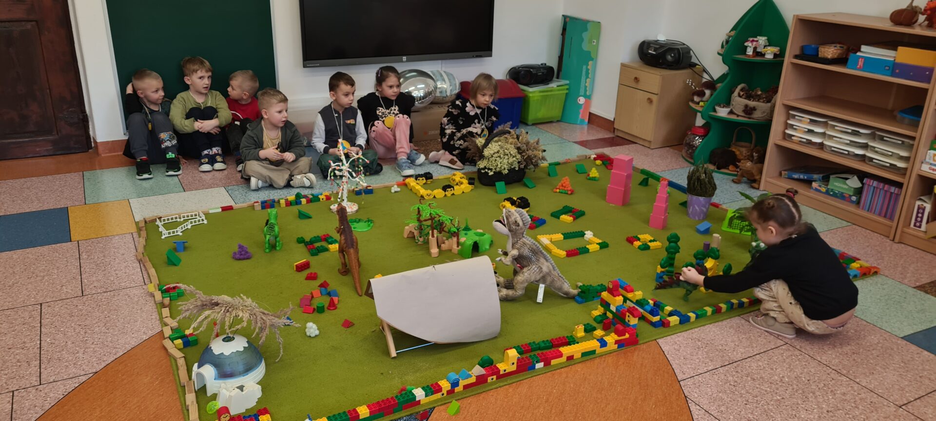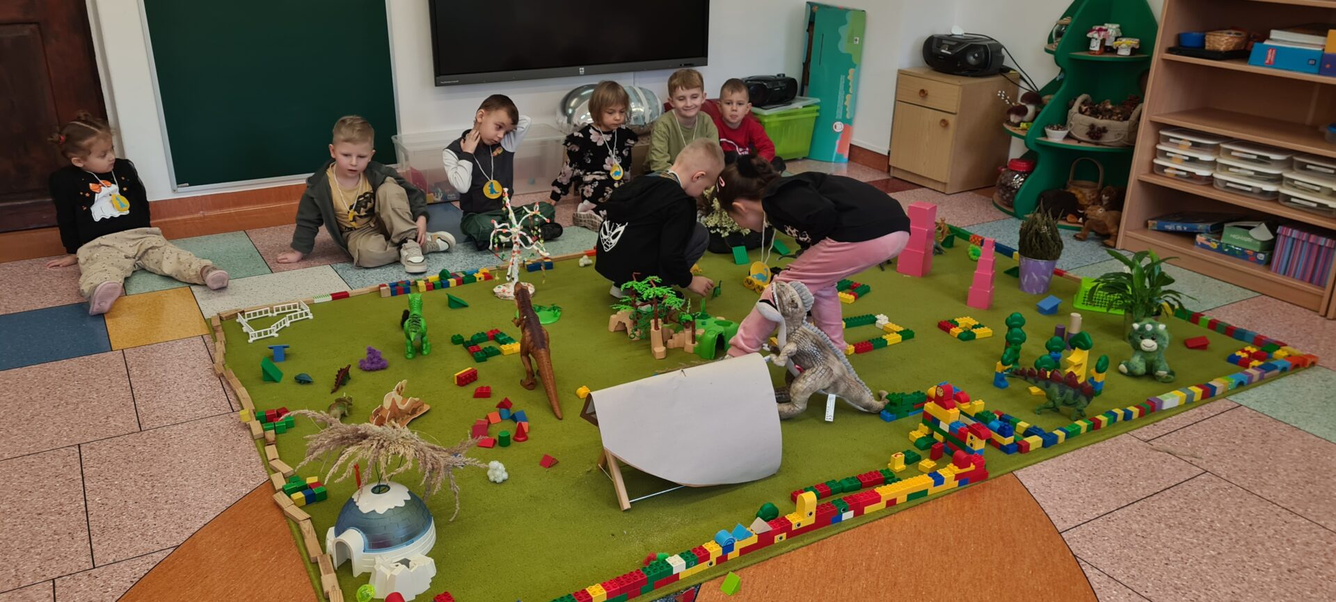 W ostatnich dniach lutego Bratki zdobywały informacje o dinozaurach i bawiły się zgromadzonymi w sali figurkami i przedmiotami, które mogły służyć do wykonania makiety „parku jurajskiego”. W sali zapanował nastrój prehistoryczny i troszkę groźny, ale zabawa była bardzo udana.