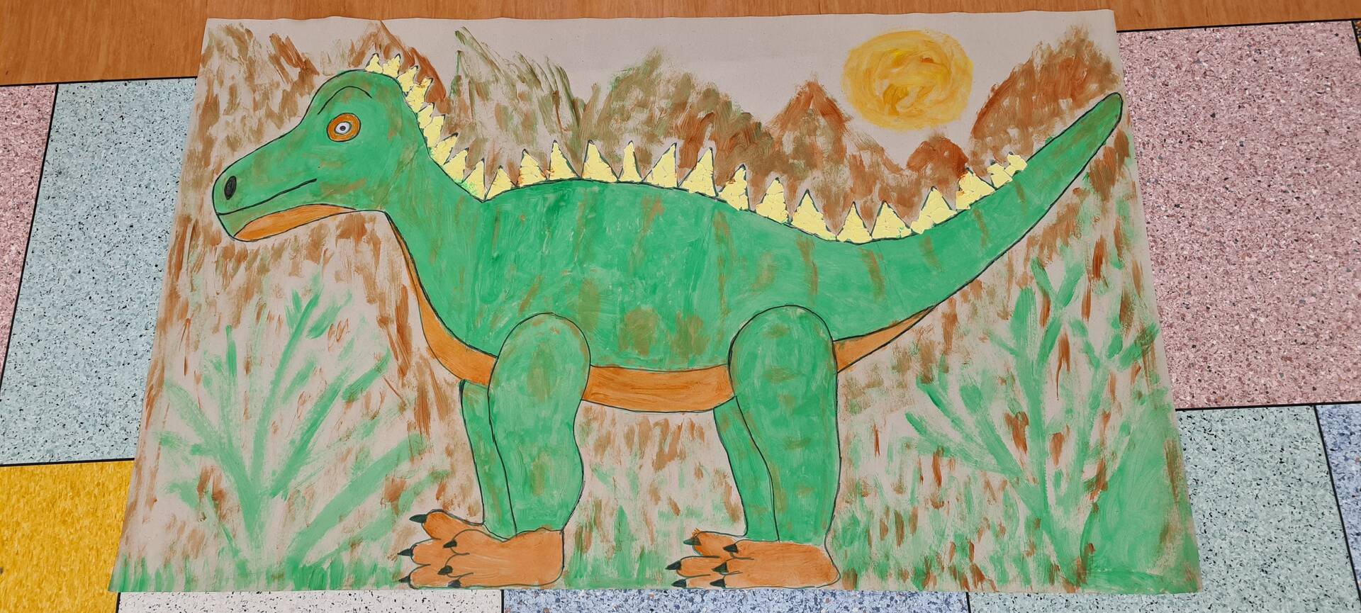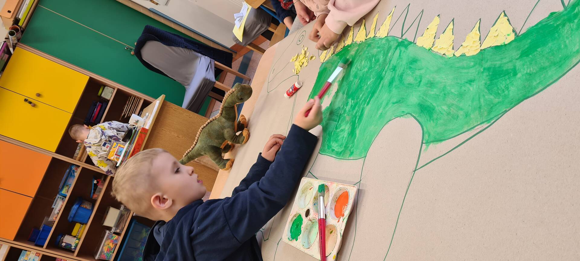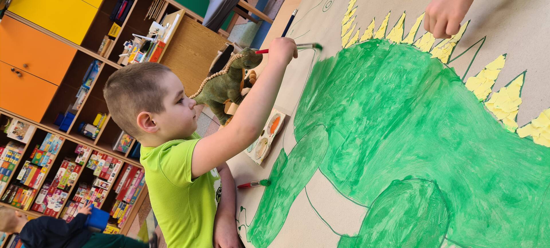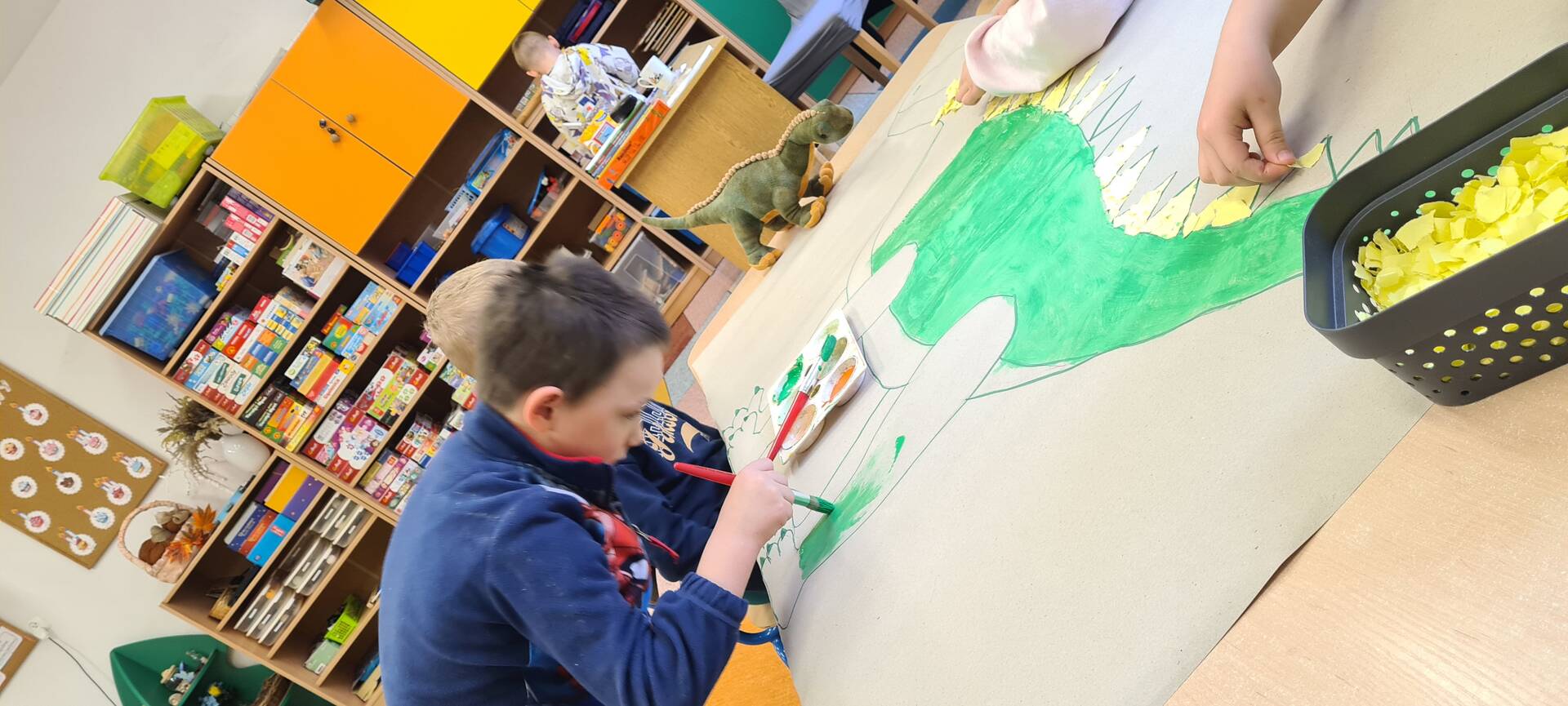 Ciekawostki z życia dinozaurów i zabawy związane z tematem poszerzyły wiedzę Bratków o przeszłości planety i zainspirowały do stworzenia pięknej pracy plastycznej. Oczywiście z dinozaurem w roli głównej!