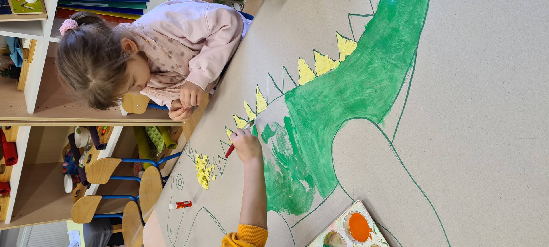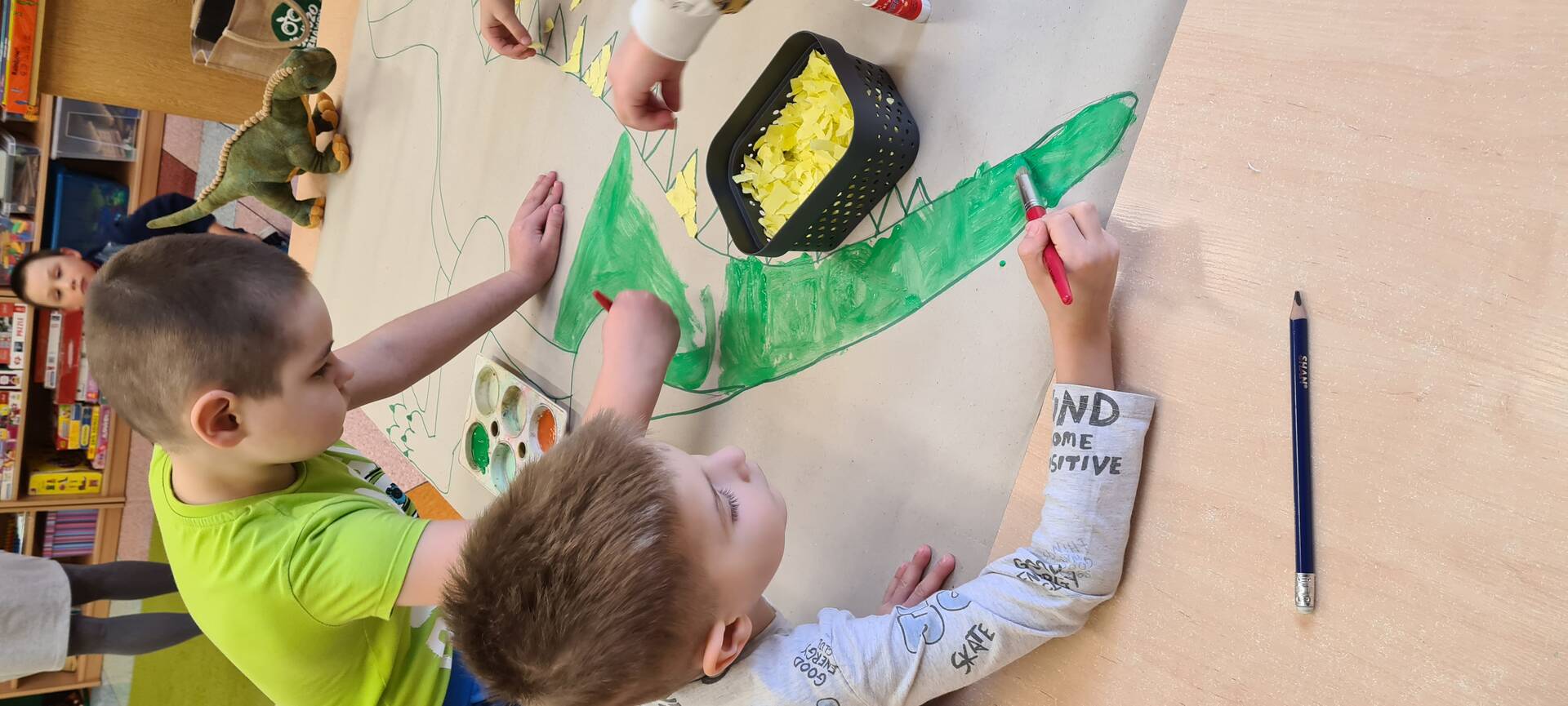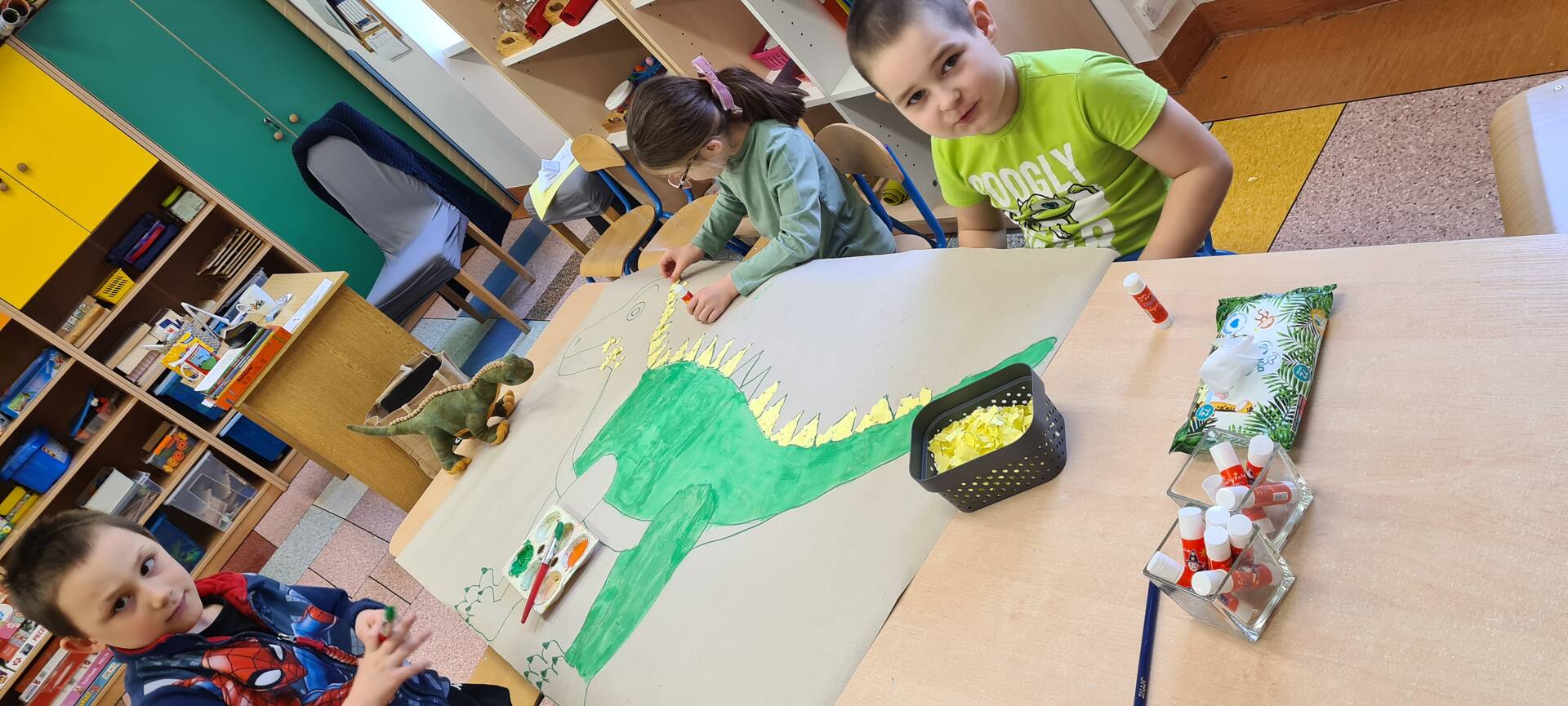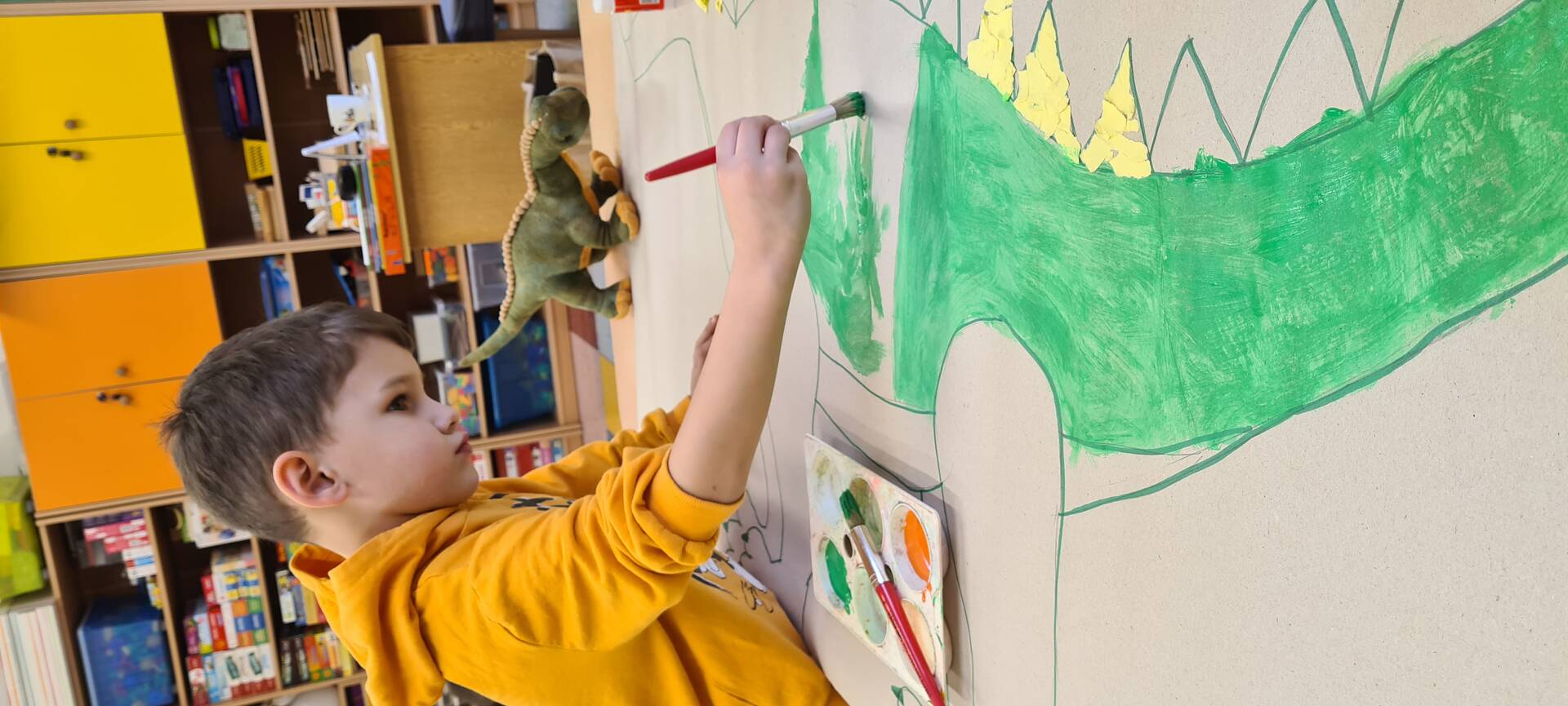 Ciekawostki z życia dinozaurów i zabawy związane z tematem poszerzyły wiedzę Bratków o przeszłości planety i zainspirowały do stworzenia pięknej pracy plastycznej. Oczywiście z dinozaurem w roli głównej!