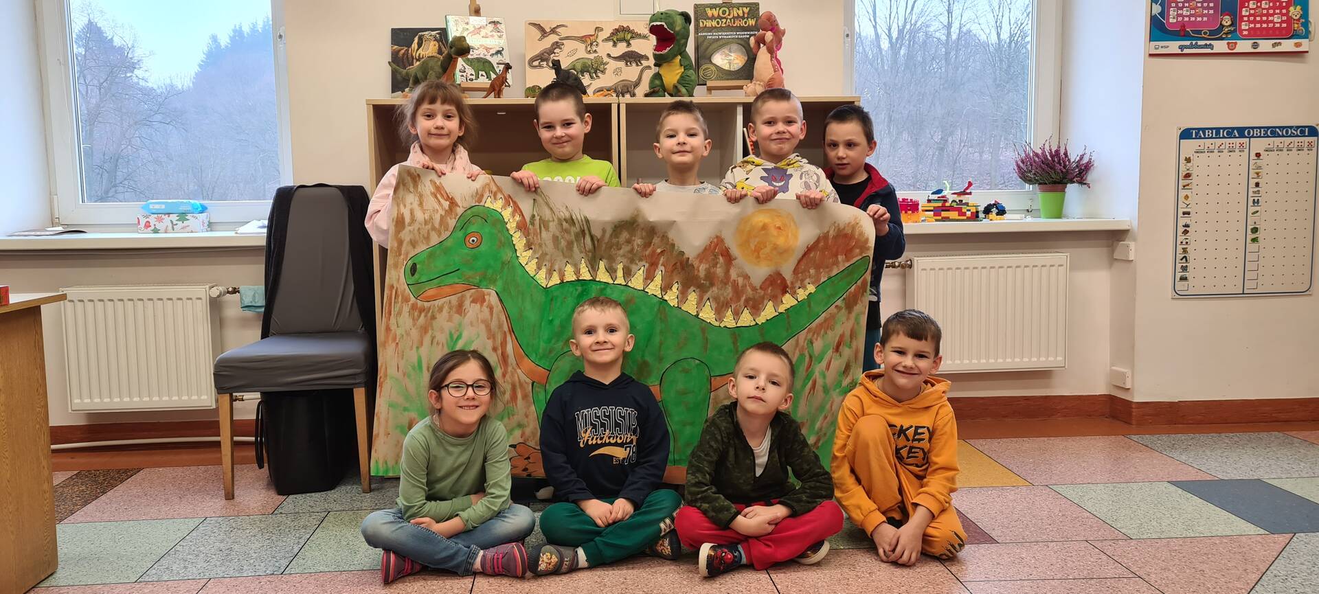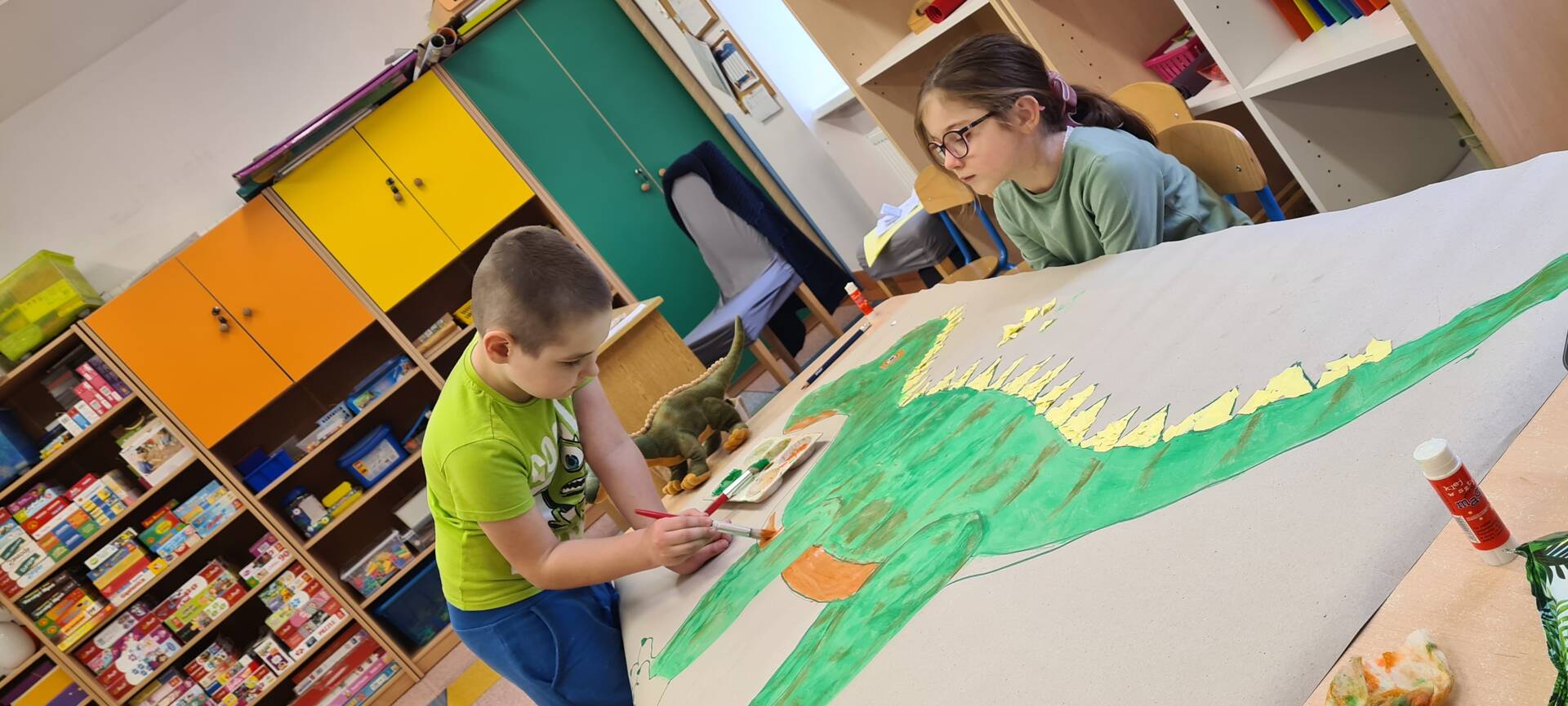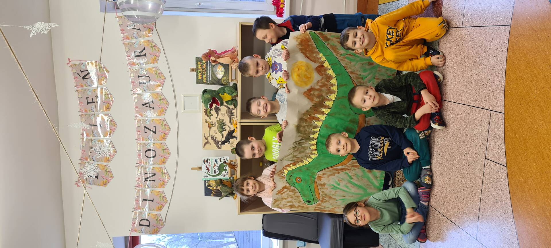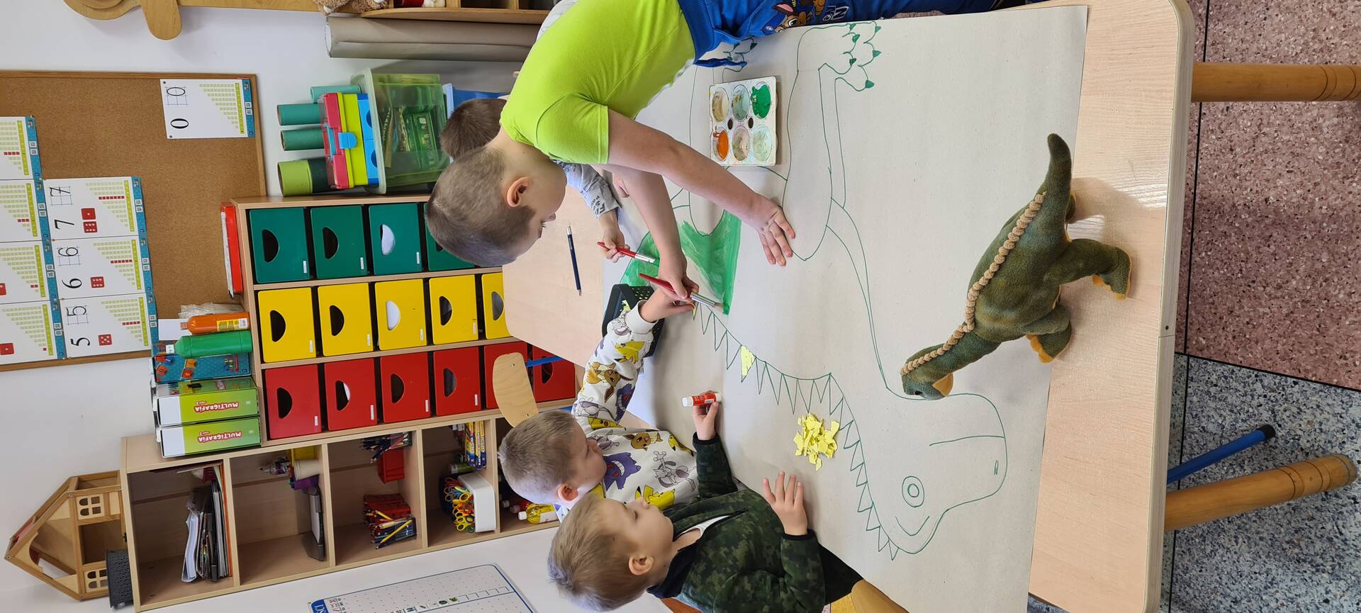 Ciekawostki z życia dinozaurów i zabawy związane z tematem poszerzyły wiedzę Bratków o przeszłości planety i zainspirowały do stworzenia pięknej pracy plastycznej. Oczywiście z dinozaurem w roli głównej!