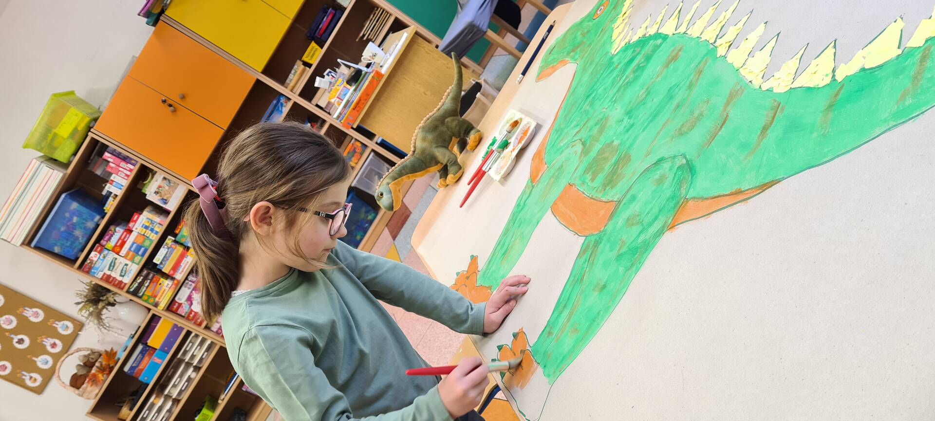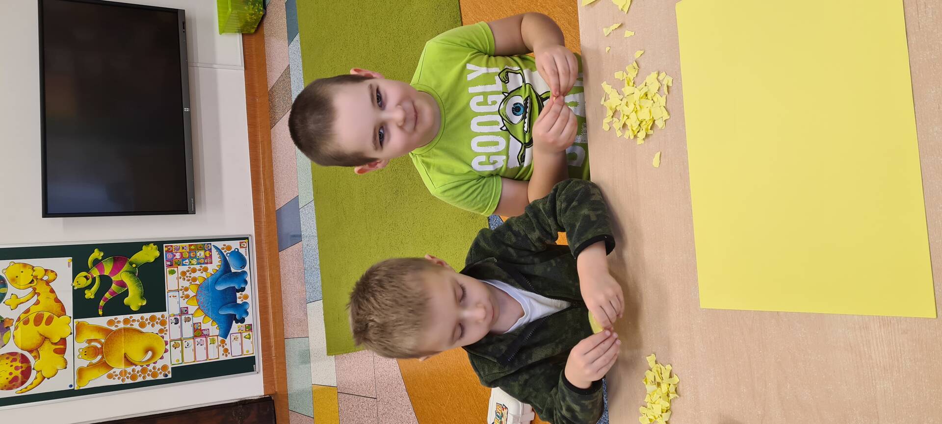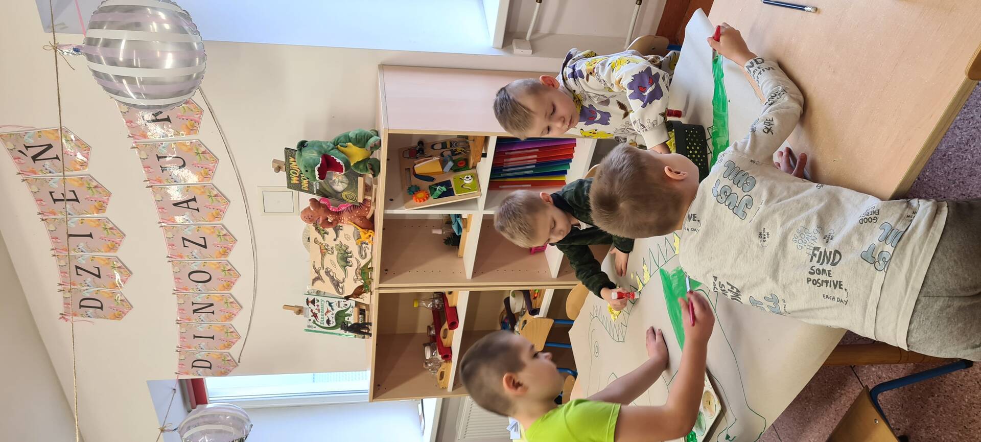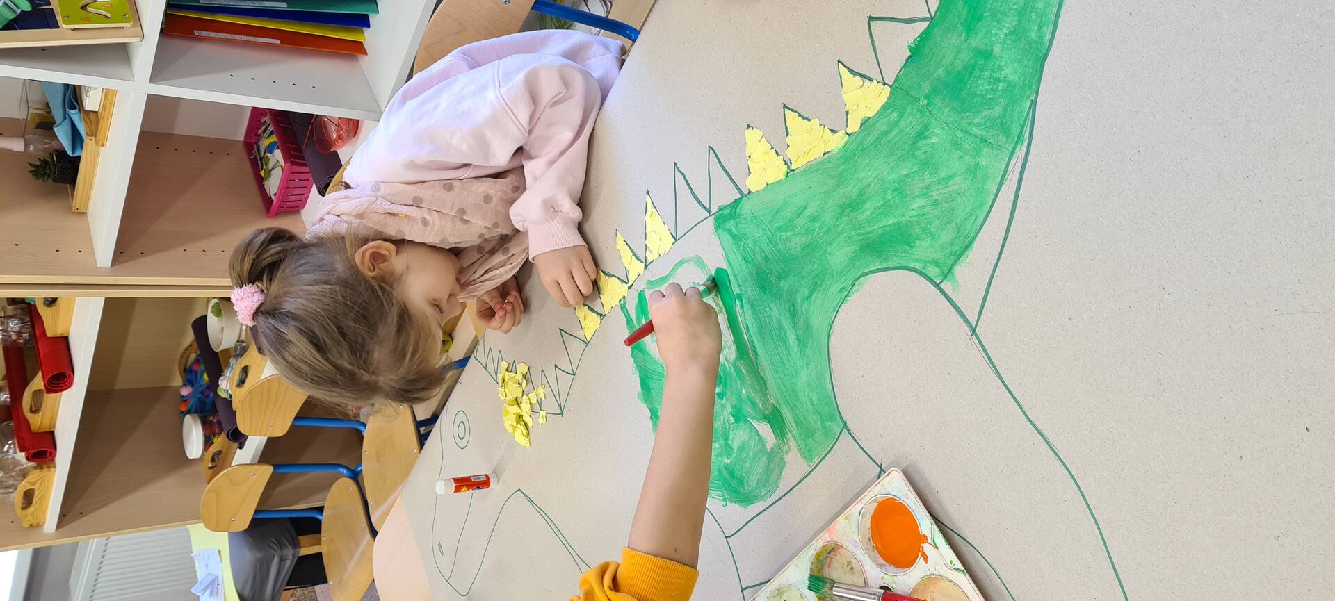 Ciekawostki z życia dinozaurów i zabawy związane z tematem poszerzyły wiedzę Bratków o przeszłości planety i zainspirowały do stworzenia pięknej pracy plastycznej. Oczywiście z dinozaurem w roli głównej!