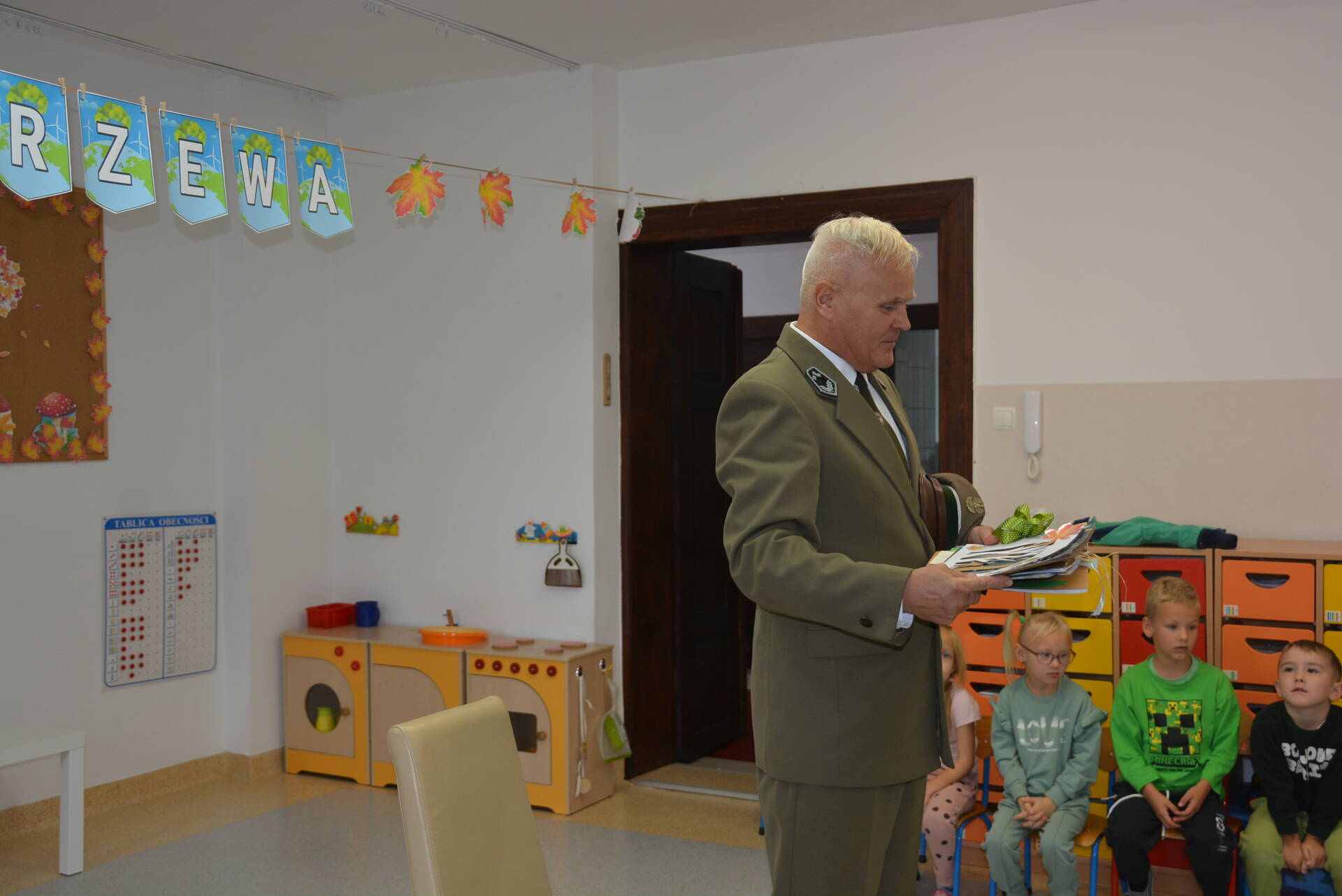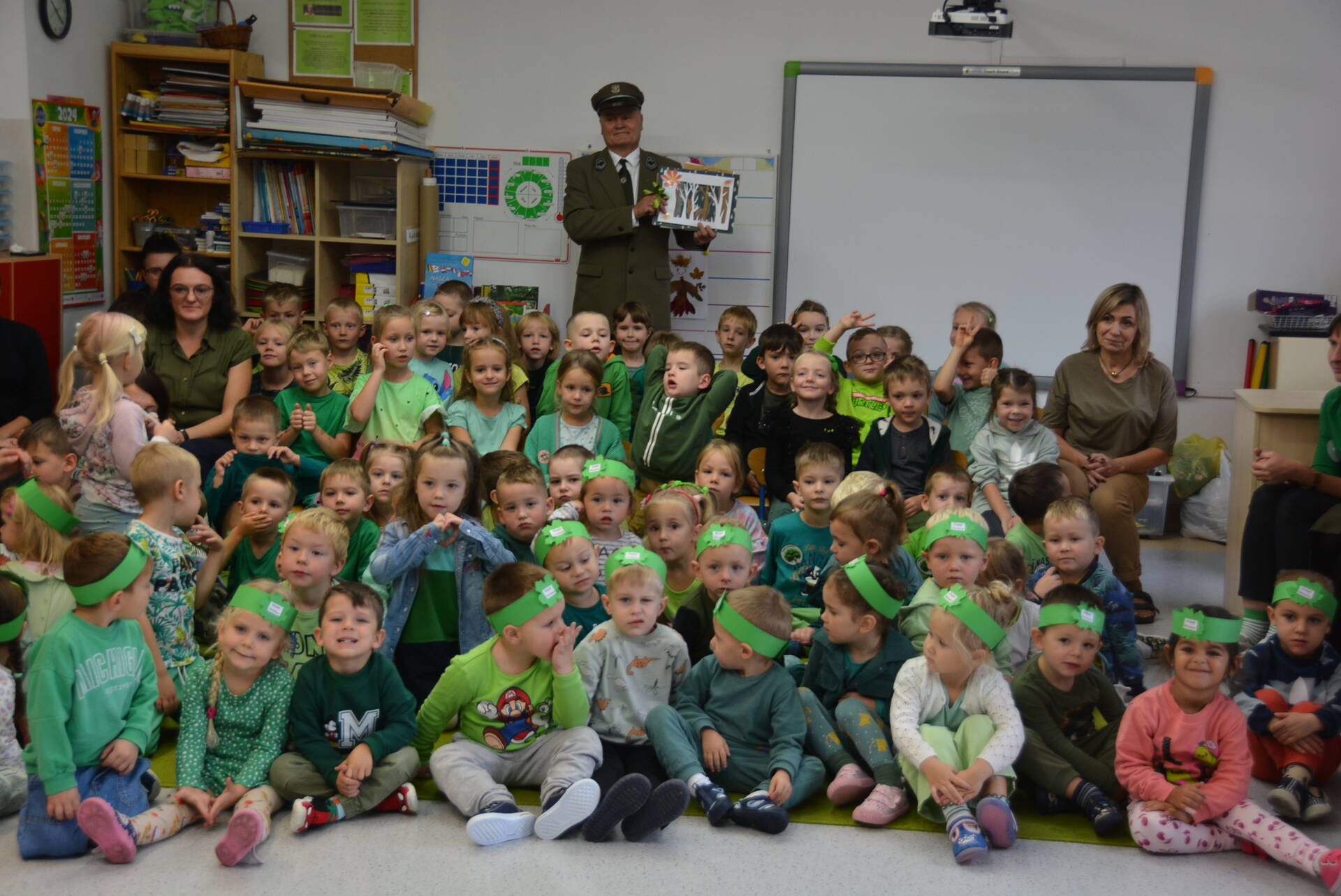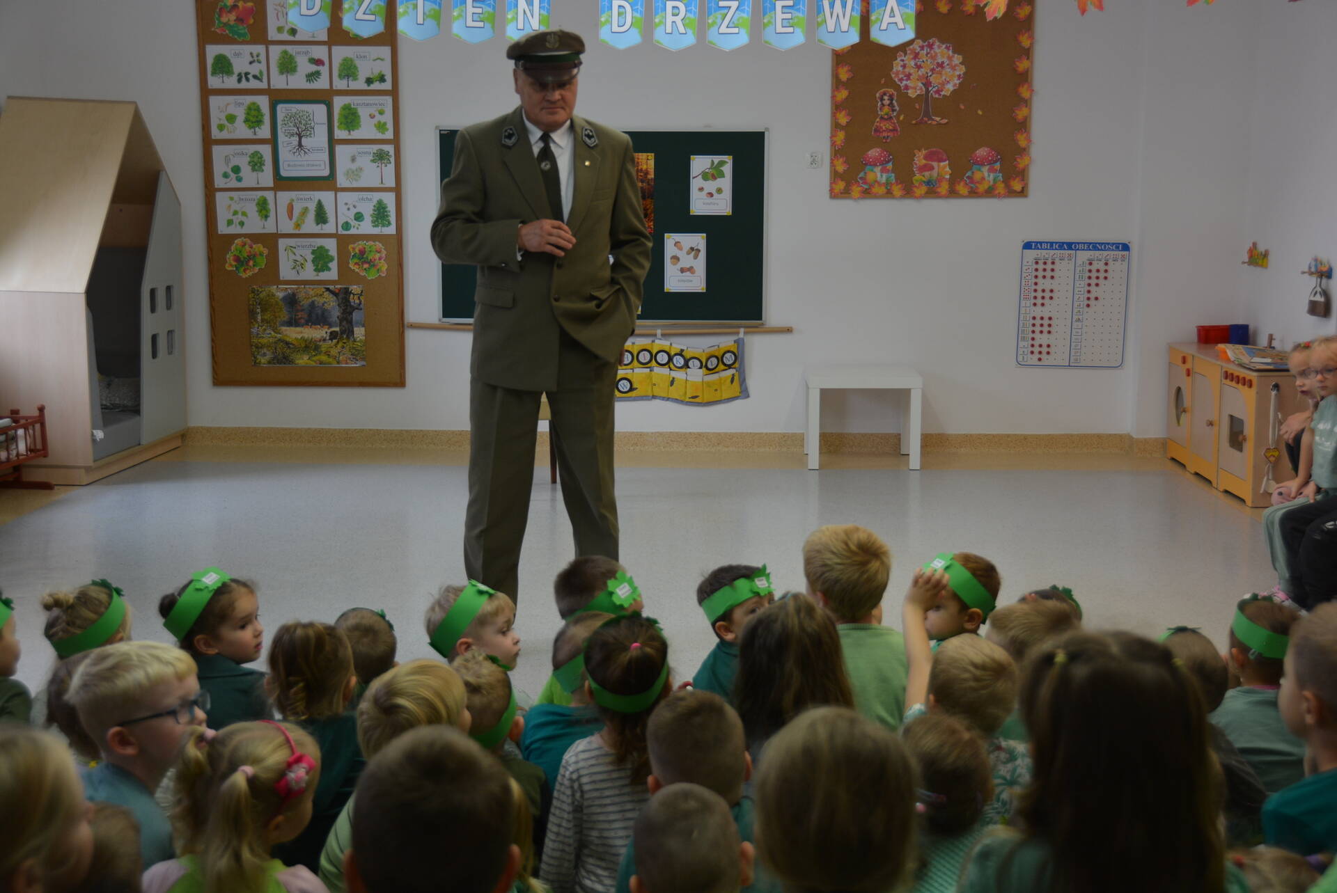 9 października wszystkie przedszkolaki spotkały się z leśniczym Leśnictwa Unisław Śląski, Zbigniewem Molskim, z okazji Światowego Dnia Drzewa. Uczymy dzieci cenić i chronić te nadzwyczajne rośliny, a rozmowa z pracownikiem Lasów Państwowych na pewno w tym pomaga. Miejmy nadzieję, że wśród naszych przedszkolaków znajdzie się ten jeden lub jedna, dla którego przyroda i las staną się pasją i zawodem, tak jak dla naszego szanownego gościa.