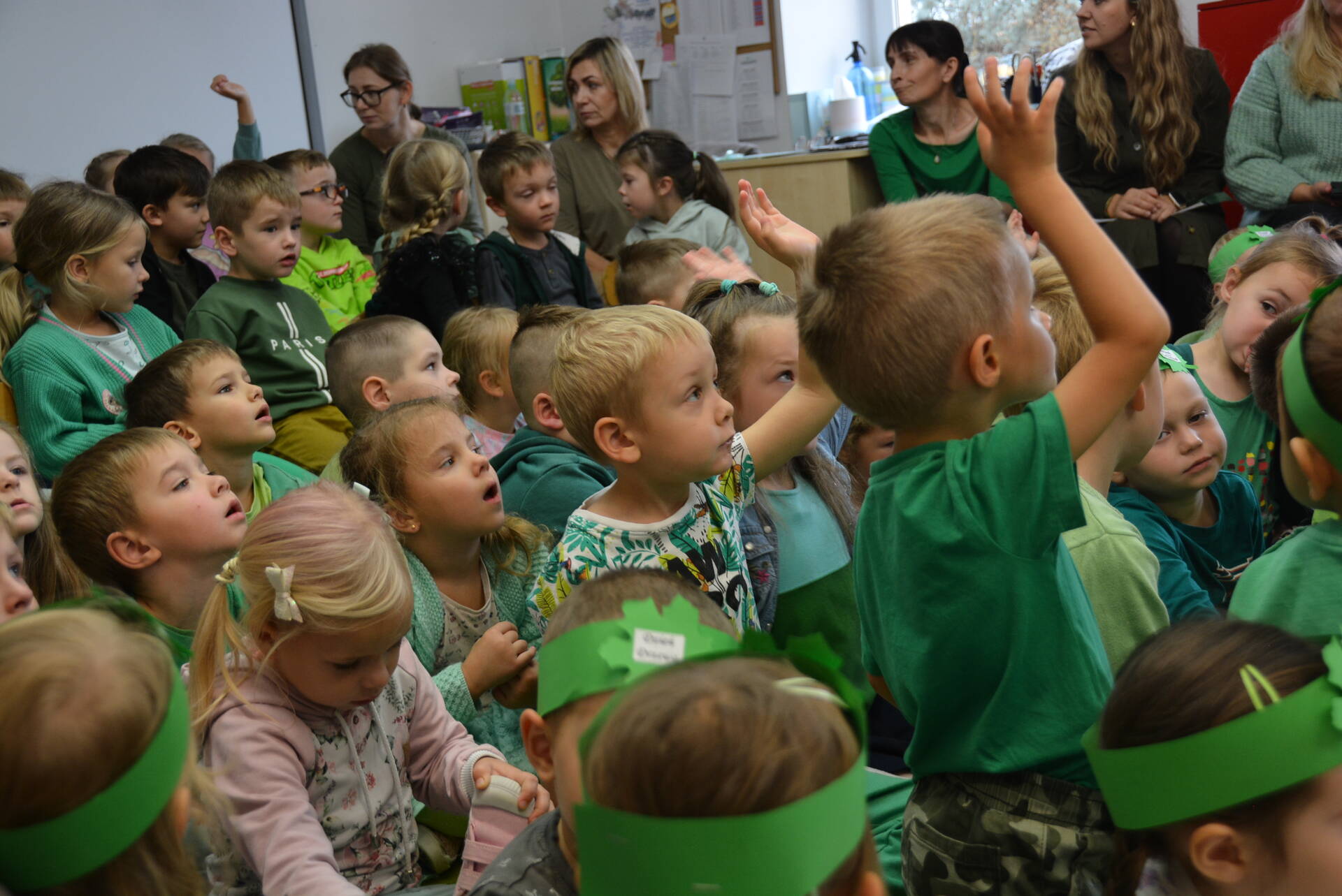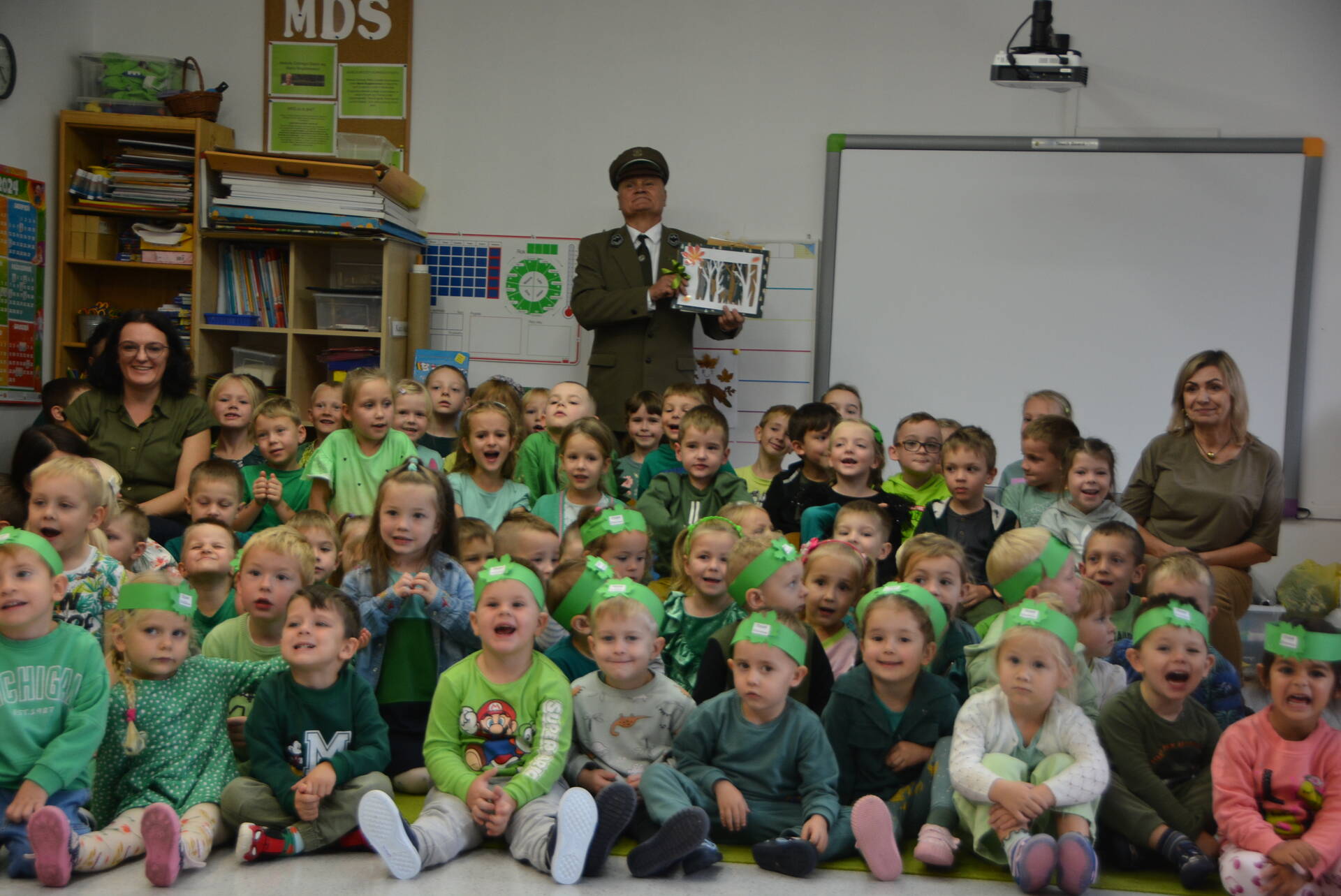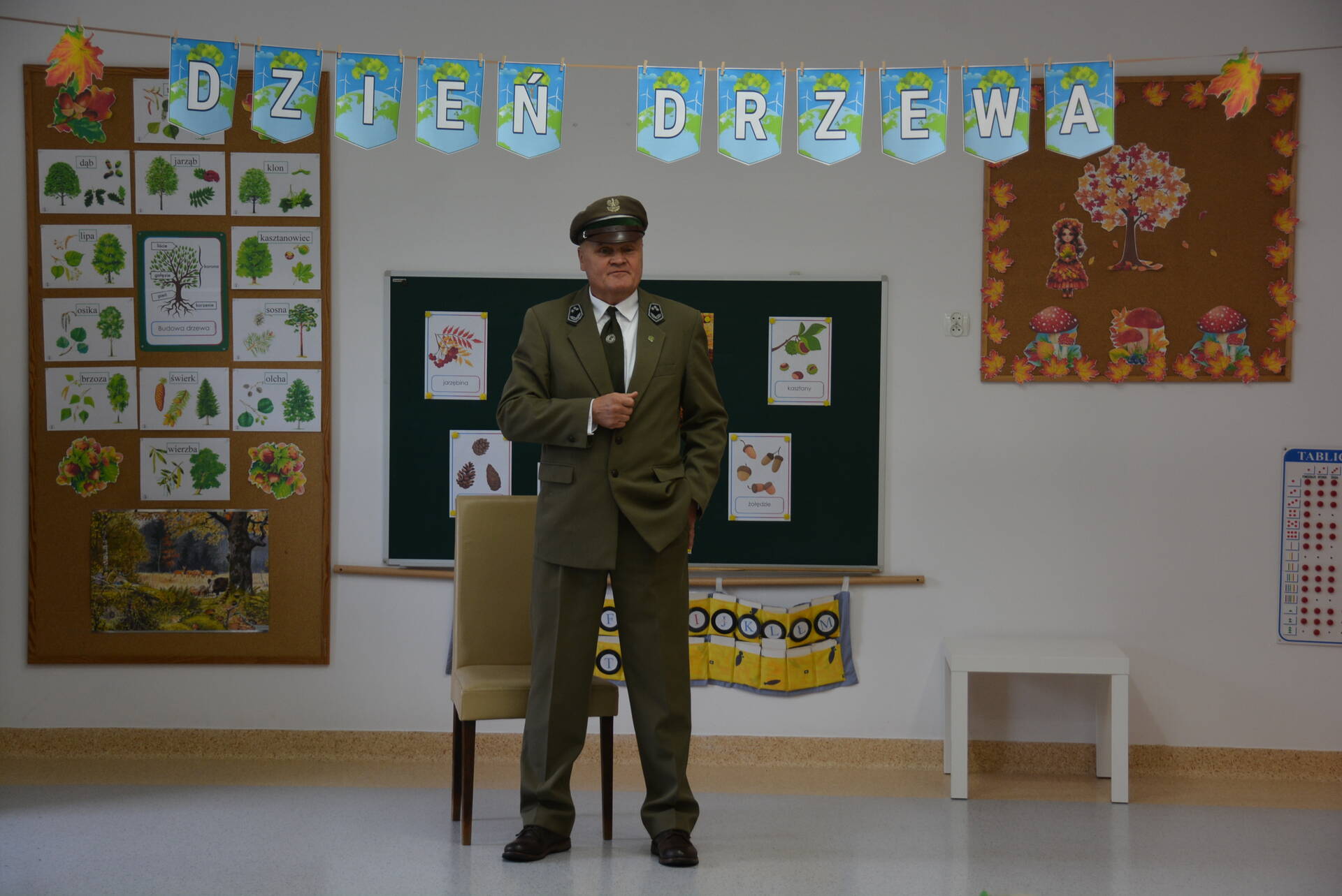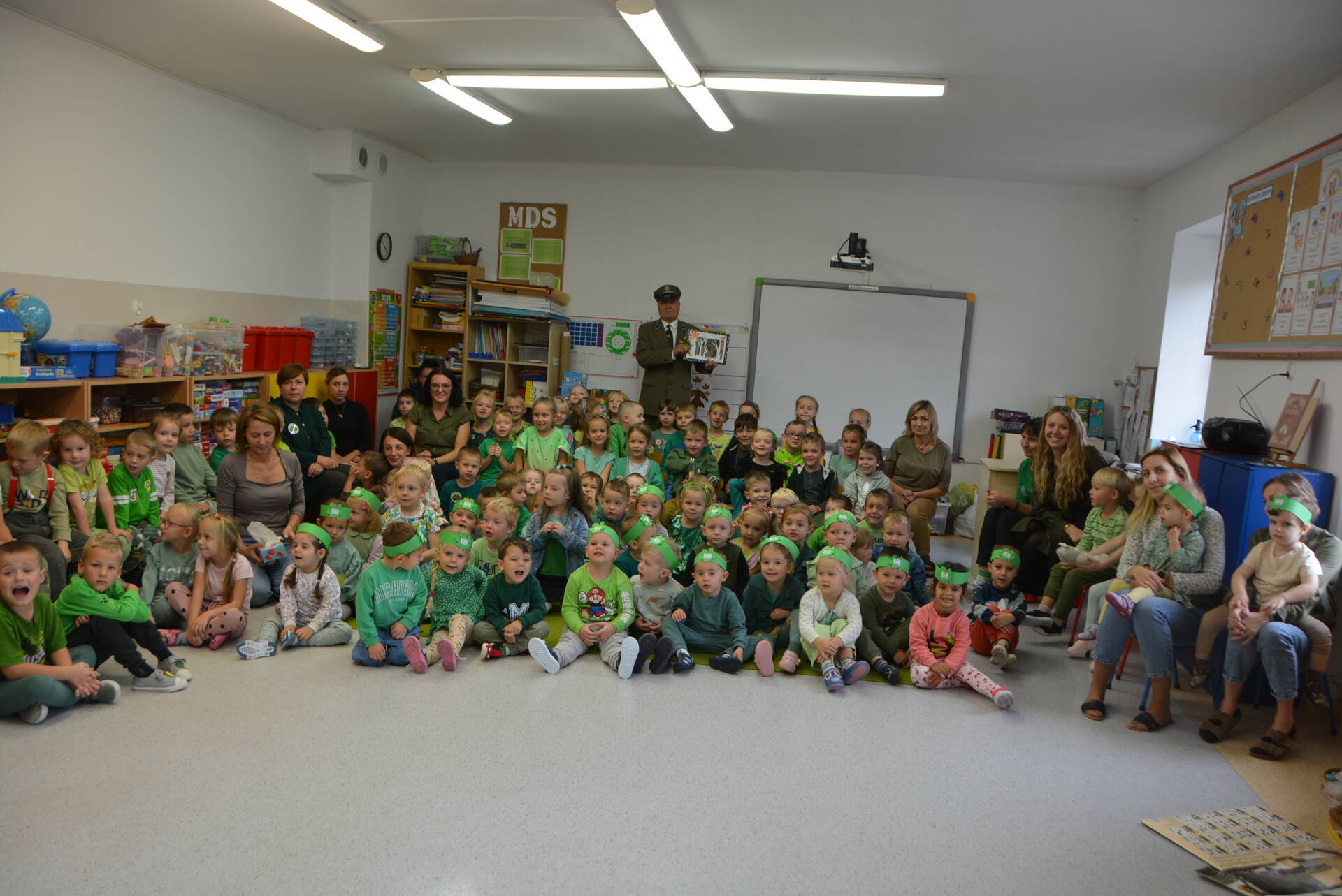 9 października wszystkie przedszkolaki spotkały się z leśniczym Leśnictwa Unisław Śląski, Zbigniewem Molskim, z okazji Światowego Dnia Drzewa. Uczymy dzieci cenić i chronić te nadzwyczajne rośliny, a rozmowa z pracownikiem Lasów Państwowych na pewno w tym pomaga. Miejmy nadzieję, że wśród naszych przedszkolaków znajdzie się ten jeden lub jedna, dla którego przyroda i las staną się pasją i zawodem, tak jak dla naszego szanownego gościa.