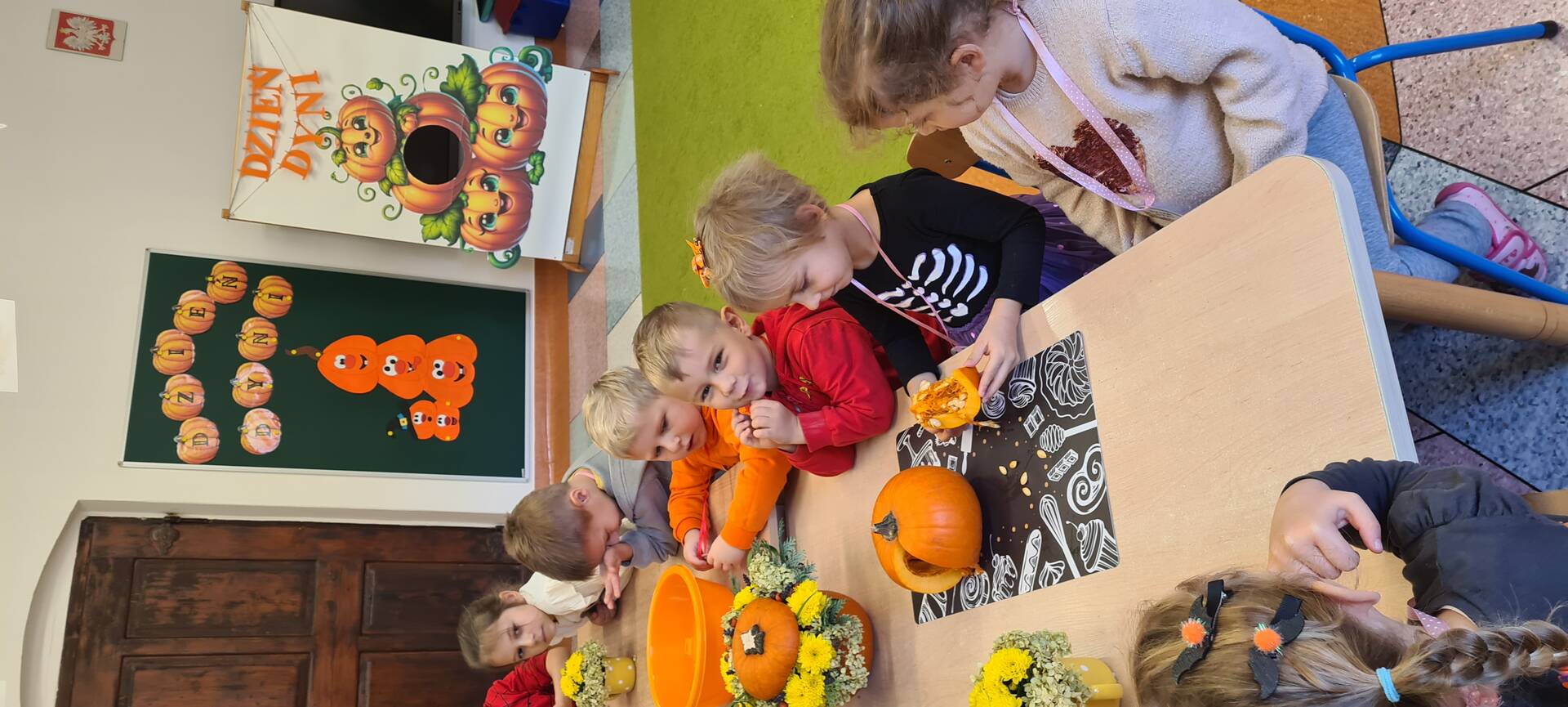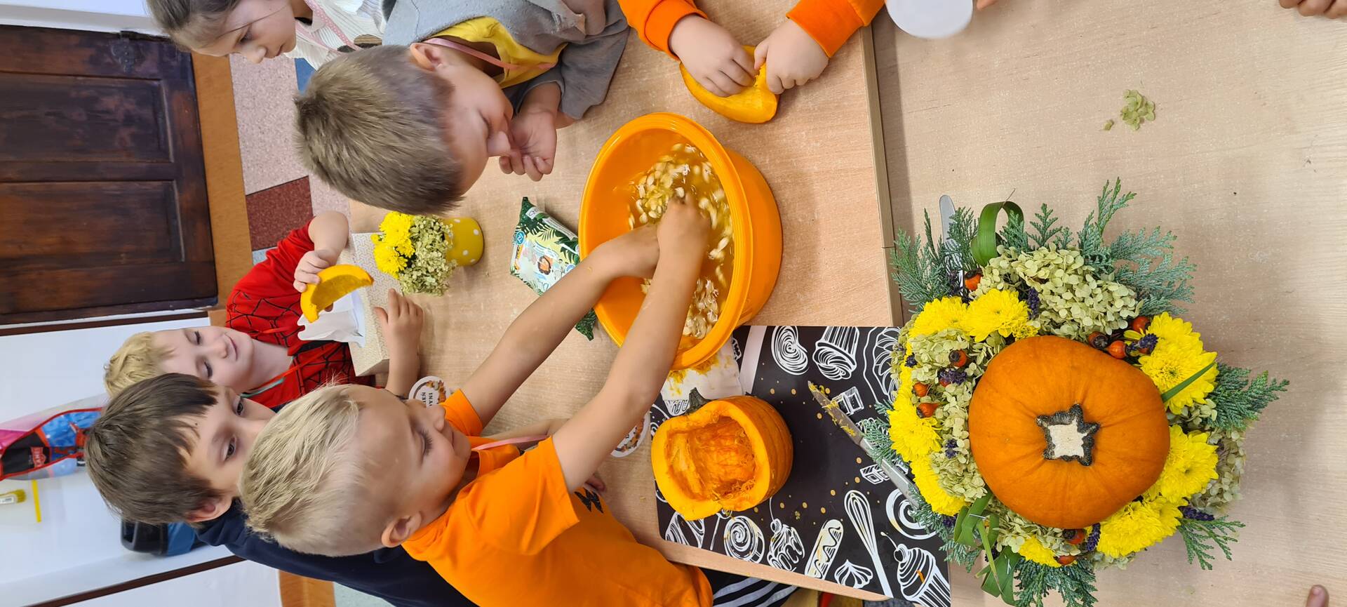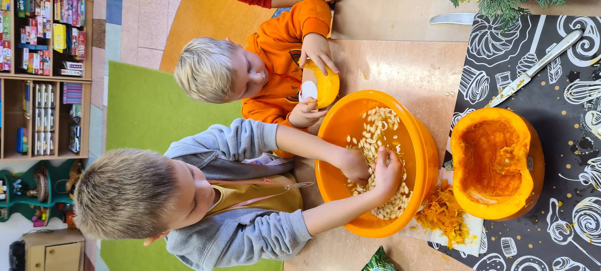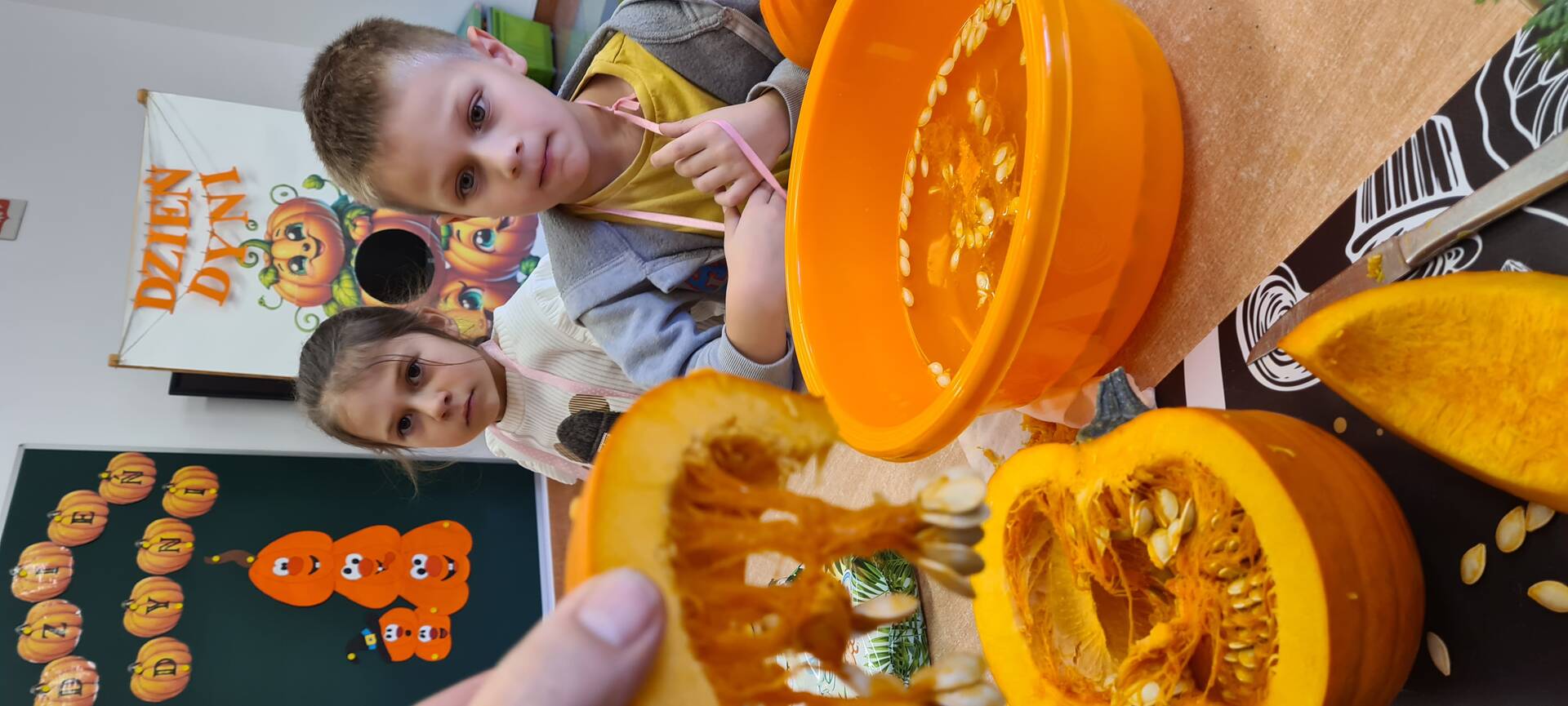 31 października dzieci z grupy Bratków zaprzyjaźniły się z dynią. Wartościowe pomarańczowe warzywo poznały od zewnątrz i od środka, podziwiając grubą, twardą powłokę i prowadząc zabawy badawcze. Dzieci drążyły miąższ, wyciągały i myły pestki, wdychały aromat dyni. Okazało się, że dynia to nie tylko pożywienie – może być także ozdobą czy wazonikiem. Jest również bardzo fotogeniczna i sprawdza się w przedszkolnej foto-budce. Dzień dyni u Bratków to naprawdę początek wspaniałej przyjaźni!