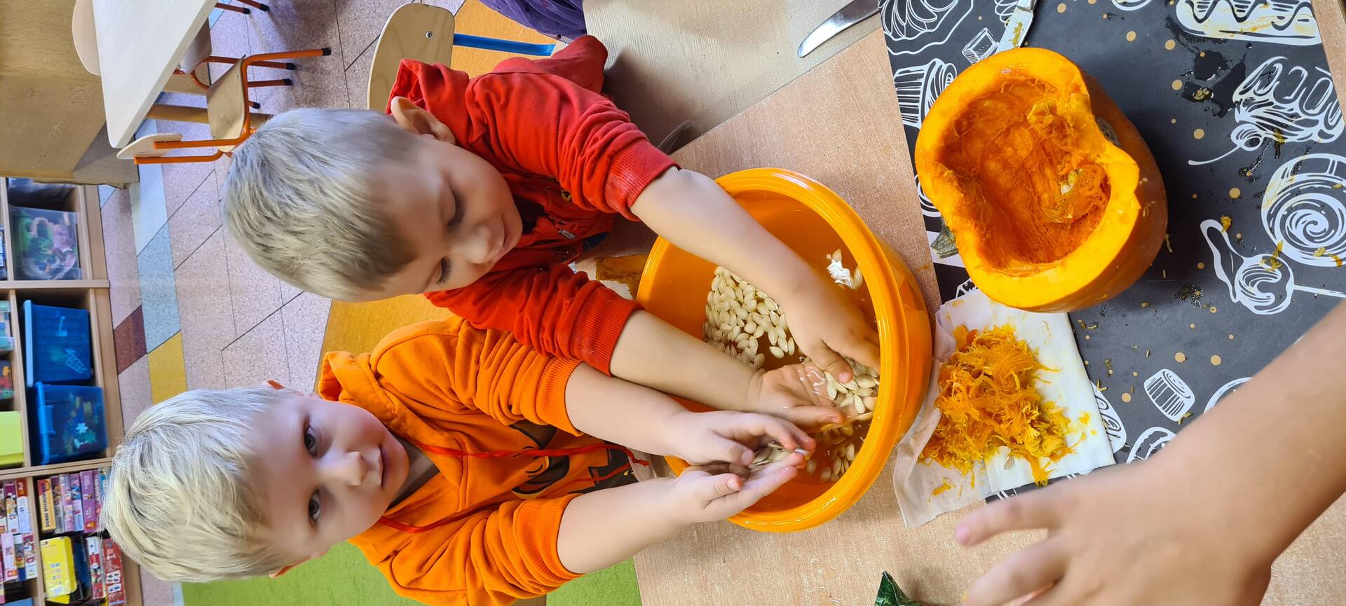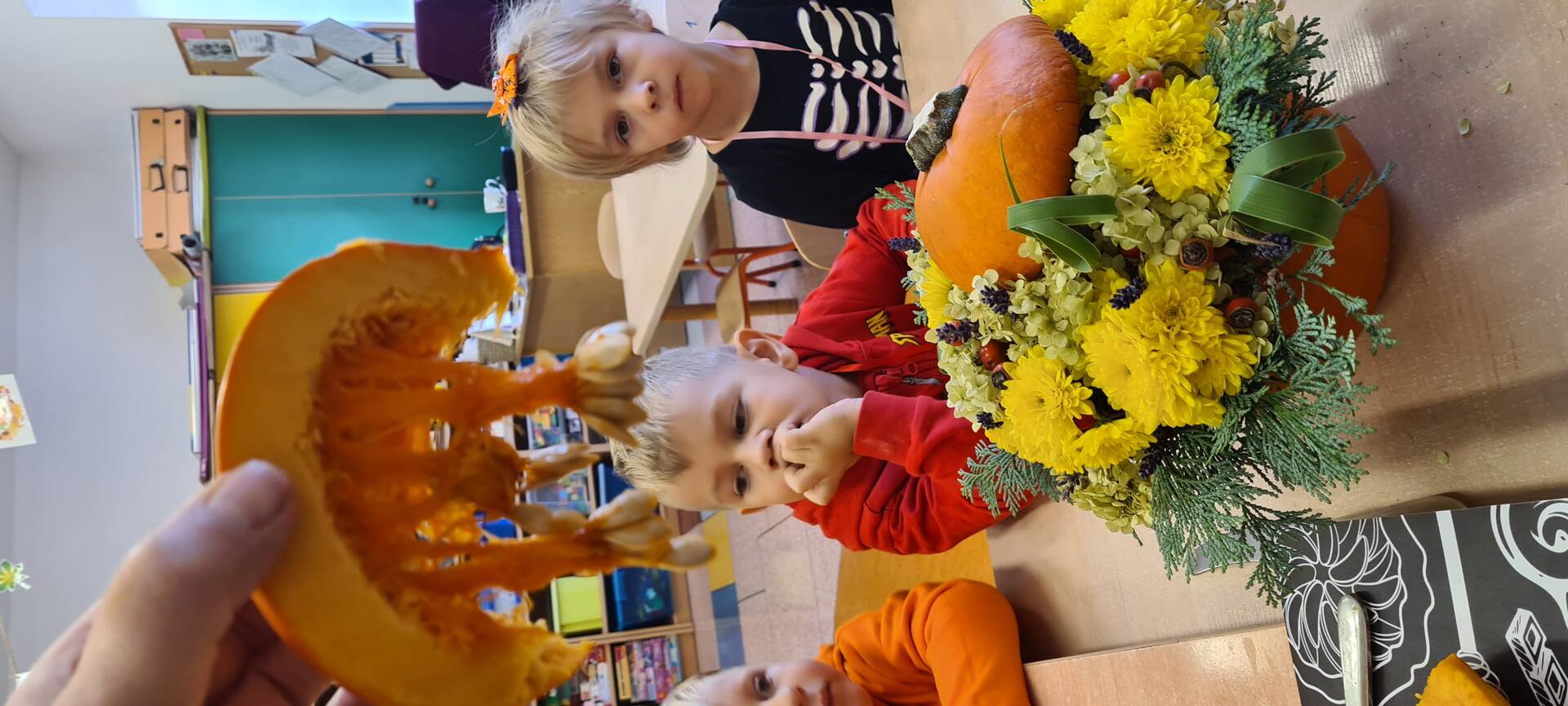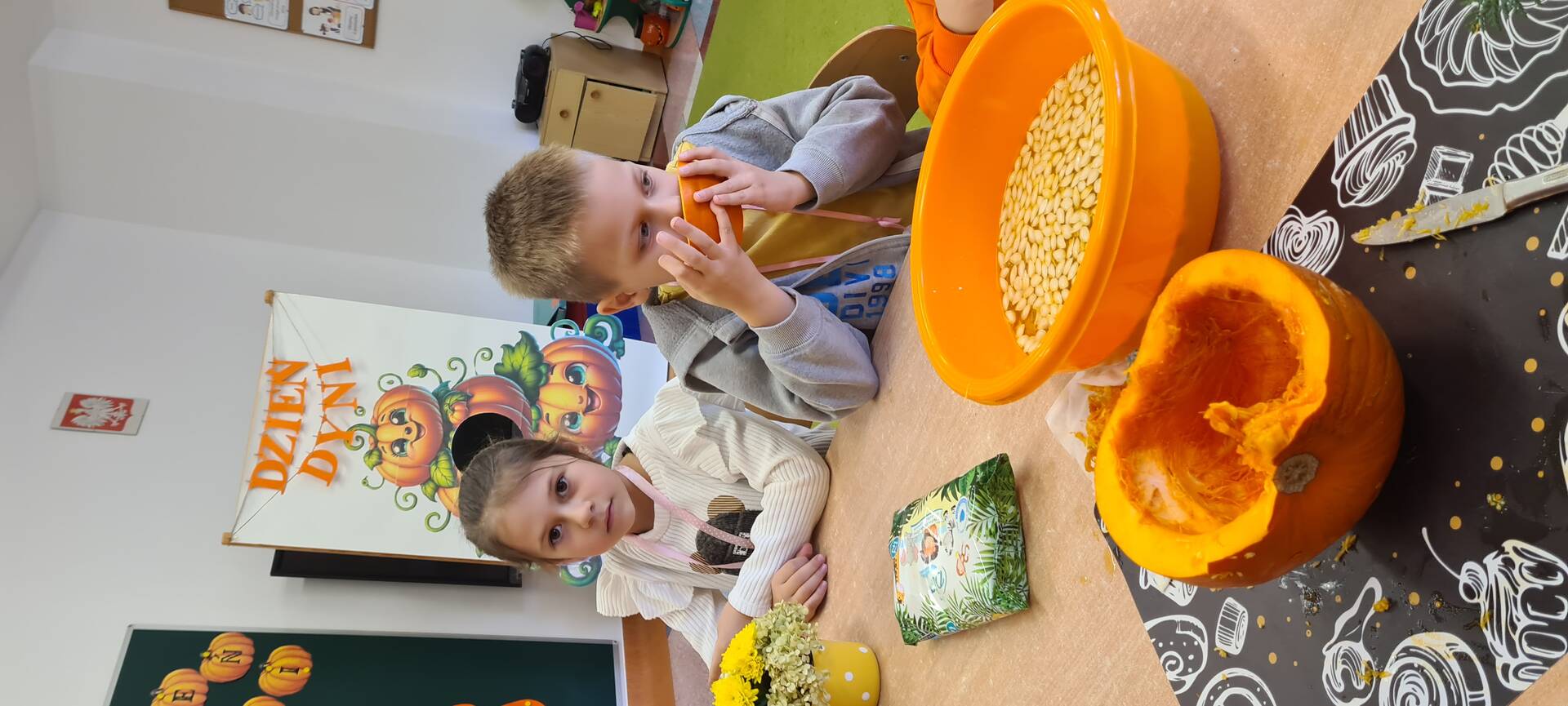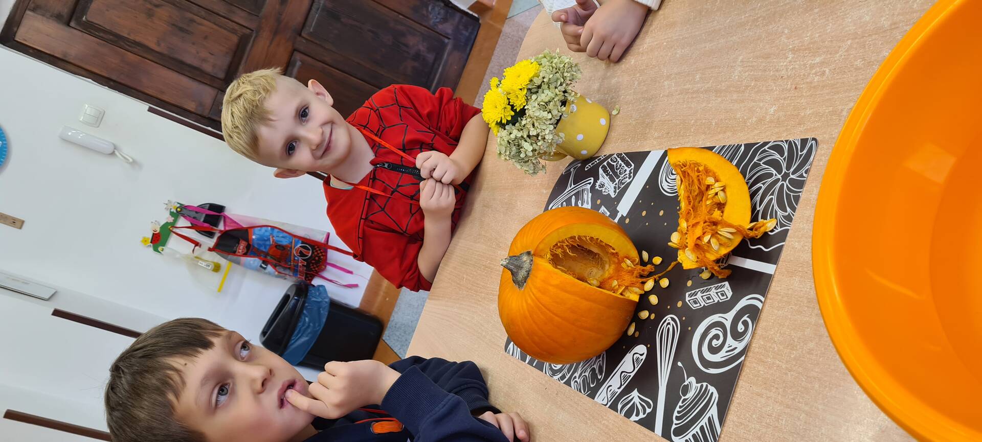 31 października dzieci z grupy Bratków zaprzyjaźniły się z dynią. Wartościowe pomarańczowe warzywo poznały od zewnątrz i od środka, podziwiając grubą, twardą powłokę i prowadząc zabawy badawcze. Dzieci drążyły miąższ, wyciągały i myły pestki, wdychały aromat dyni. Okazało się, że dynia to nie tylko pożywienie – może być także ozdobą czy wazonikiem. Jest również bardzo fotogeniczna i sprawdza się w przedszkolnej foto-budce. Dzień dyni u Bratków to naprawdę początek wspaniałej przyjaźni!
