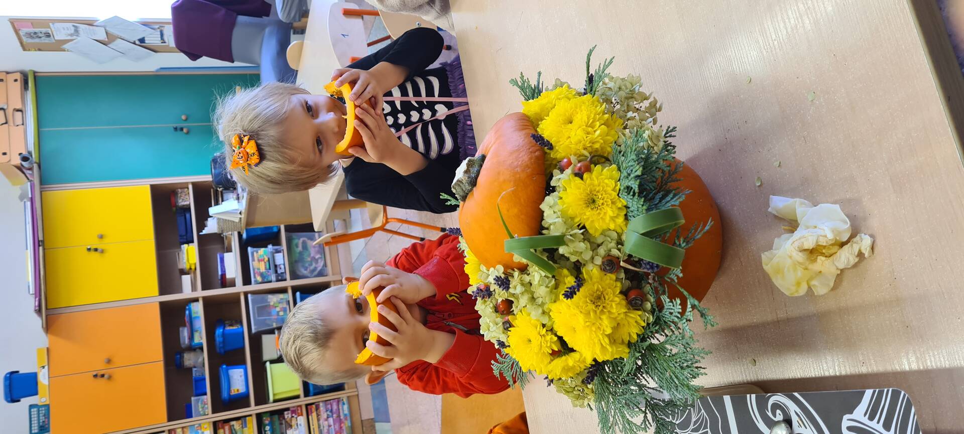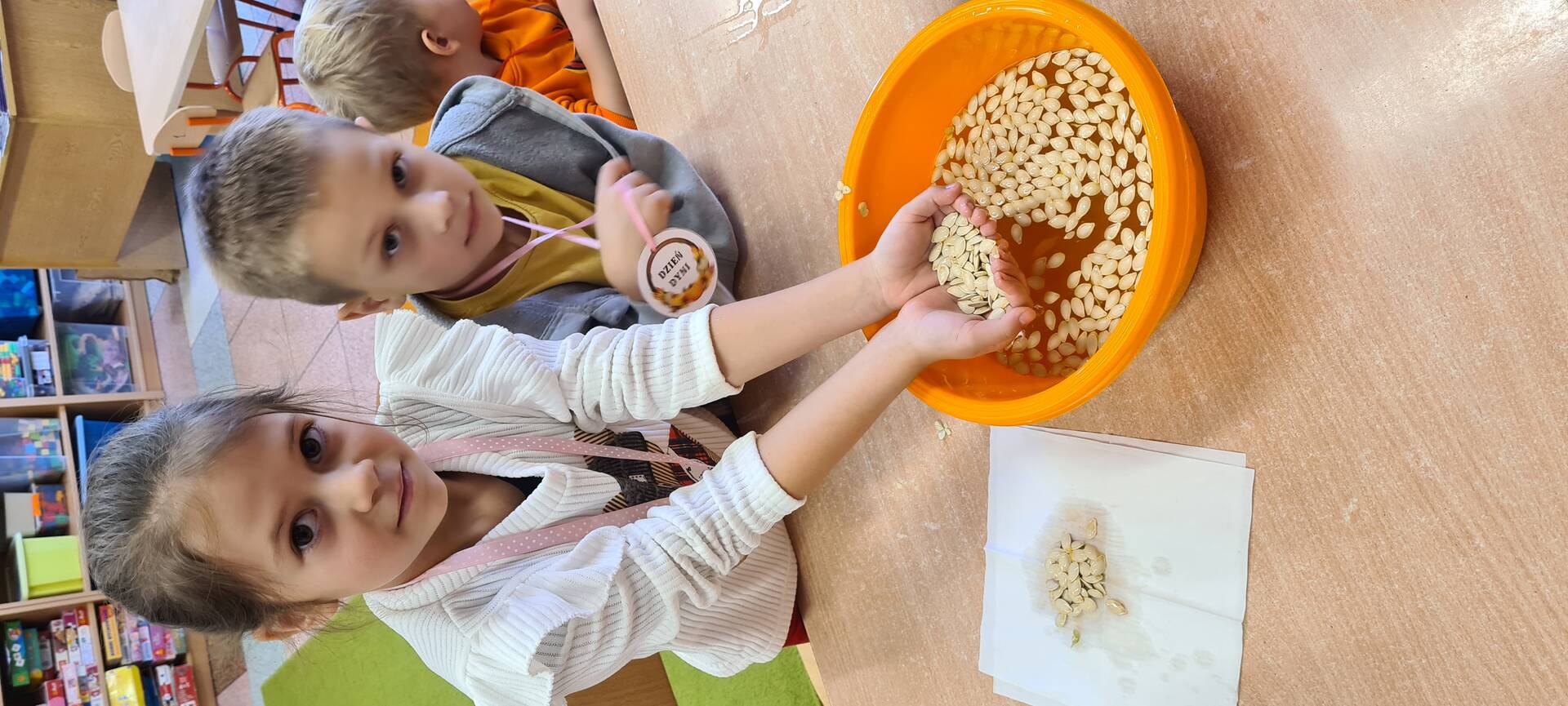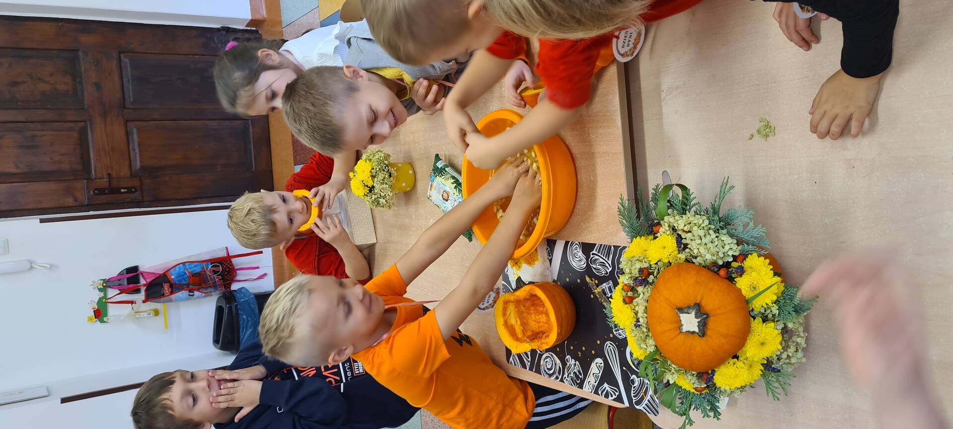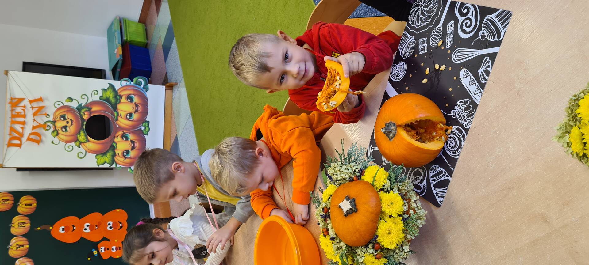 31 października dzieci z grupy Bratków zaprzyjaźniły się z dynią. Wartościowe pomarańczowe warzywo poznały od zewnątrz i od środka, podziwiając grubą, twardą powłokę i prowadząc zabawy badawcze. Dzieci drążyły miąższ, wyciągały i myły pestki, wdychały aromat dyni. Okazało się, że dynia to nie tylko pożywienie – może być także ozdobą czy wazonikiem. Jest również bardzo fotogeniczna i sprawdza się w przedszkolnej foto-budce. Dzień dyni u Bratków to naprawdę początek wspaniałej przyjaźni!