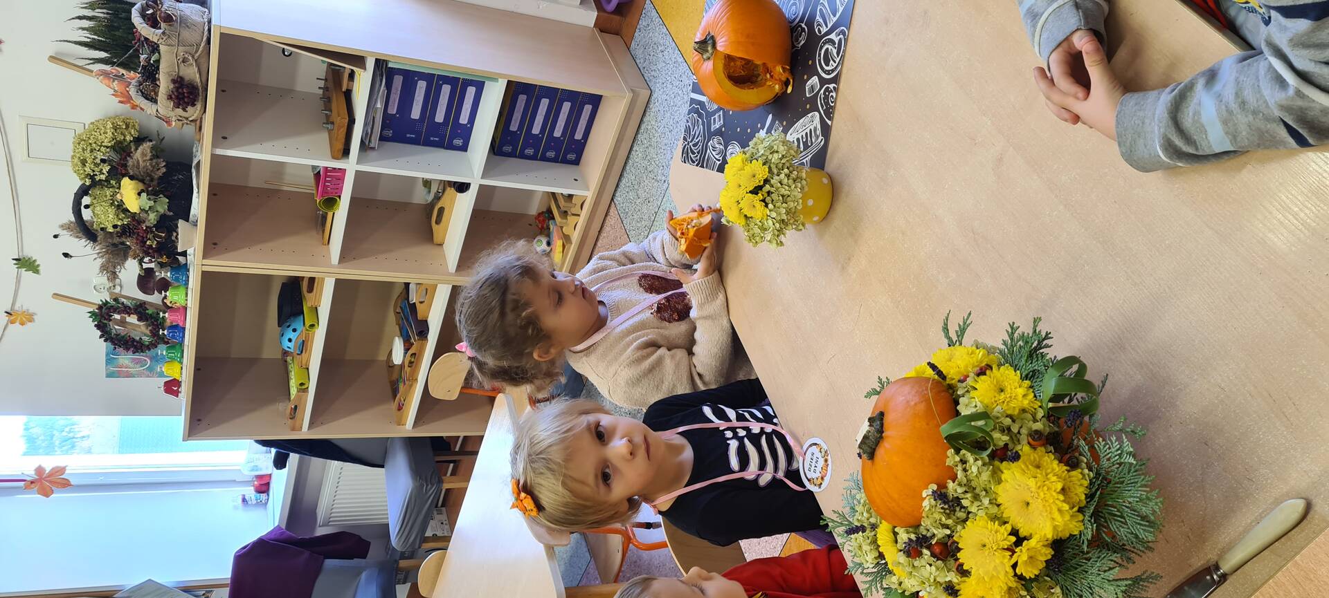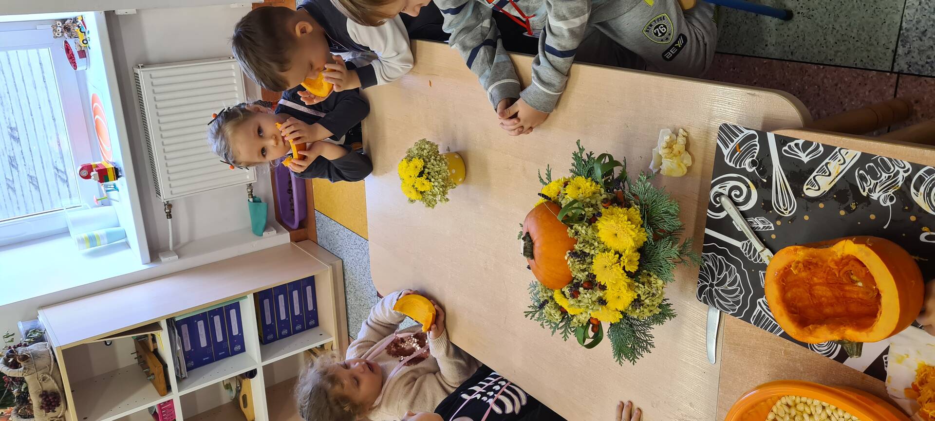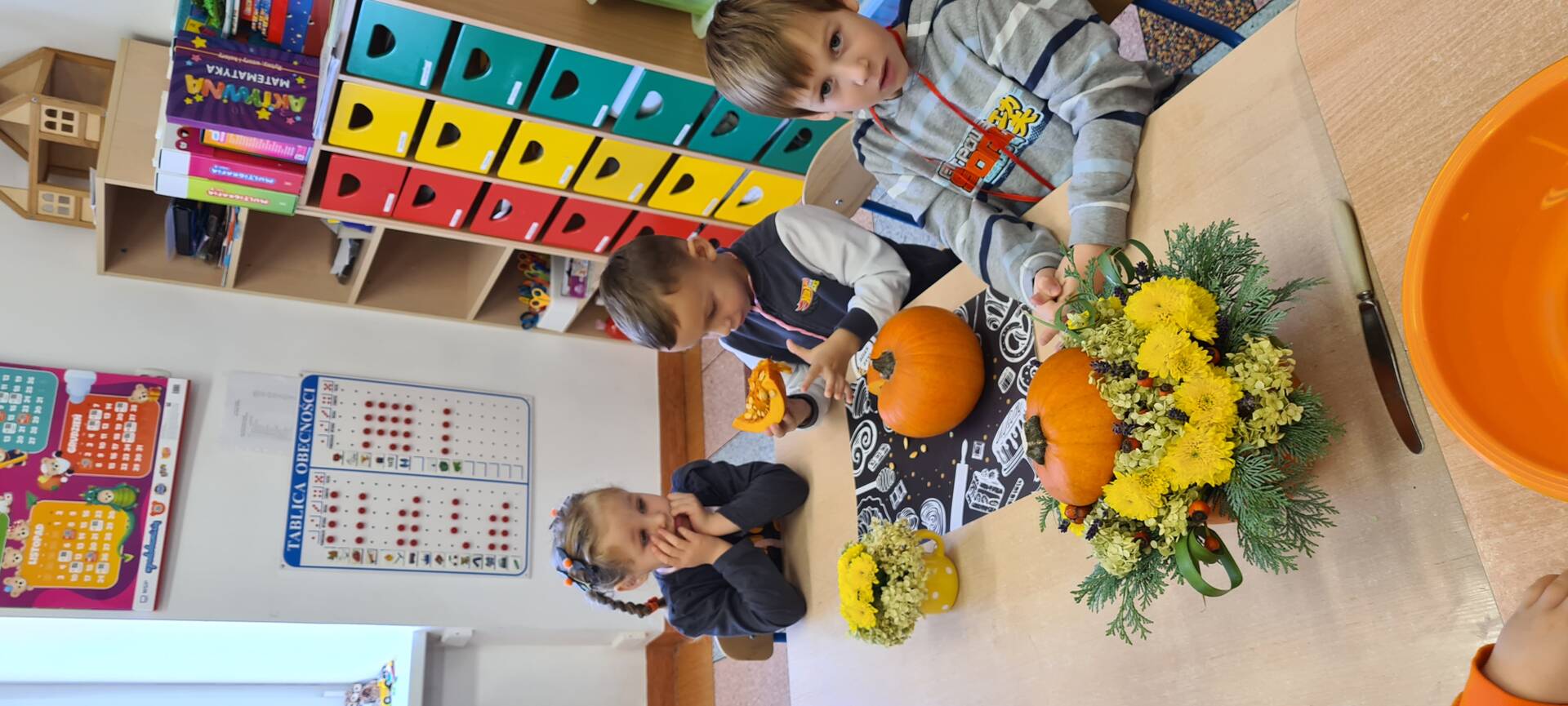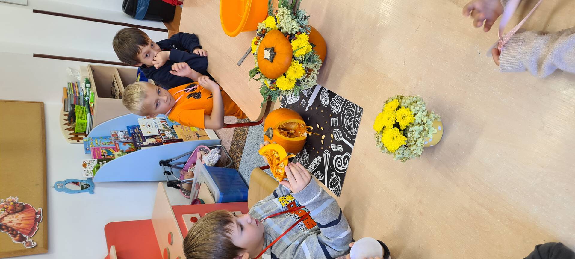 31 października dzieci z grupy Bratków zaprzyjaźniły się z dynią. Wartościowe pomarańczowe warzywo poznały od zewnątrz i od środka, podziwiając grubą, twardą powłokę i prowadząc zabawy badawcze. Dzieci drążyły miąższ, wyciągały i myły pestki, wdychały aromat dyni. Okazało się, że dynia to nie tylko pożywienie – może być także ozdobą czy wazonikiem. Jest również bardzo fotogeniczna i sprawdza się w przedszkolnej foto-budce. Dzień dyni u Bratków to naprawdę początek wspaniałej przyjaźni!