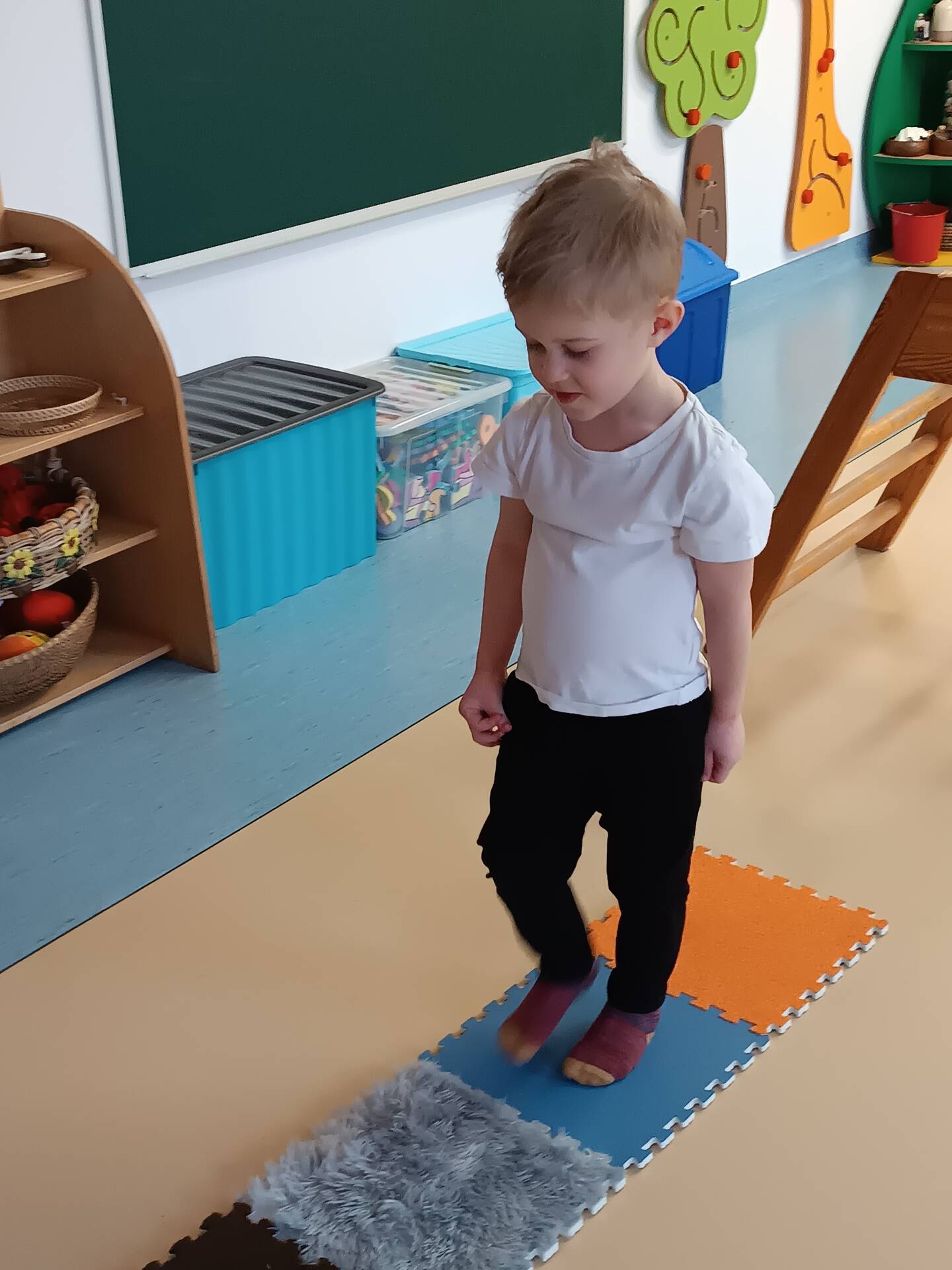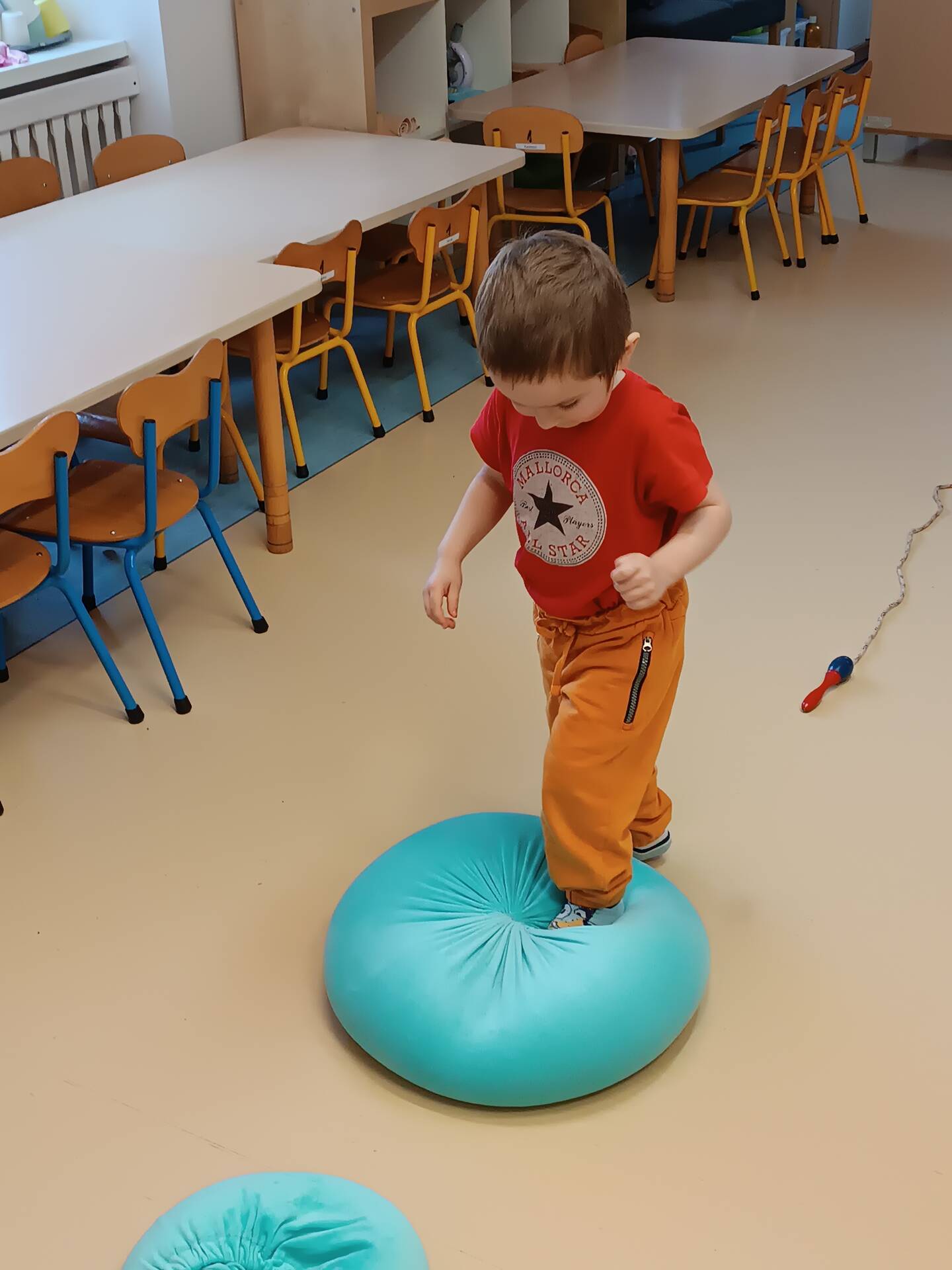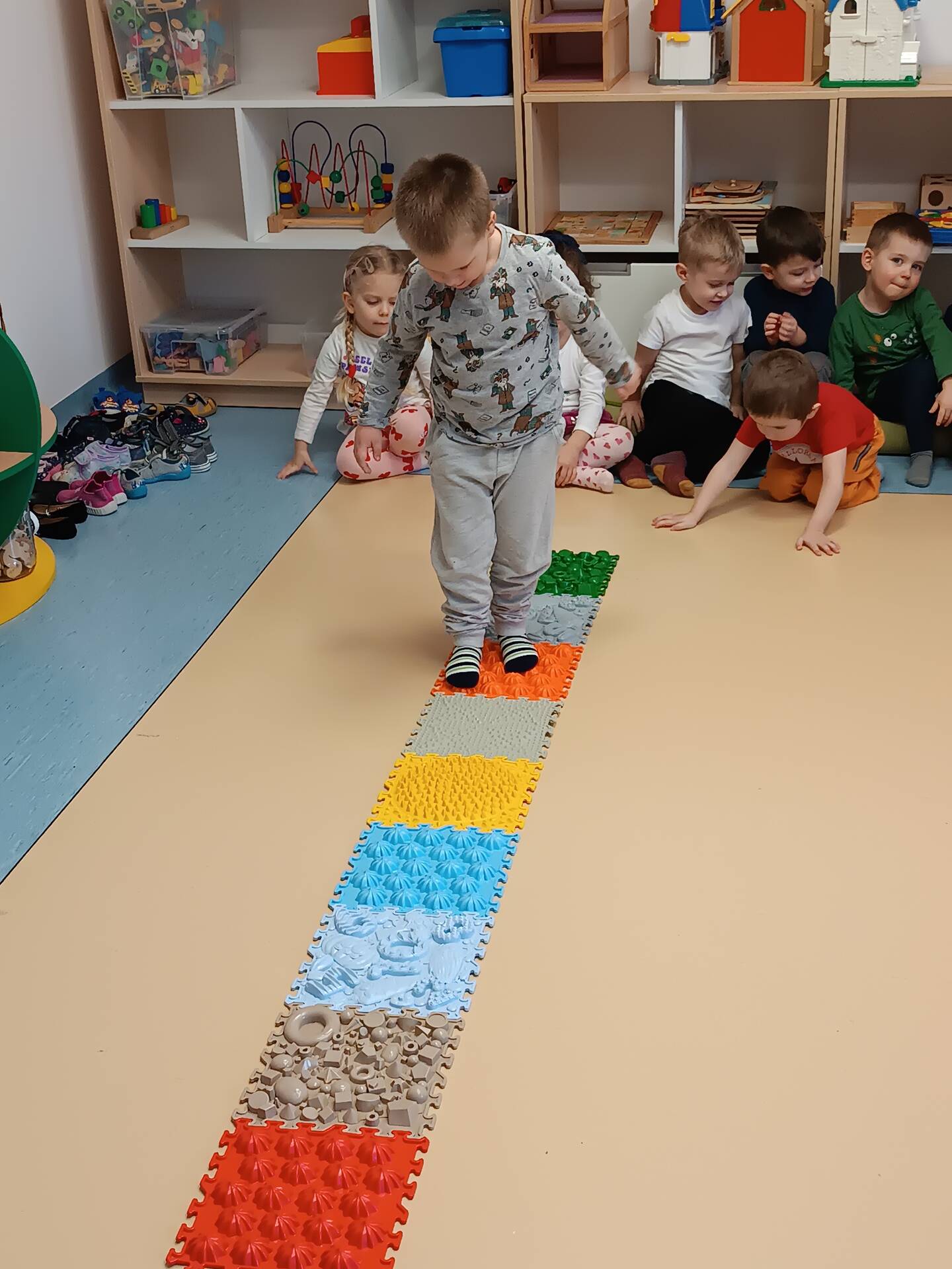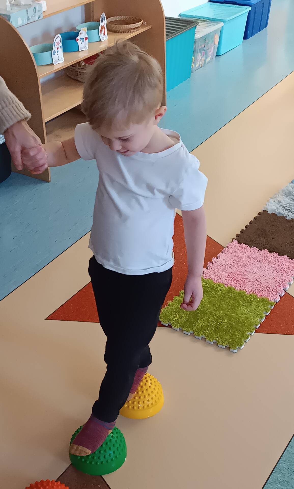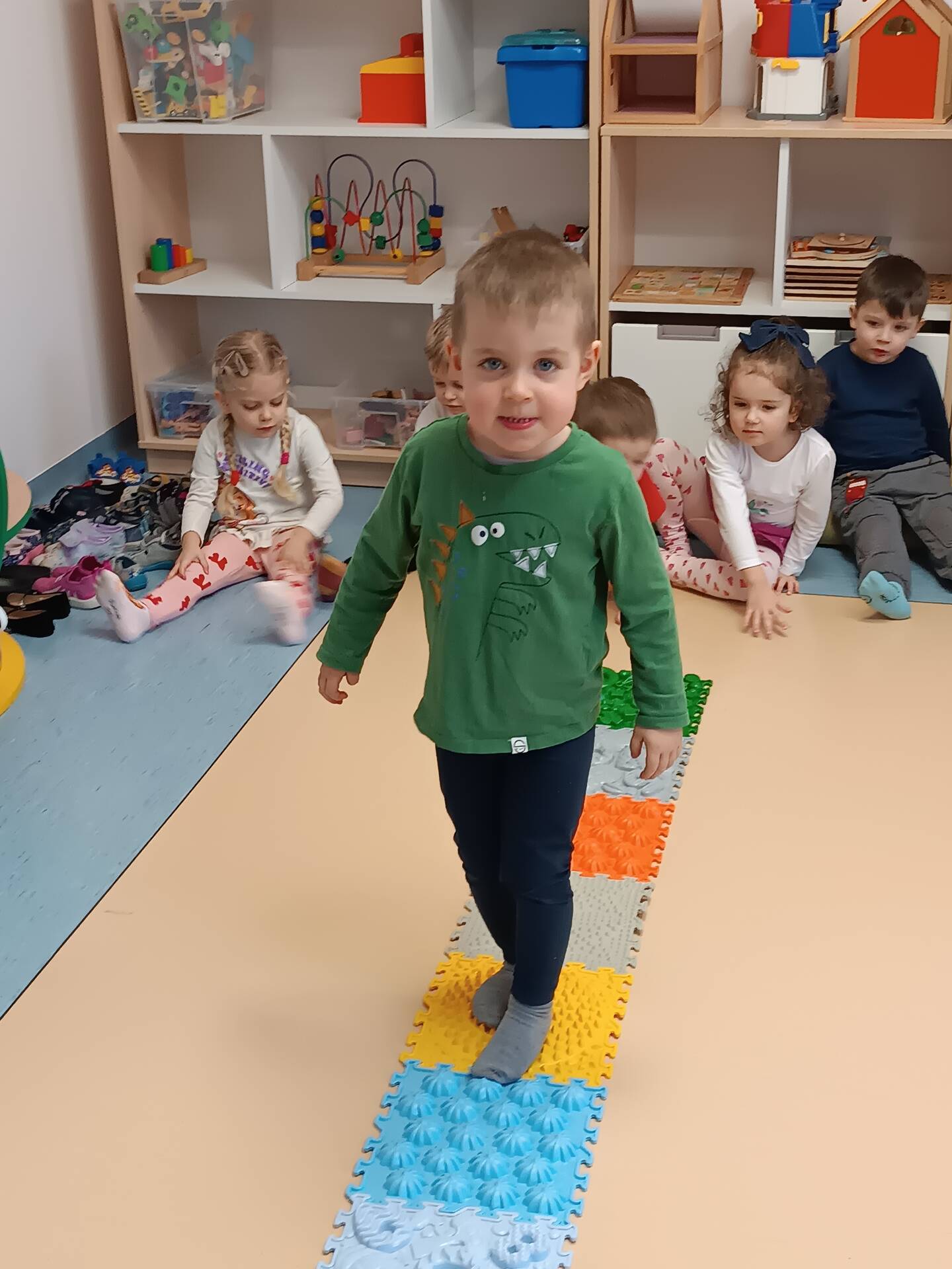 Pierwszy dzień ferii dzieci z gr. Fiołków rozpoczęły bardzo aktywnie biorąc udział w przygotowanym torze przeszkód z użyciem Bukinów sensolyke oraz ścieżek sensorycznych. Rozwijały motorykę dużą oraz korordynację wzrokowo – ruchową.