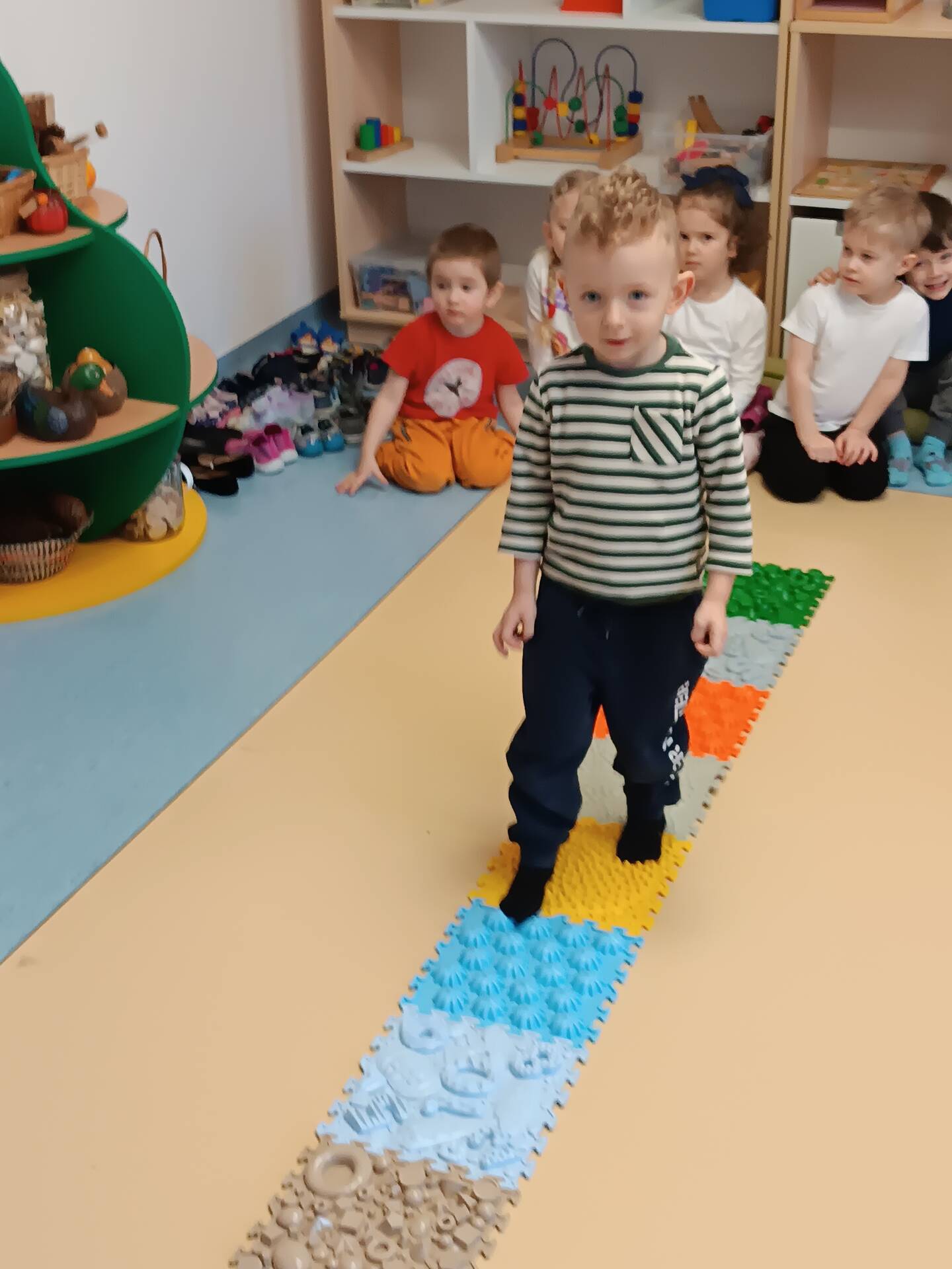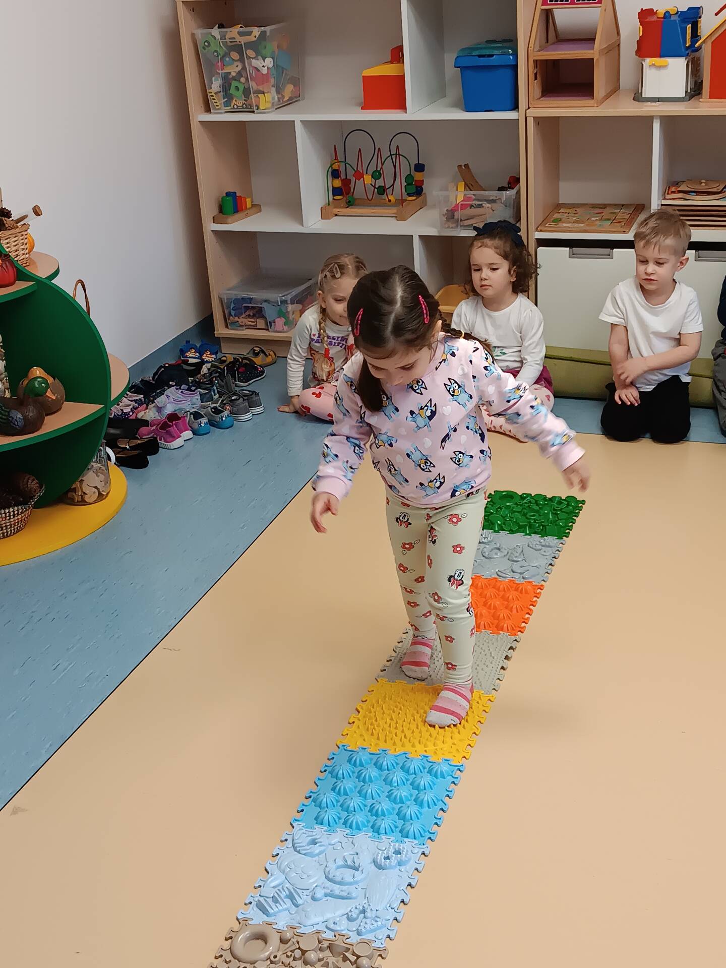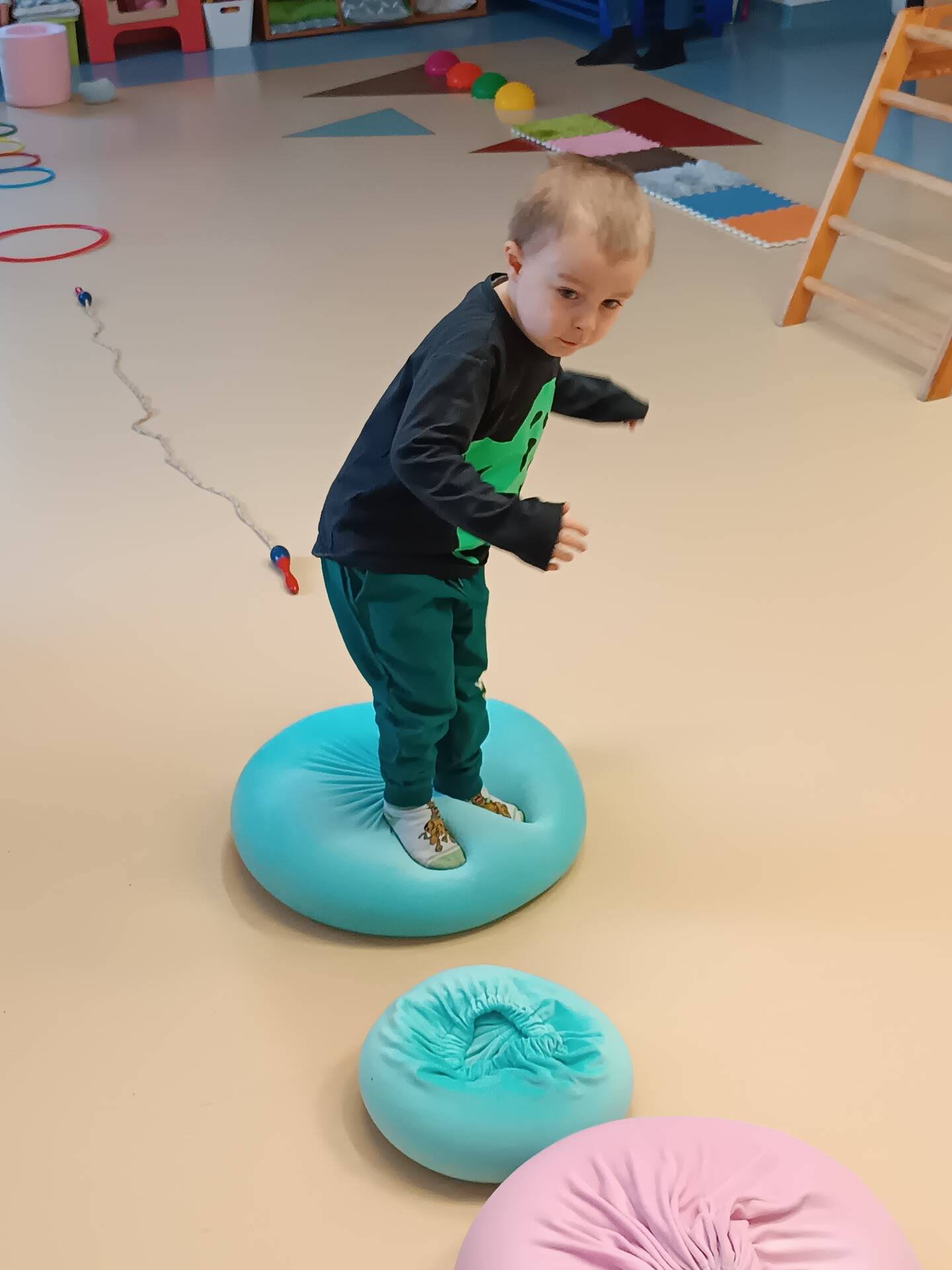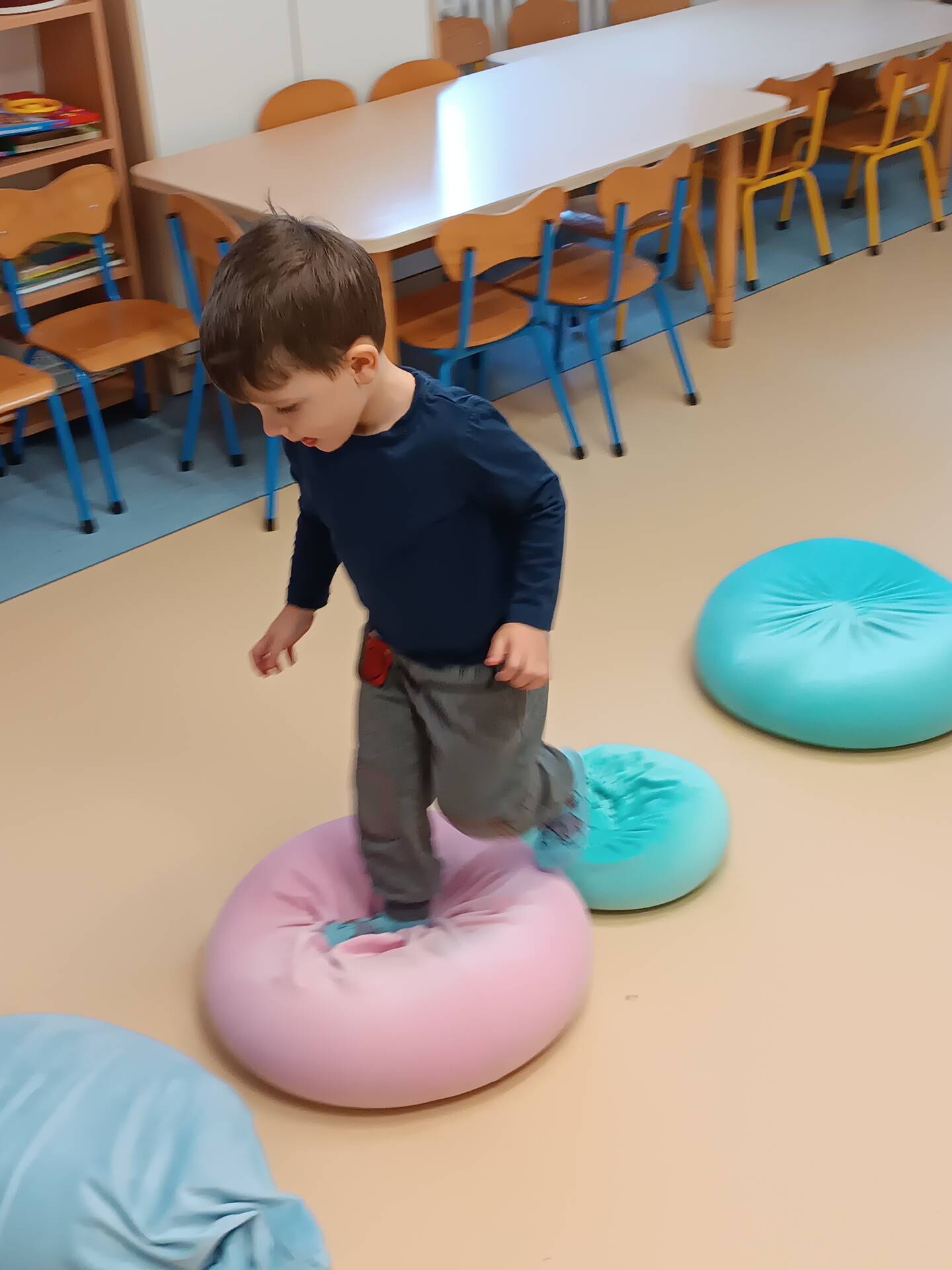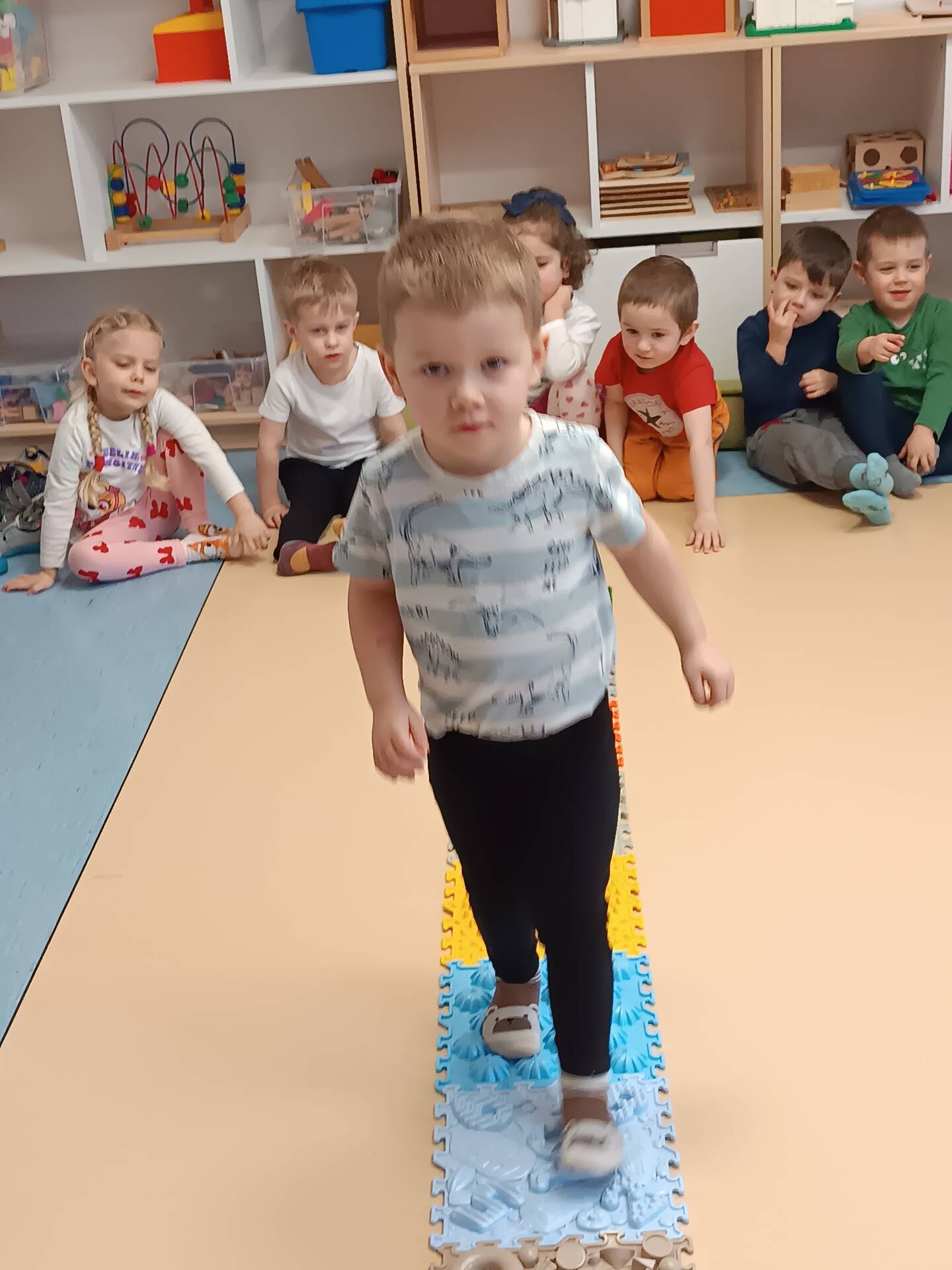 Pierwszy dzień ferii dzieci z gr. Fiołków rozpoczęły bardzo aktywnie biorąc udział w przygotowanym torze przeszkód z użyciem Bukinów sensolyke oraz ścieżek sensorycznych. Rozwijały motorykę dużą oraz korordynację wzrokowo – ruchową.