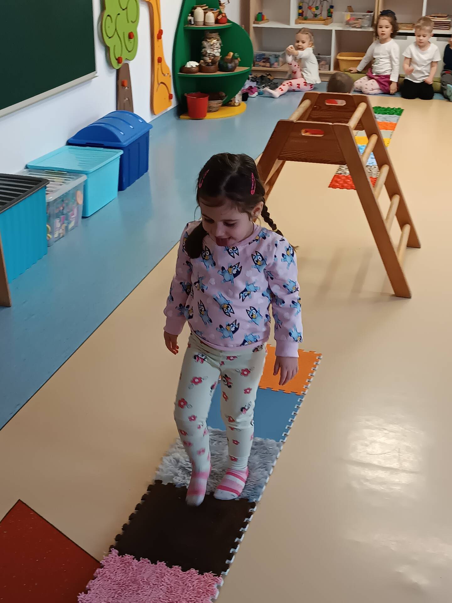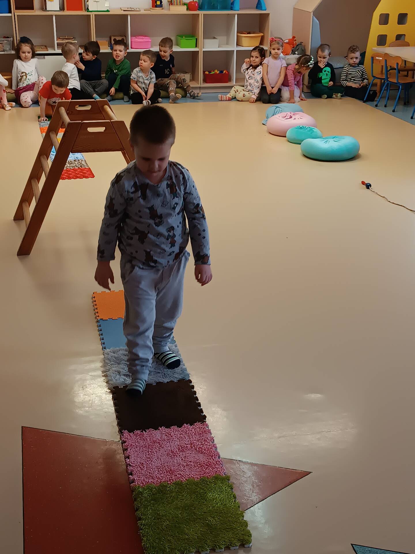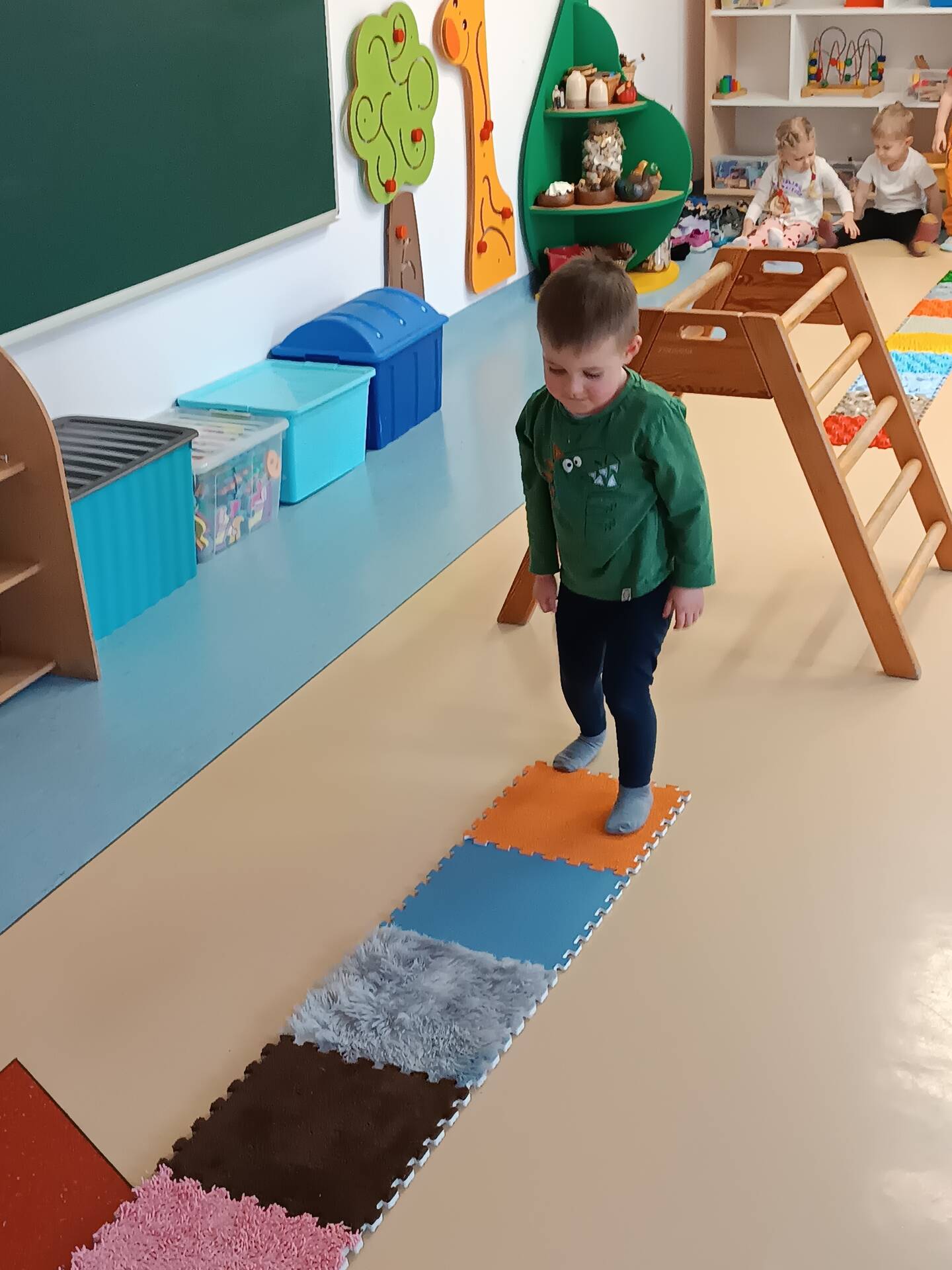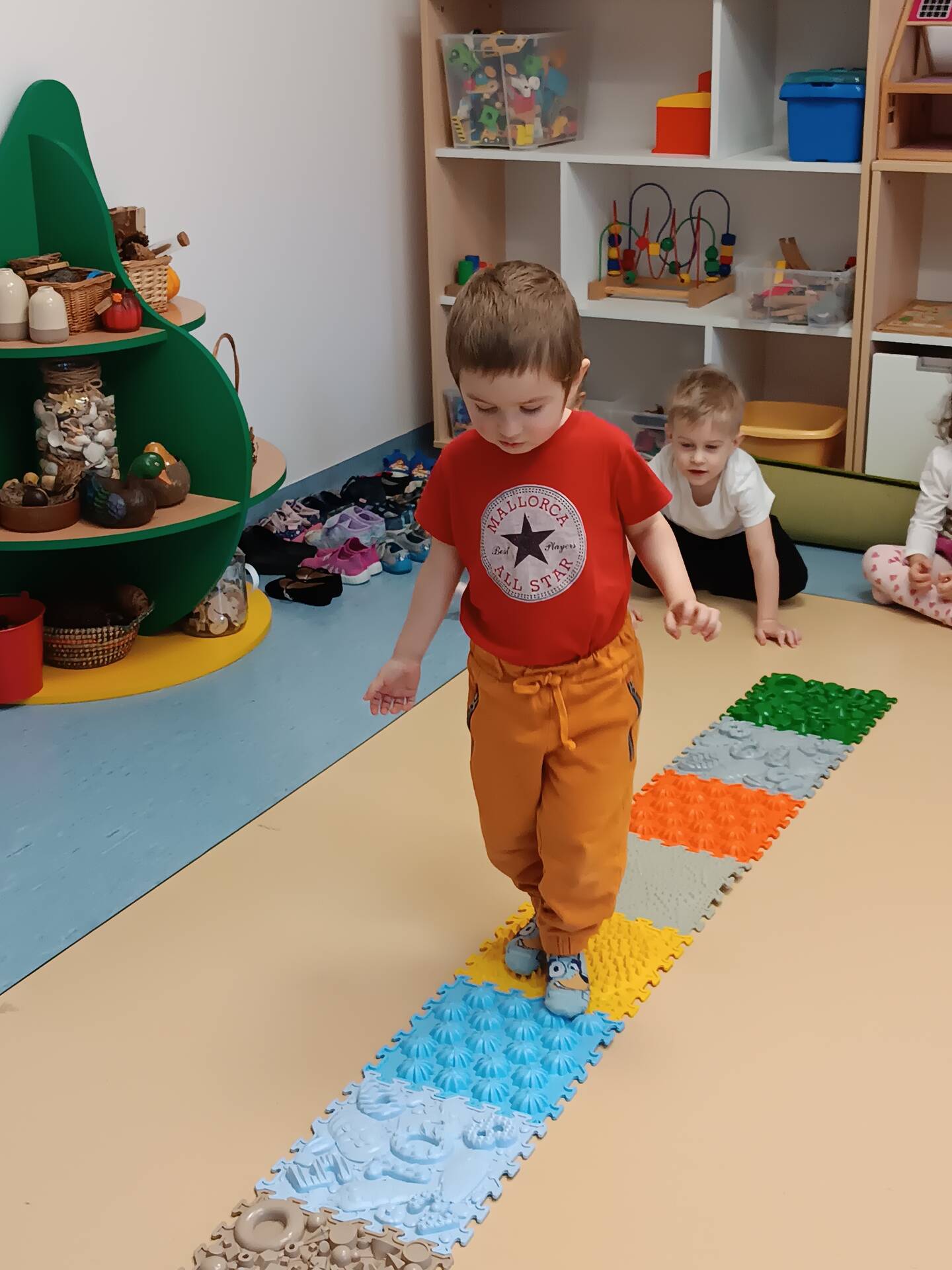 Pierwszy dzień ferii dzieci z gr. Fiołków rozpoczęły bardzo aktywnie biorąc udział w przygotowanym torze przeszkód z użyciem Bukinów sensolyke oraz ścieżek sensorycznych. Rozwijały motorykę dużą oraz korordynację wzrokowo – ruchową.