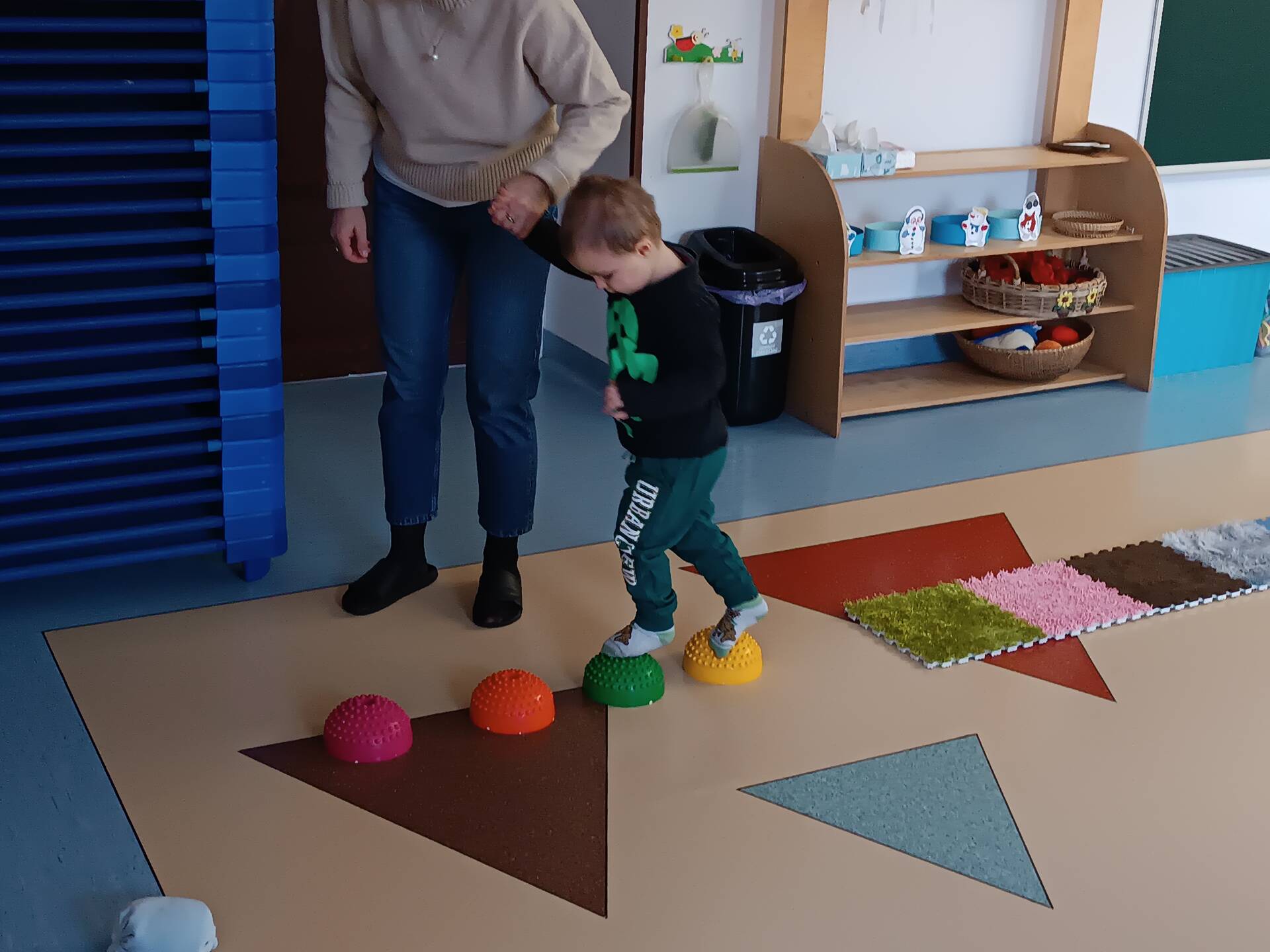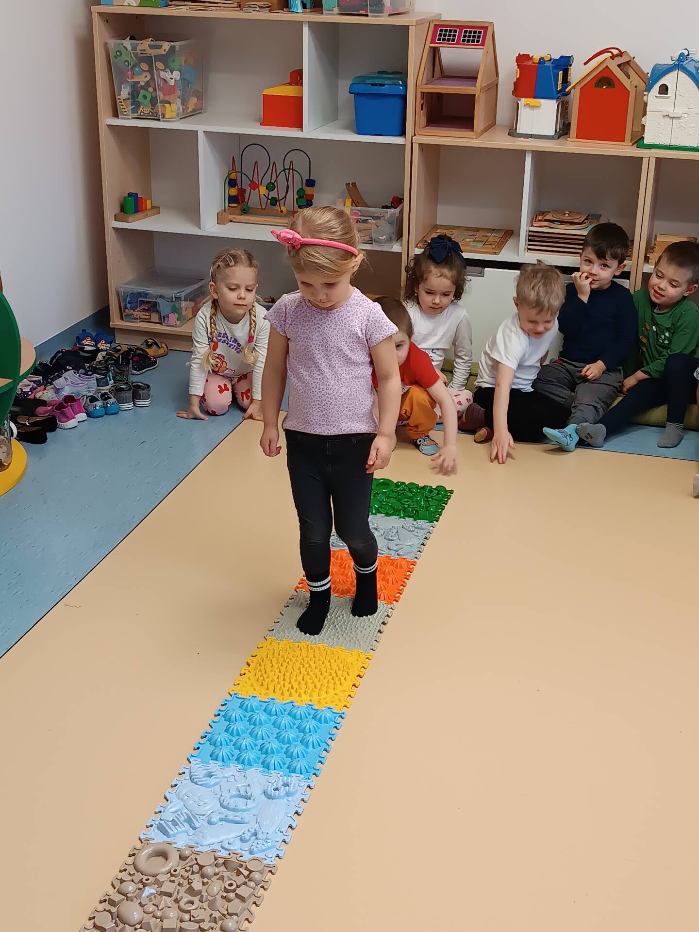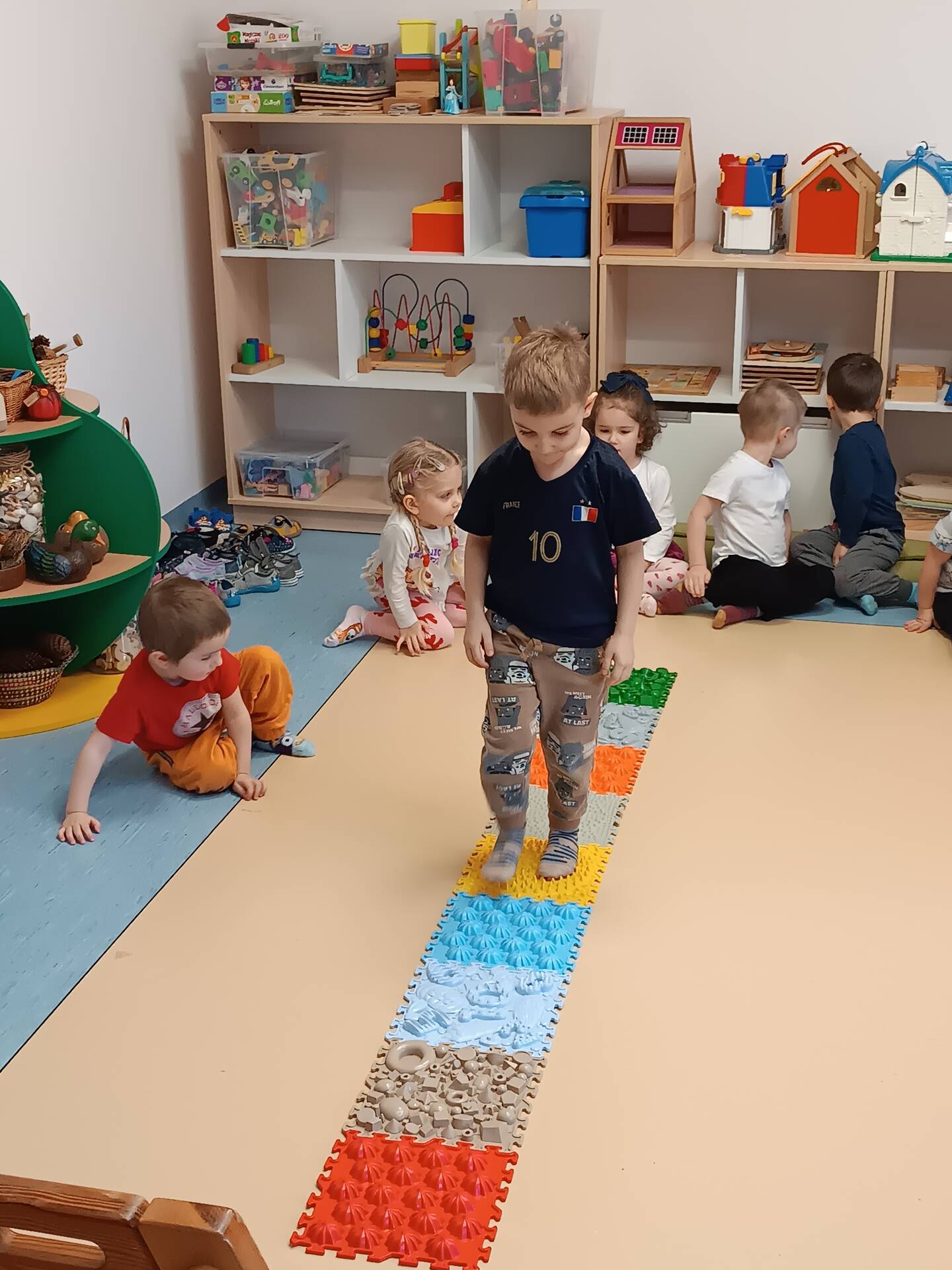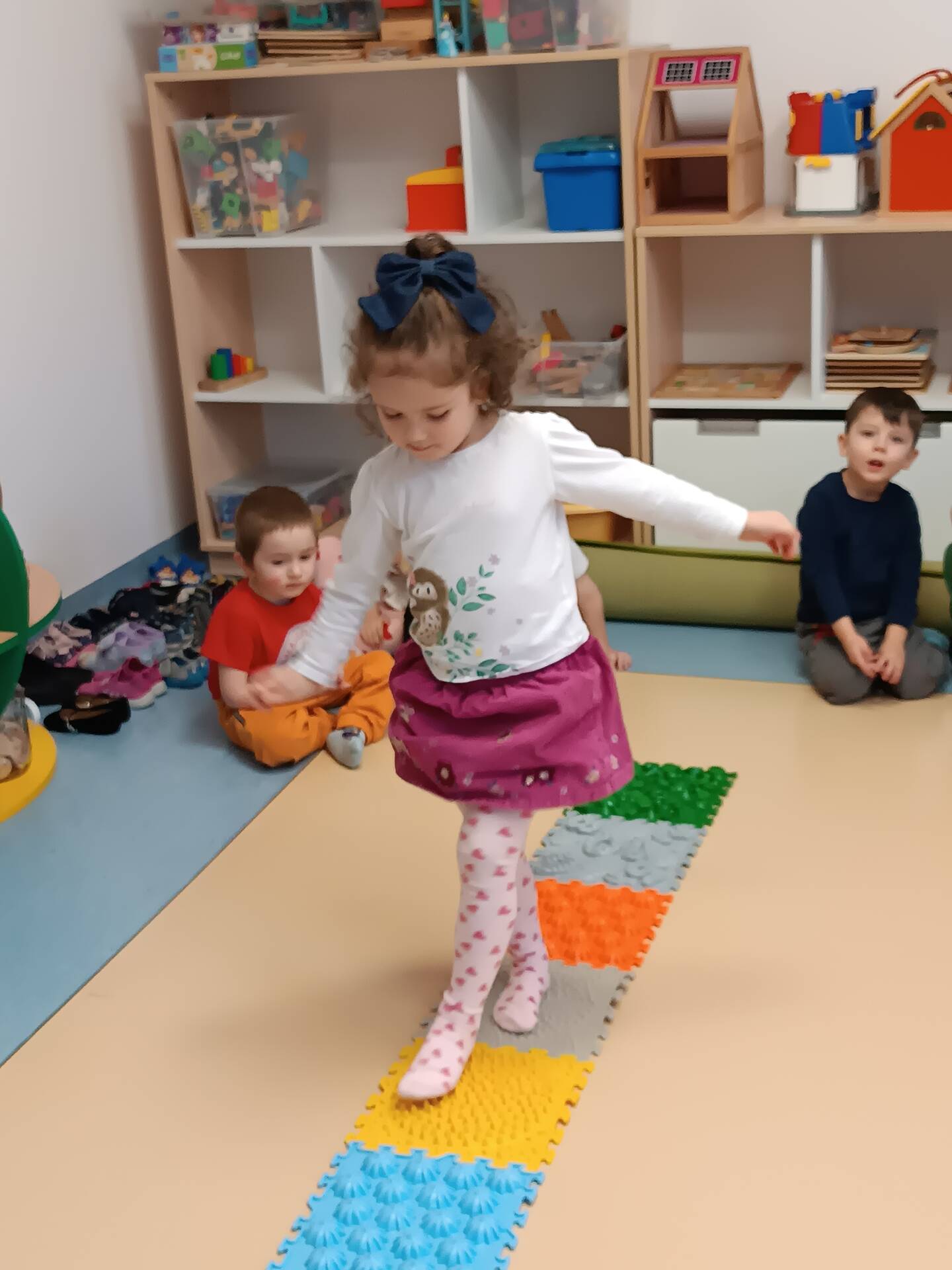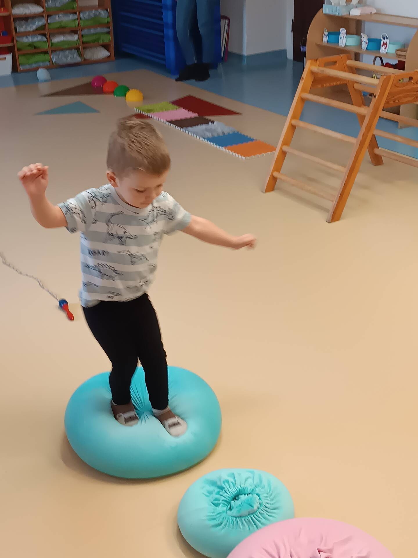Pierwszy dzień ferii dzieci z gr. Fiołków rozpoczęły bardzo aktywnie biorąc udział w przygotowanym torze przeszkód z użyciem Bukinów sensolyke oraz ścieżek sensorycznych. Rozwijały motorykę dużą oraz korordynację wzrokowo – ruchową.