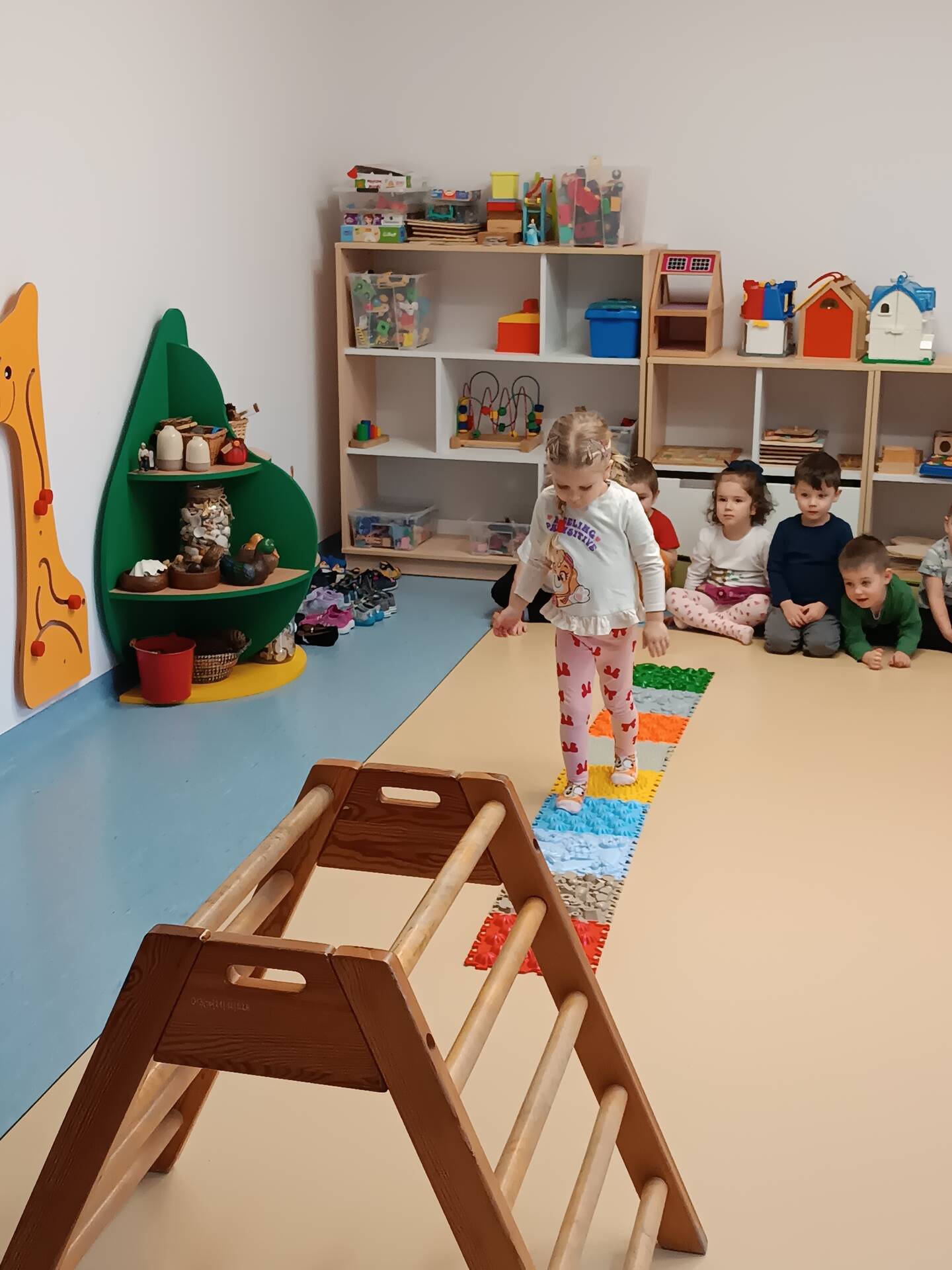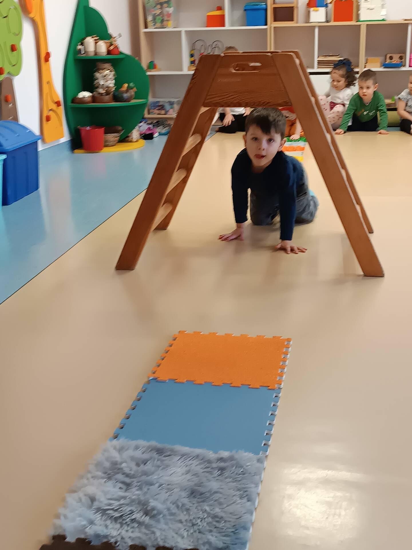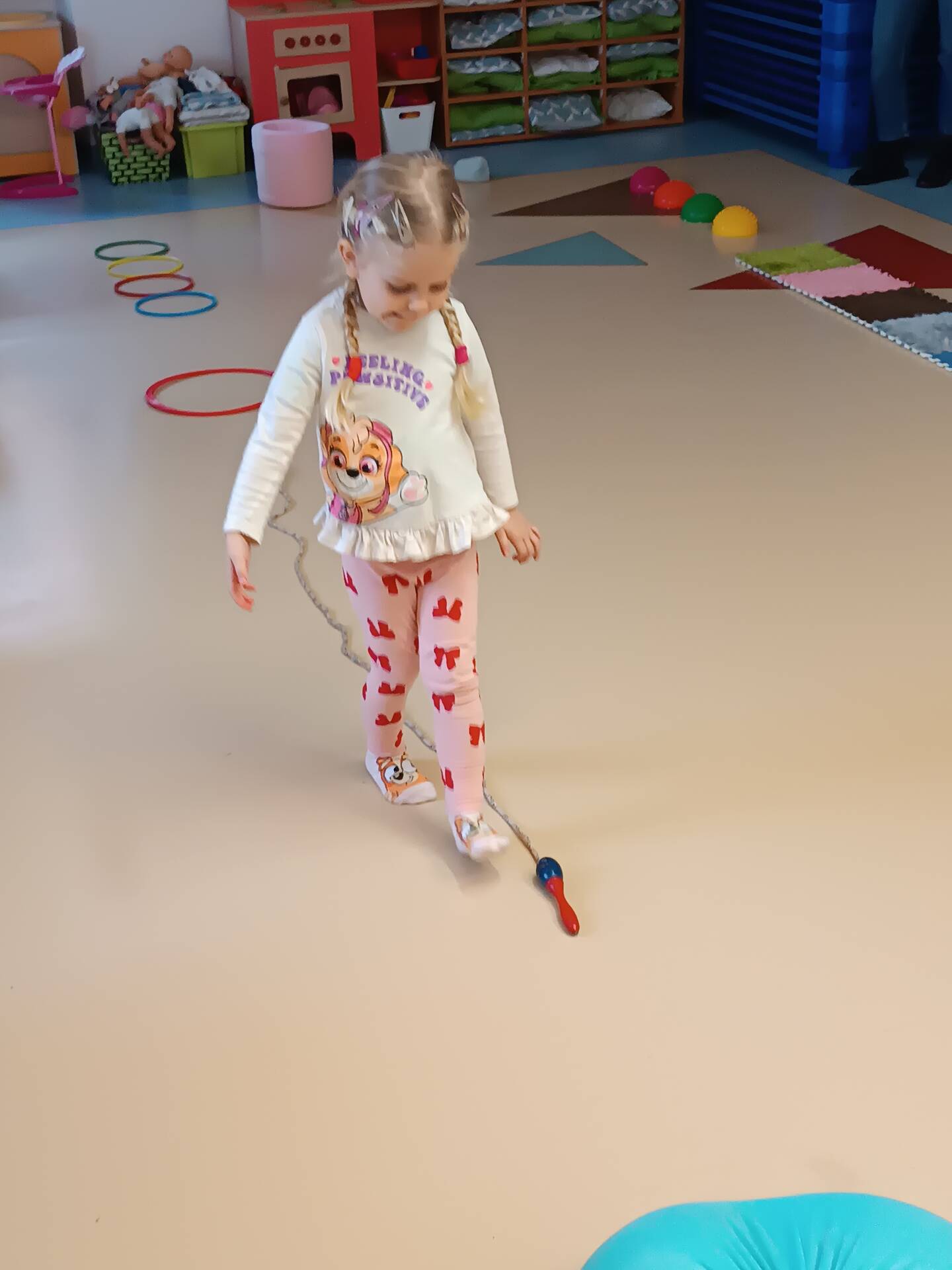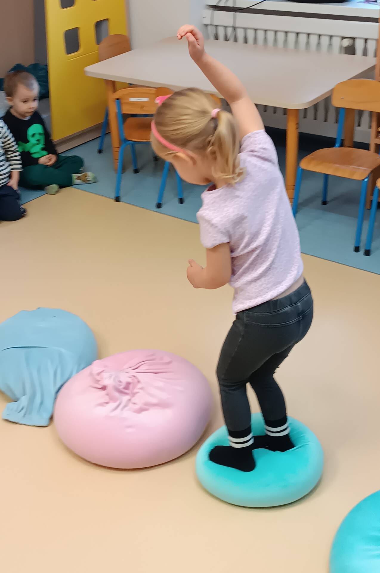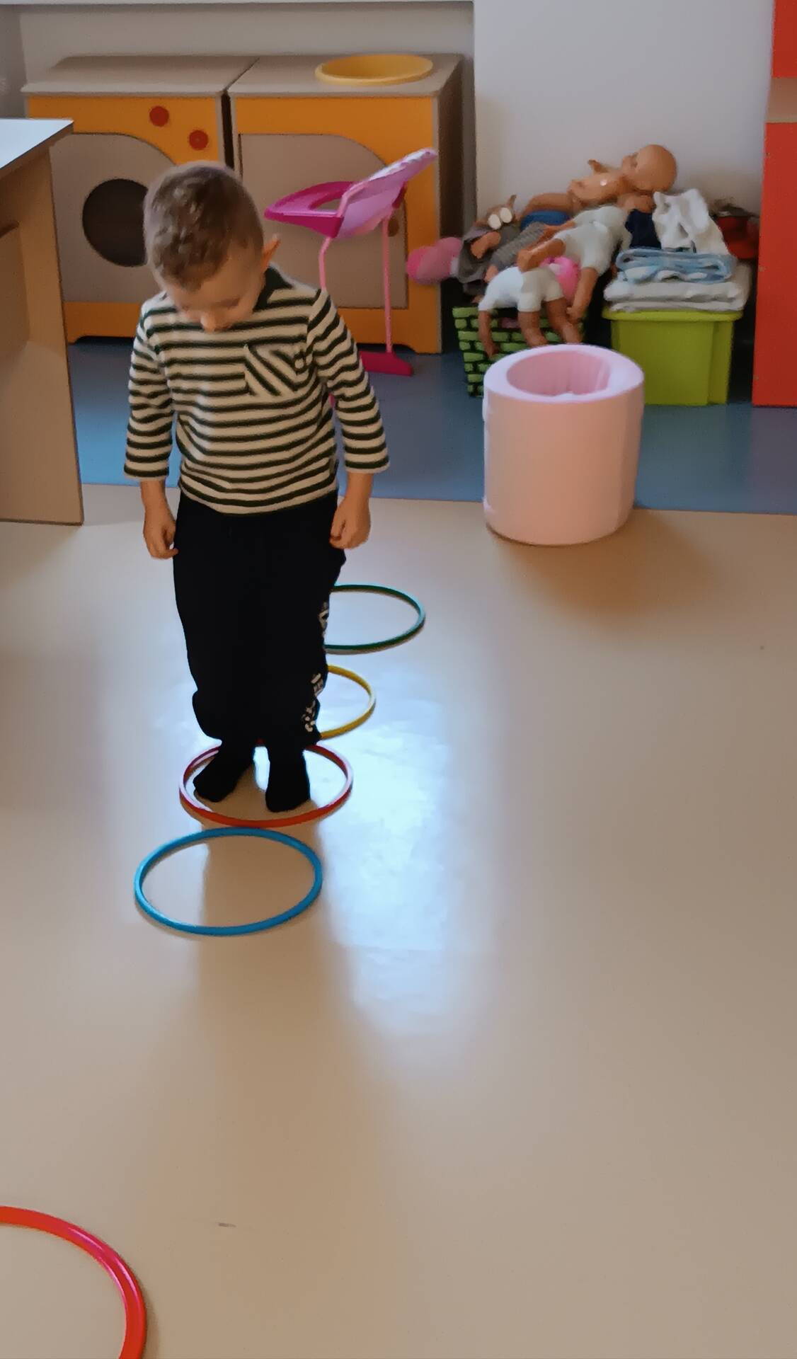 Pierwszy dzień ferii dzieci z gr. Fiołków rozpoczęły bardzo aktywnie biorąc udział w przygotowanym torze przeszkód z użyciem Bukinów sensolyke oraz ścieżek sensorycznych. Rozwijały motorykę dużą oraz korordynację wzrokowo – ruchową.