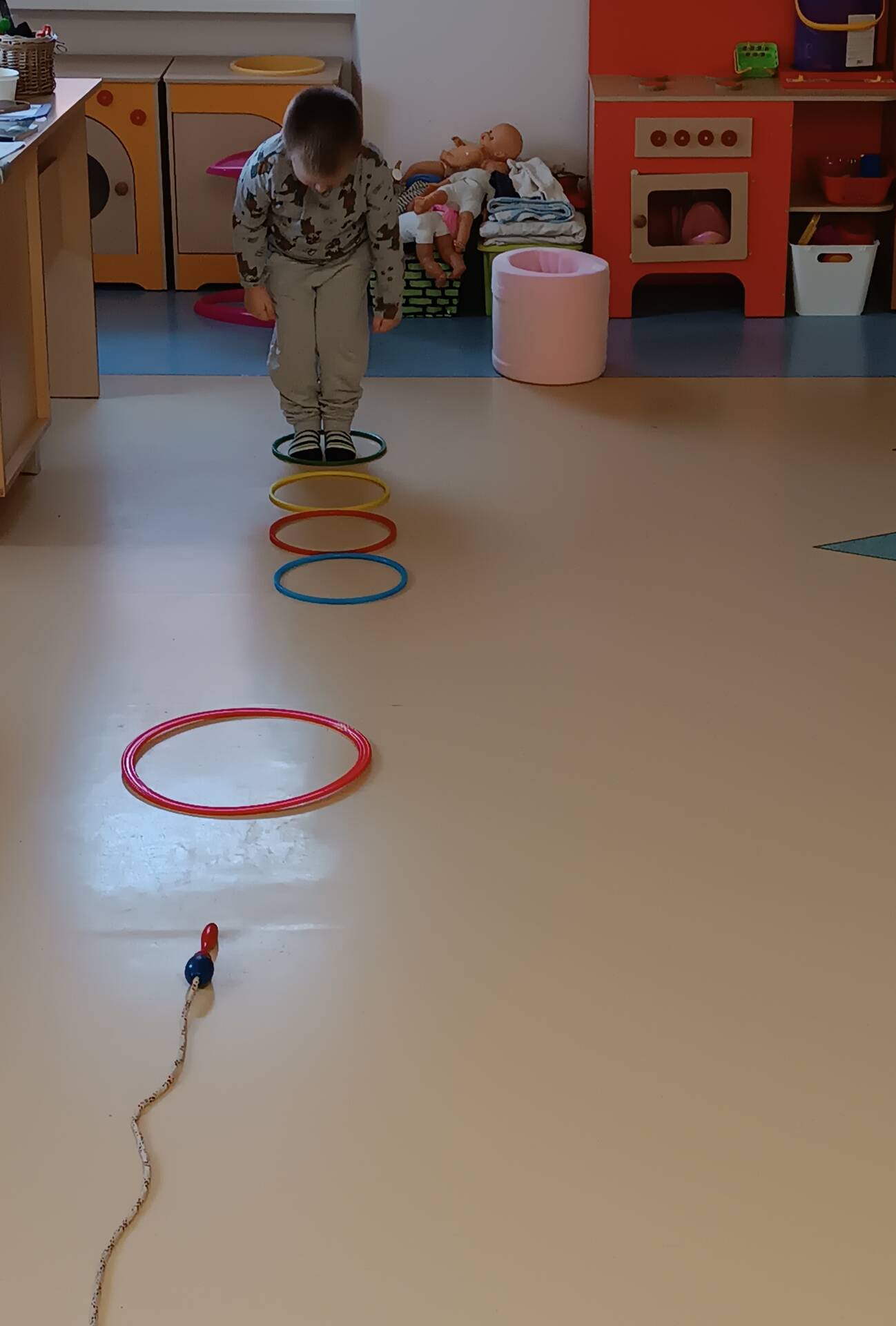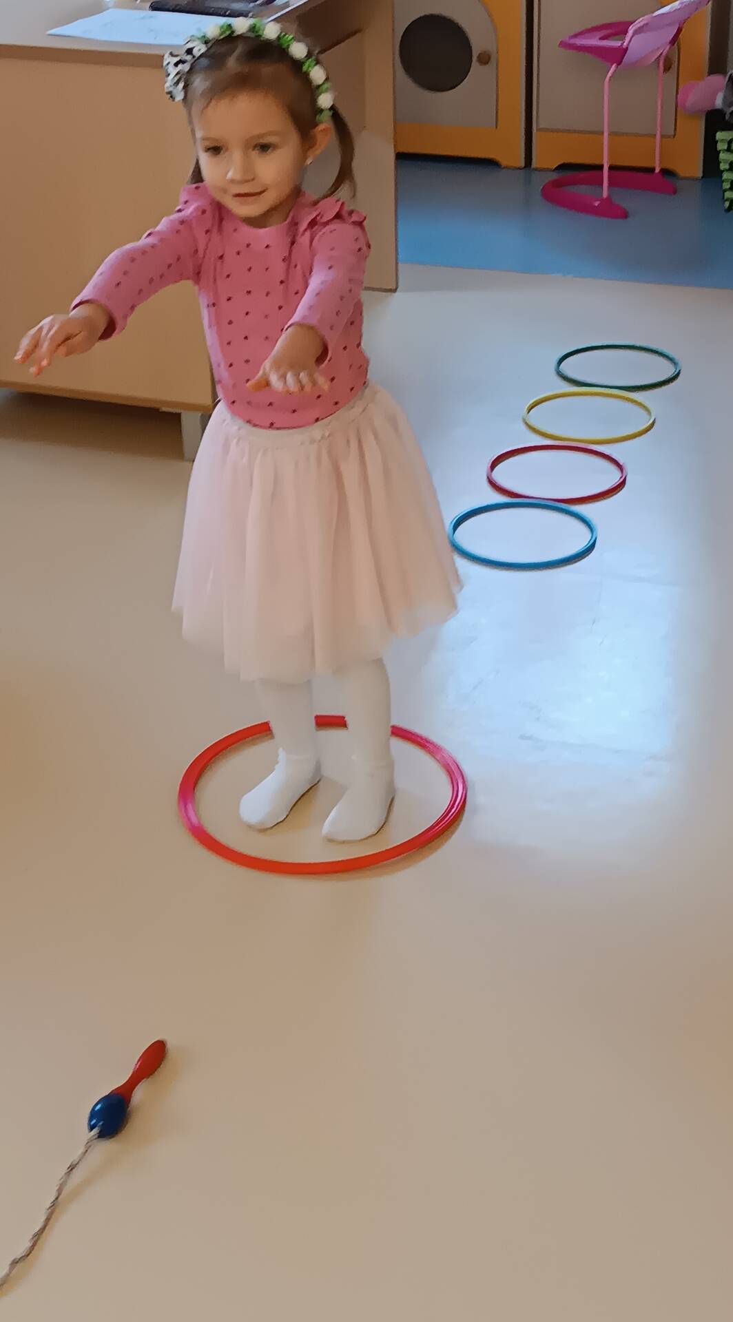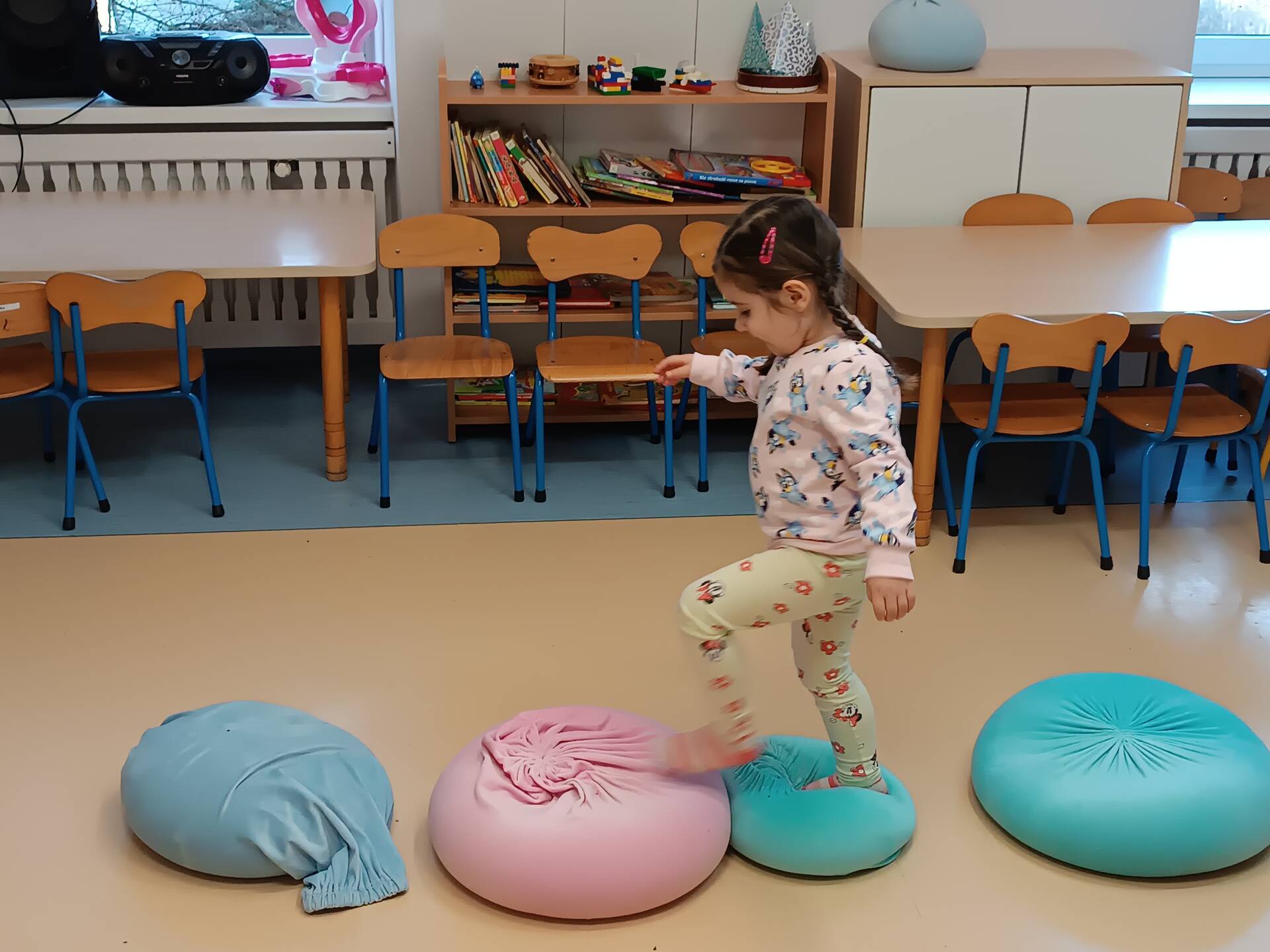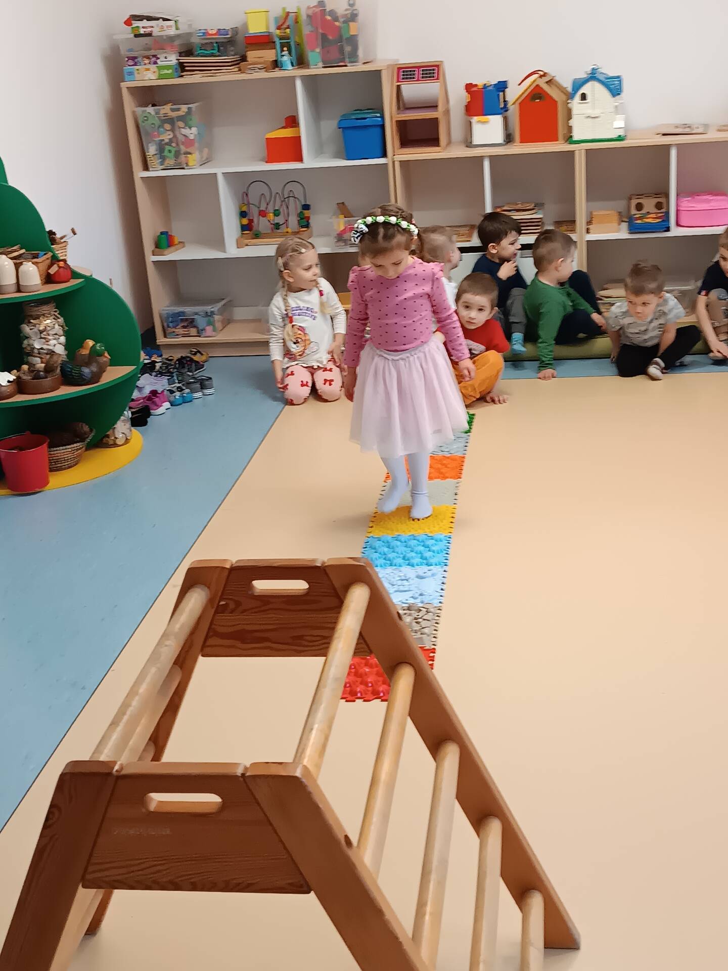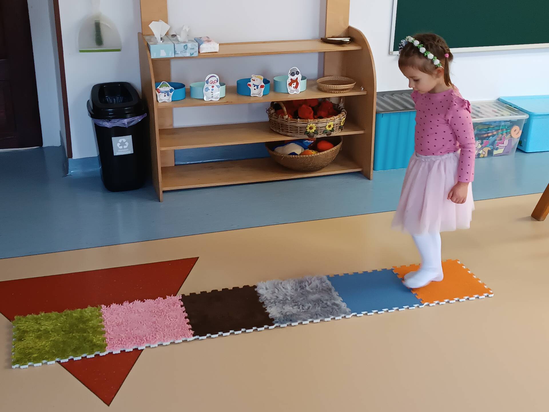 Pierwszy dzień ferii dzieci z gr. Fiołków rozpoczęły bardzo aktywnie biorąc udział w przygotowanym torze przeszkód z użyciem Bukinów sensolyke oraz ścieżek sensorycznych. Rozwijały motorykę dużą oraz korordynację wzrokowo – ruchową.