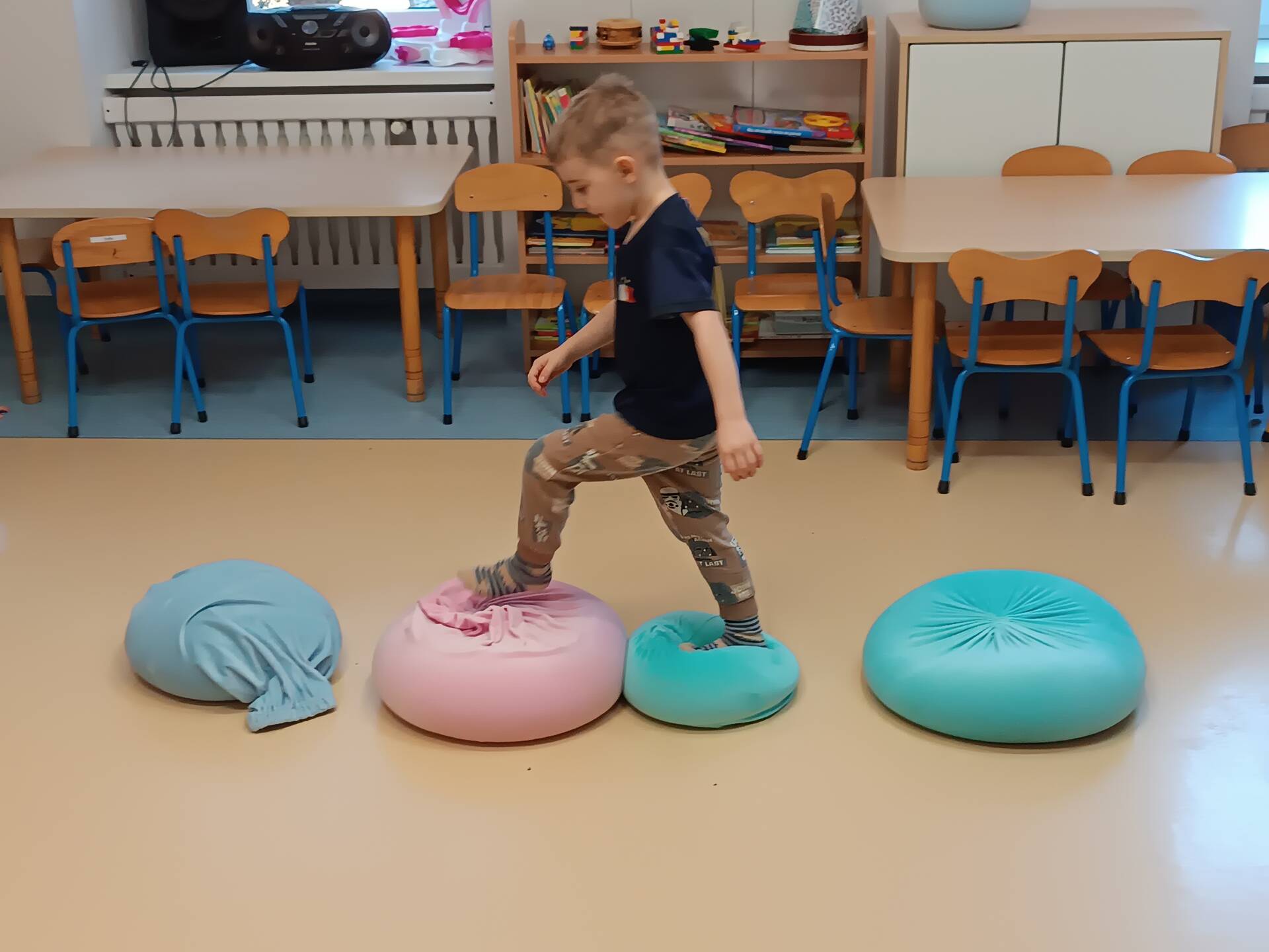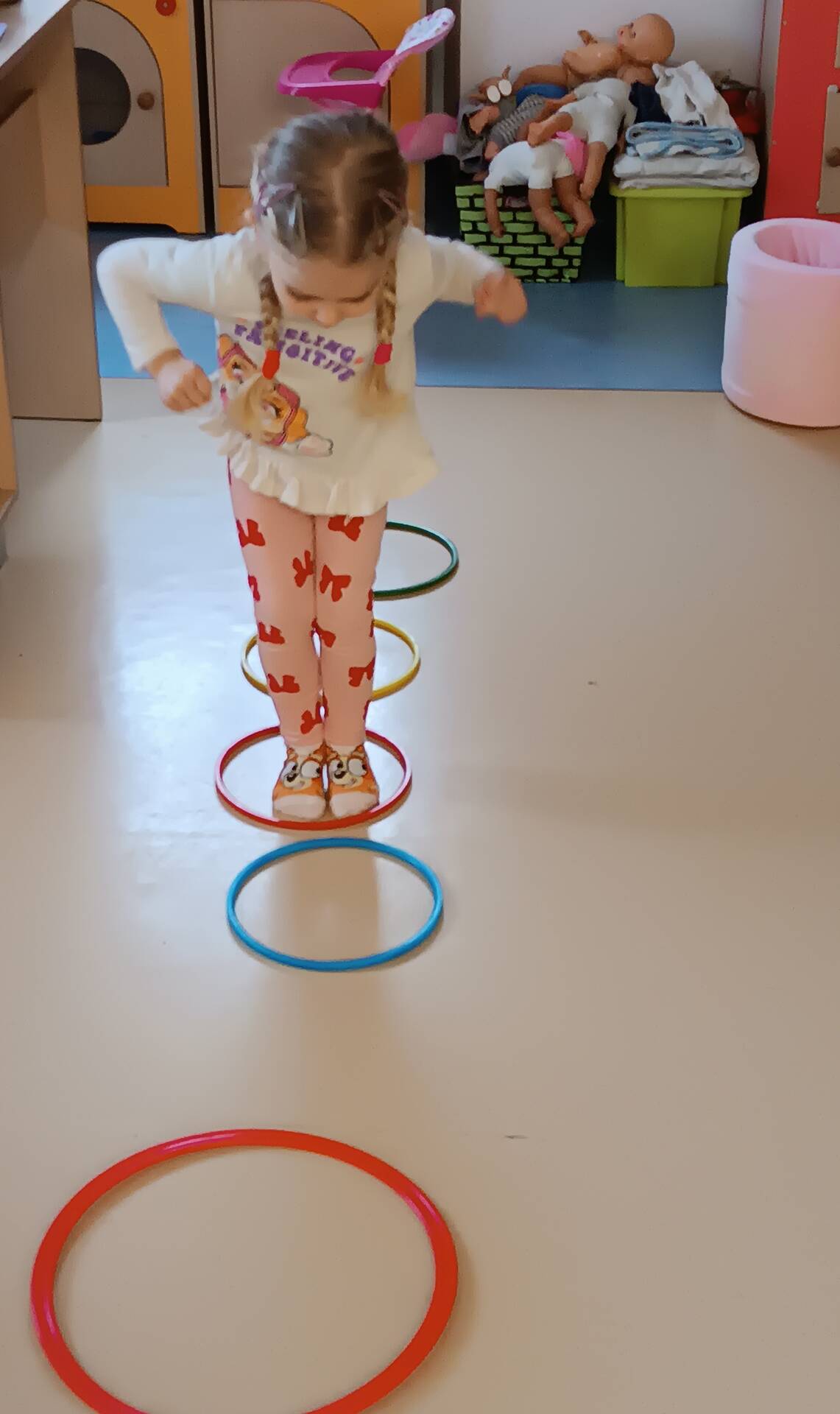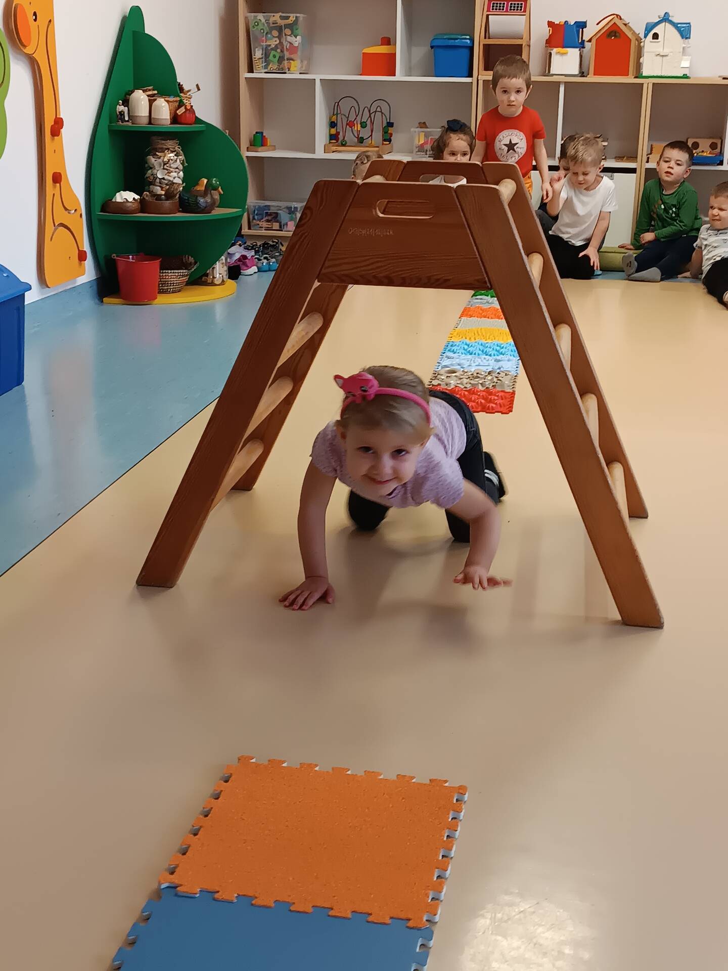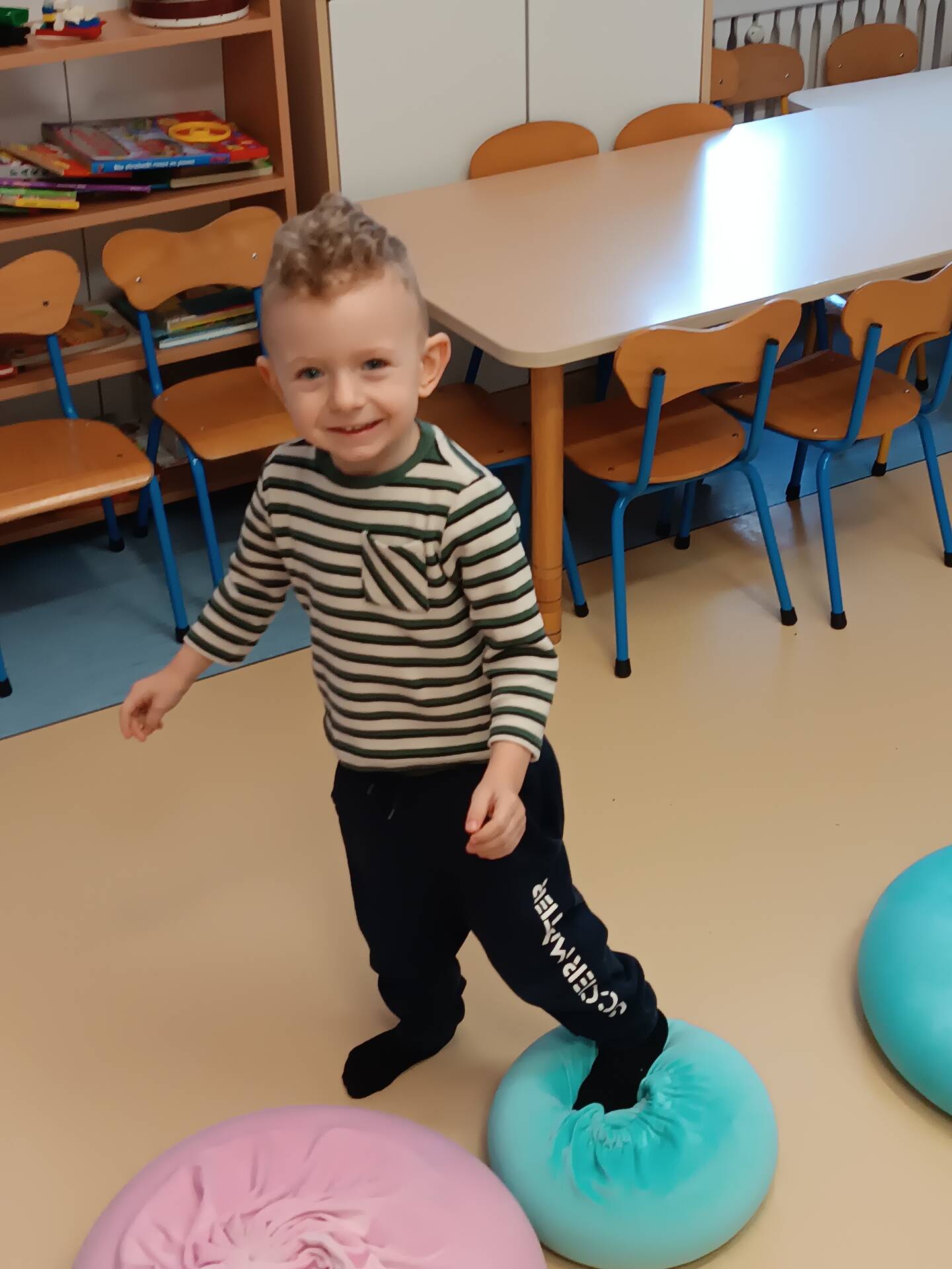 Pierwszy dzień ferii dzieci z gr. Fiołków rozpoczęły bardzo aktywnie biorąc udział w przygotowanym torze przeszkód z użyciem Bukinów sensolyke oraz ścieżek sensorycznych. Rozwijały motorykę dużą oraz korordynację wzrokowo – ruchową.