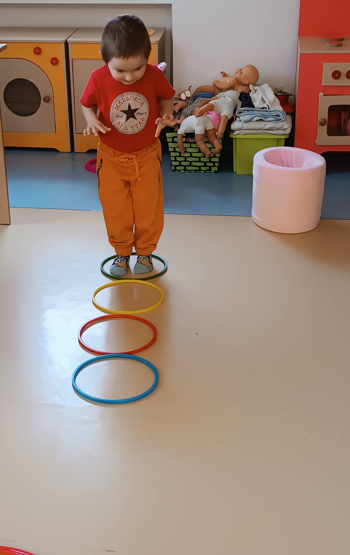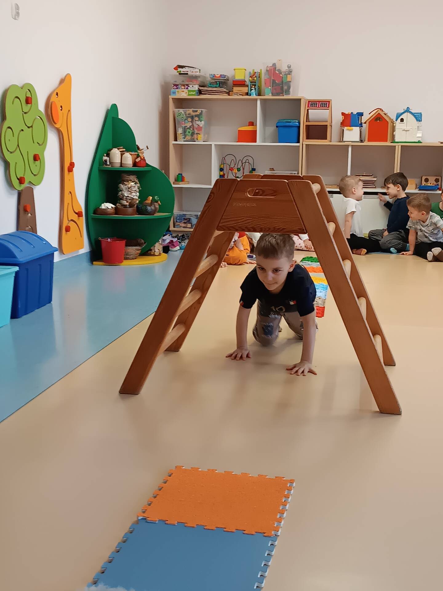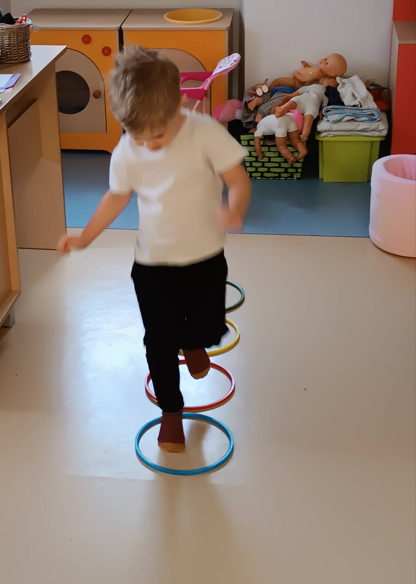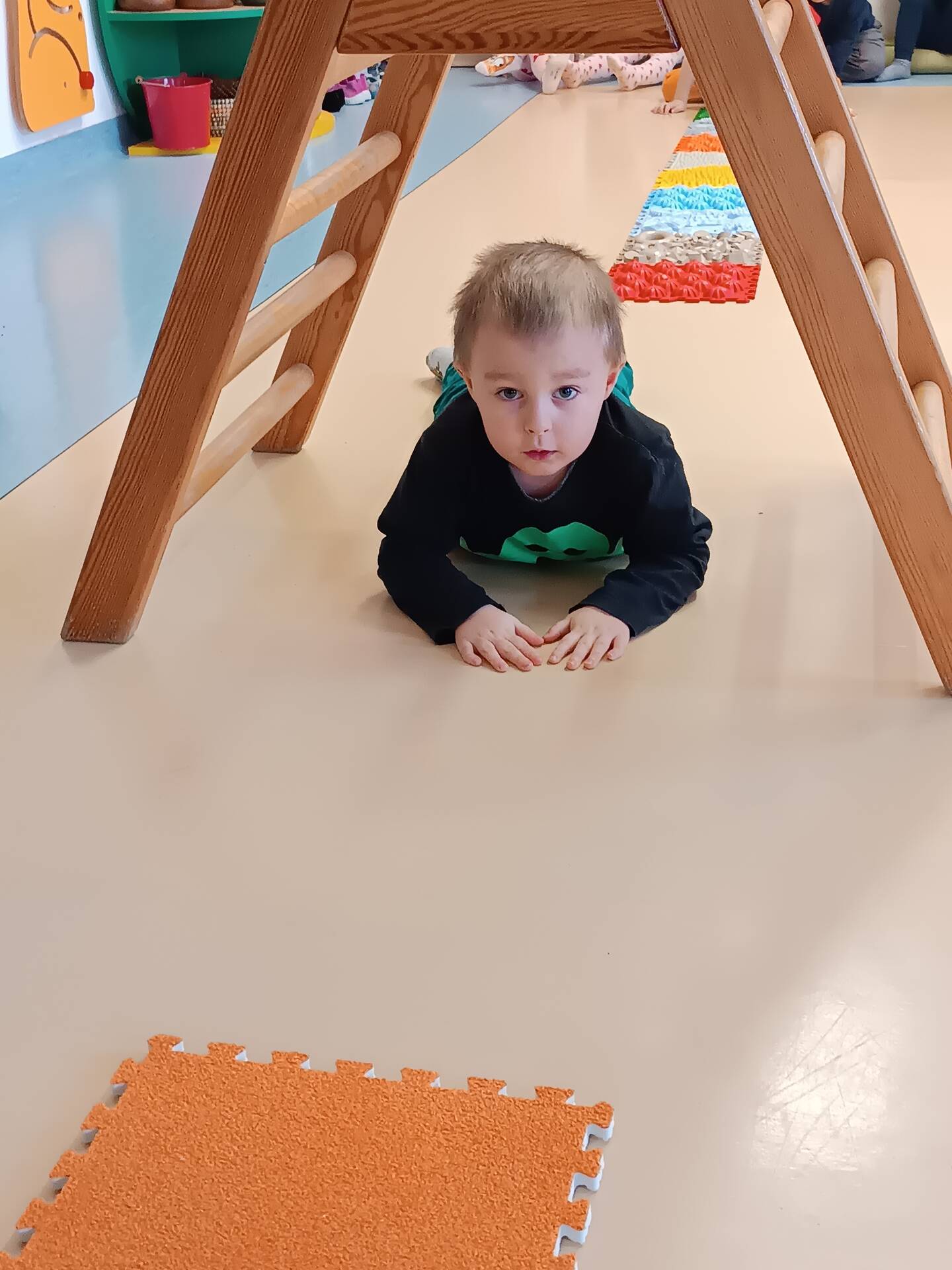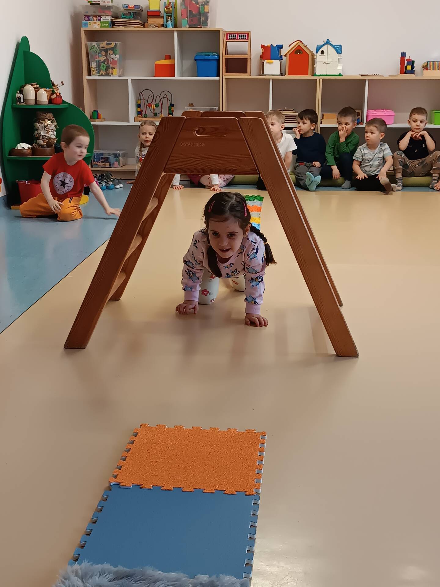 Pierwszy dzień ferii dzieci z gr. Fiołków rozpoczęły bardzo aktywnie biorąc udział w przygotowanym torze przeszkód z użyciem Bukinów sensolyke oraz ścieżek sensorycznych. Rozwijały motorykę dużą oraz korordynację wzrokowo – ruchową.