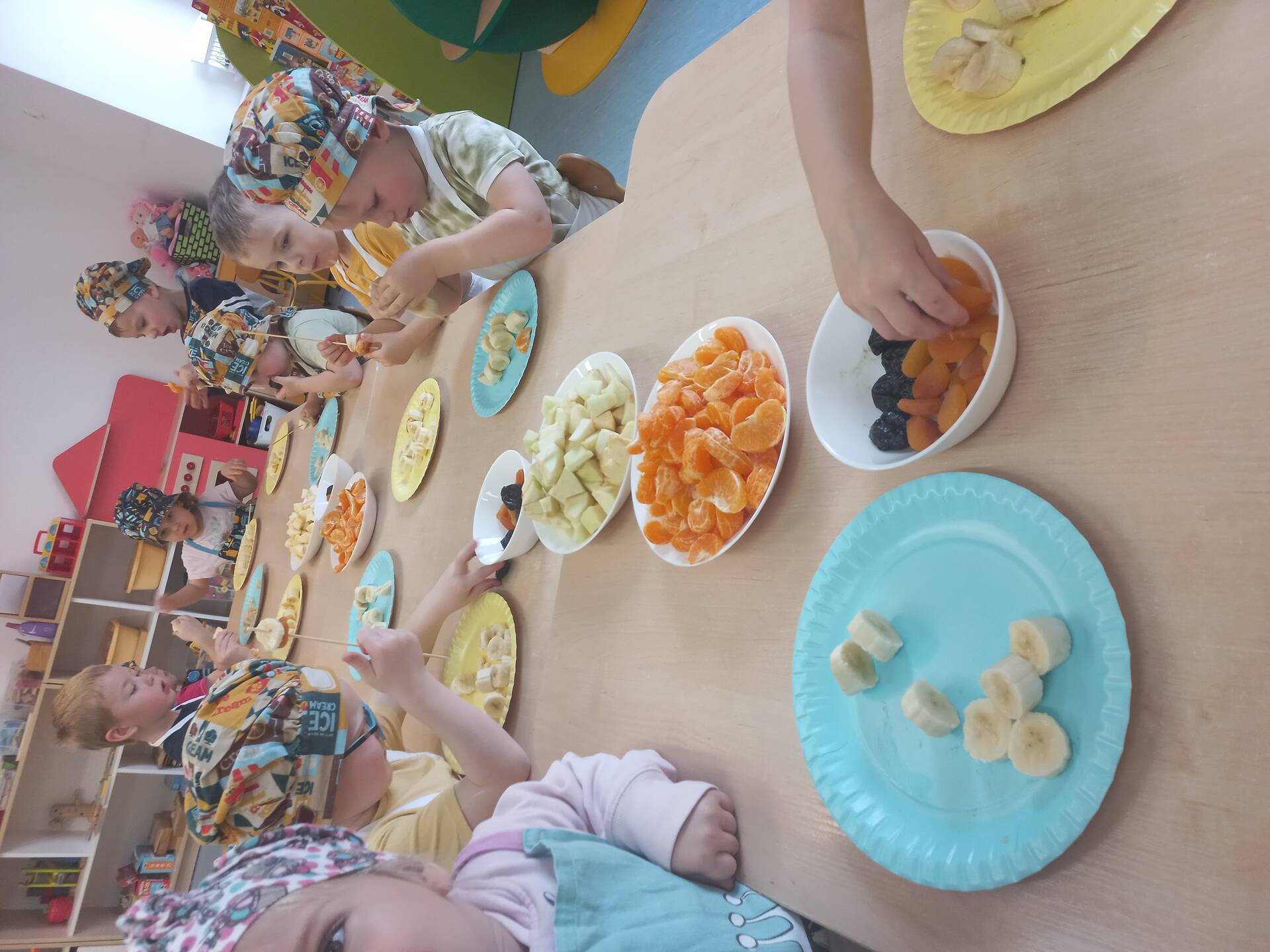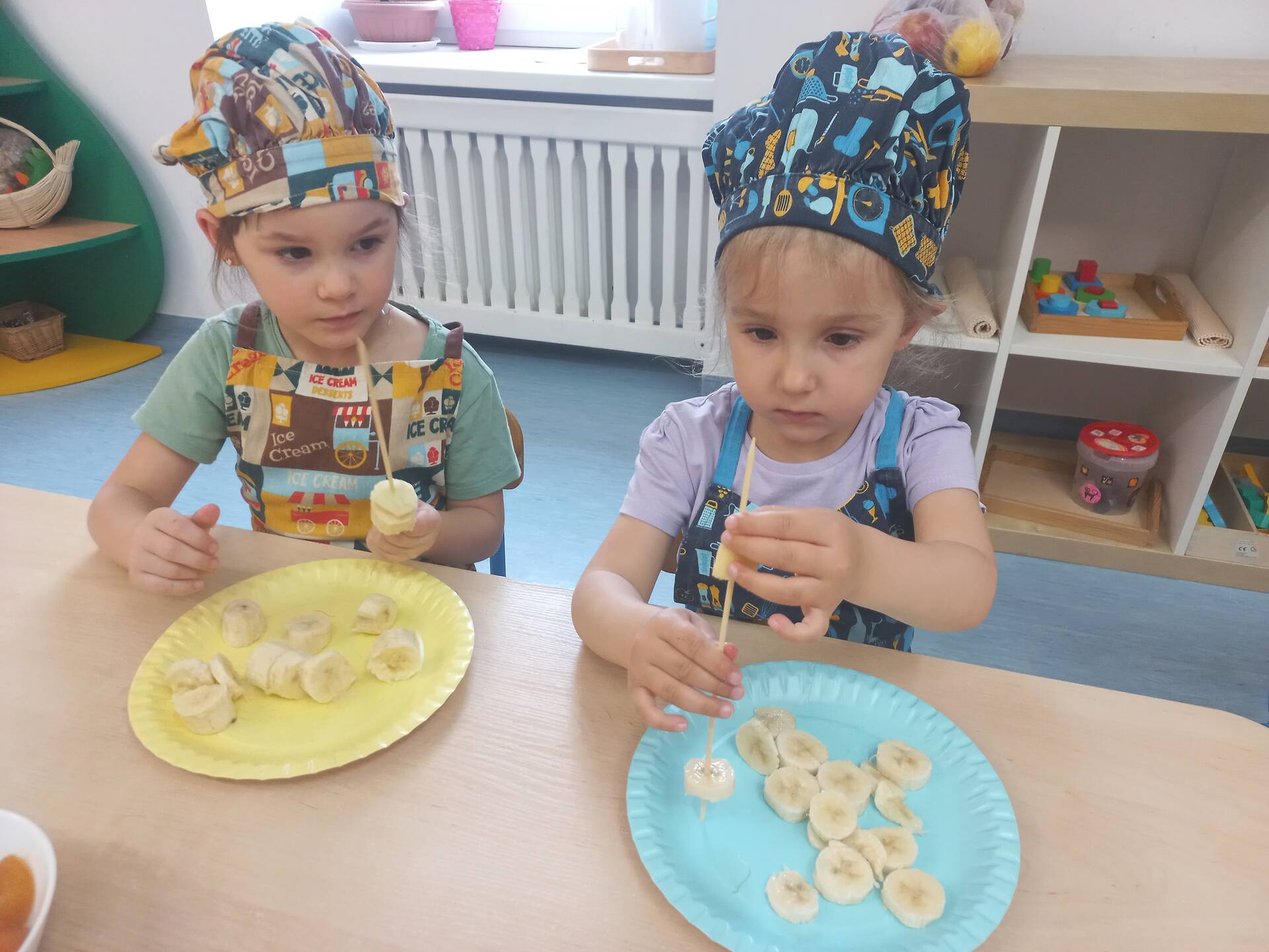 19.04.2024r. na zakończenie comiesięcznych warsztatów kulinarnych przygotowaliśmy owocowe szaszłyki. Samodzielnie pokroiliśmy banany i skomponowaliśmy swoje szaszłyki. Każdy wybierał swoje ulubione owoce.