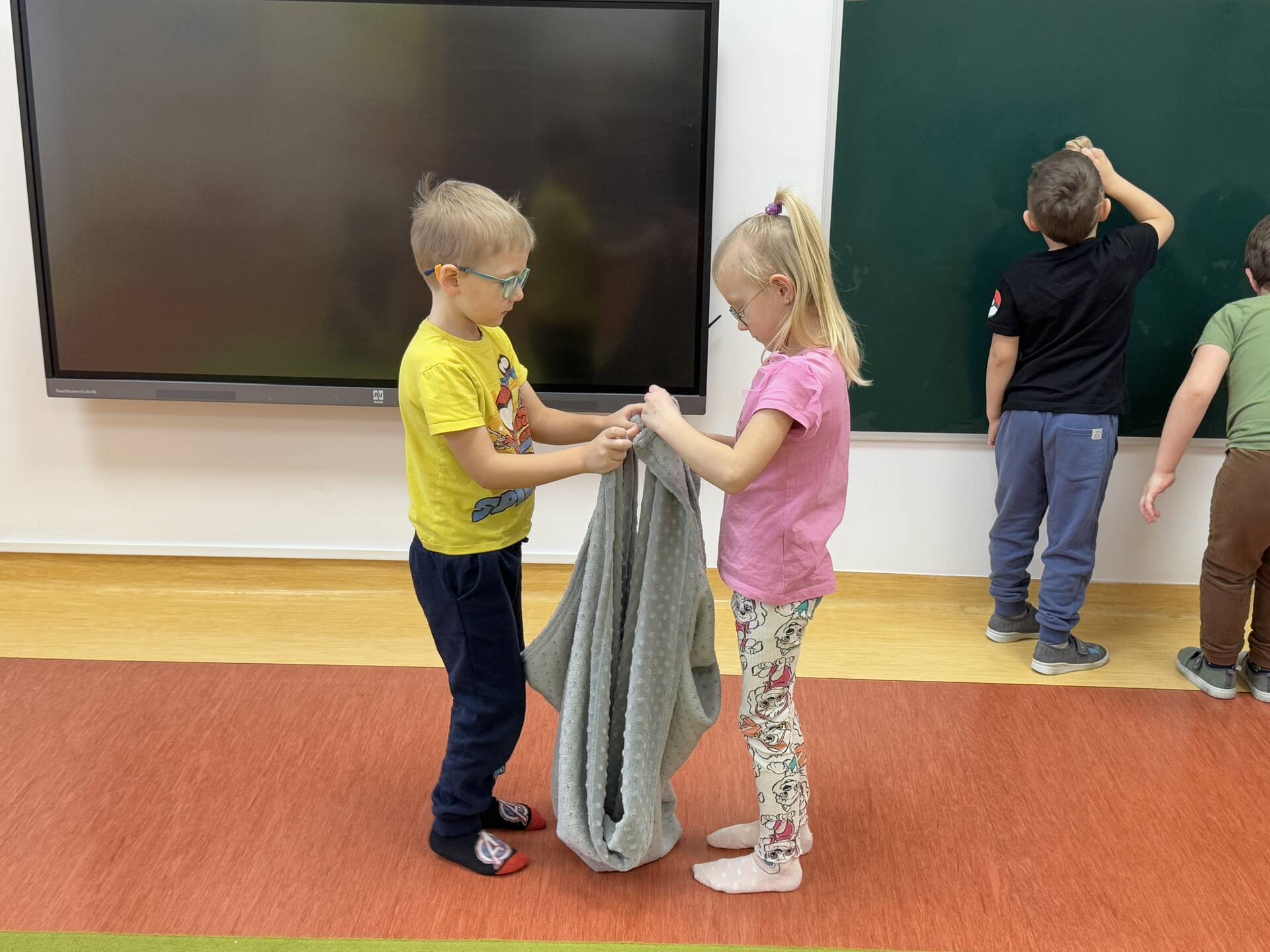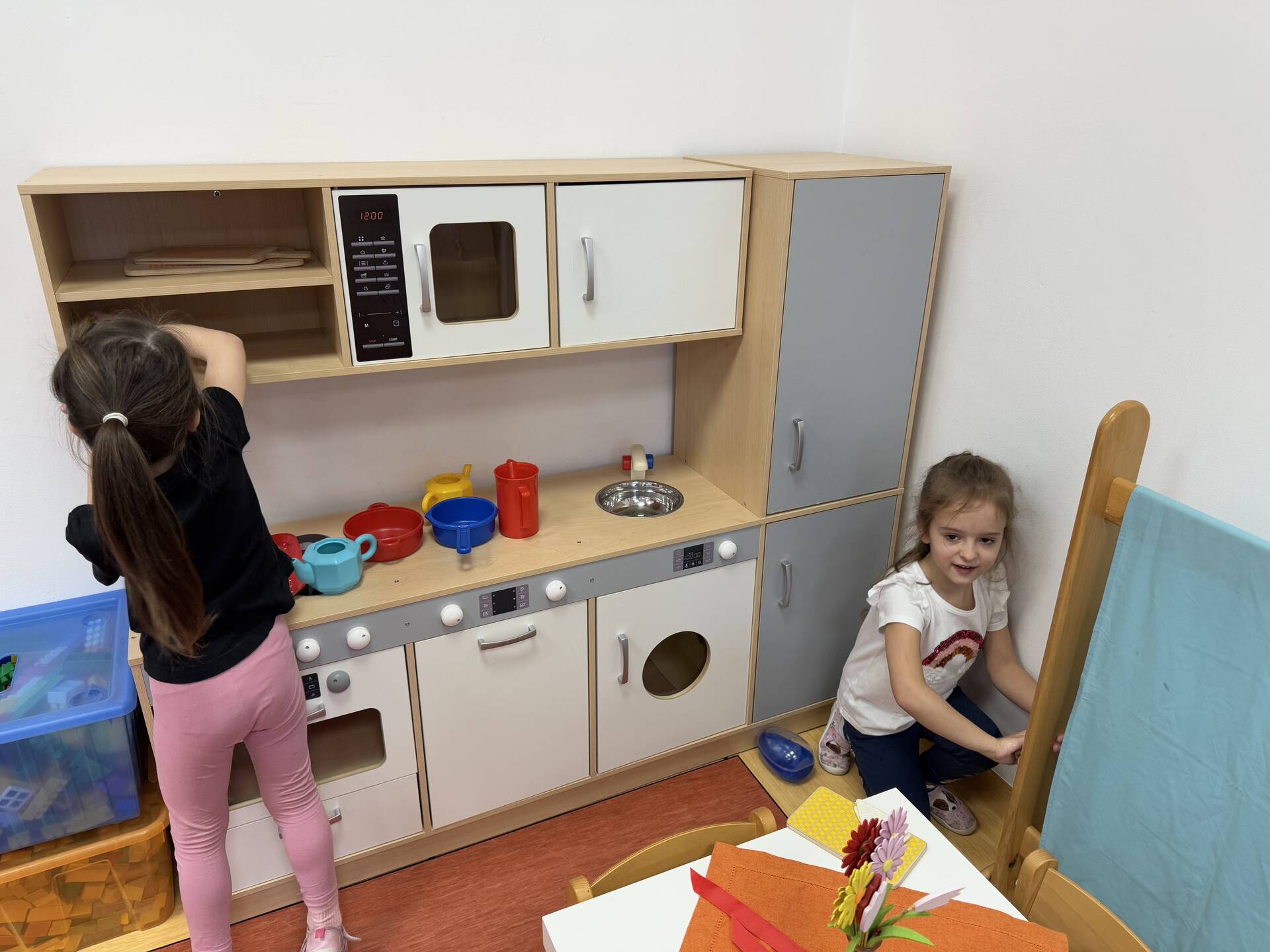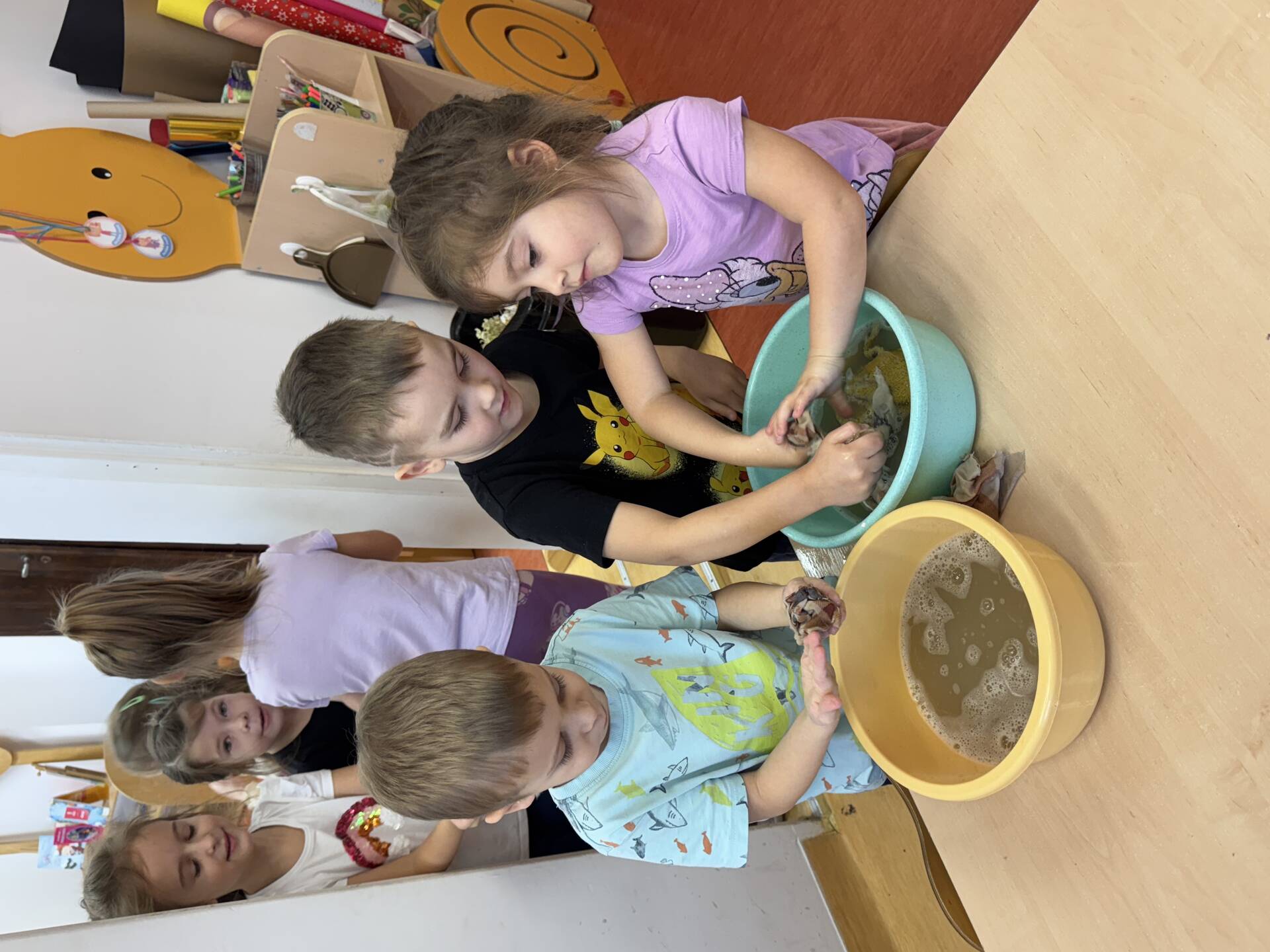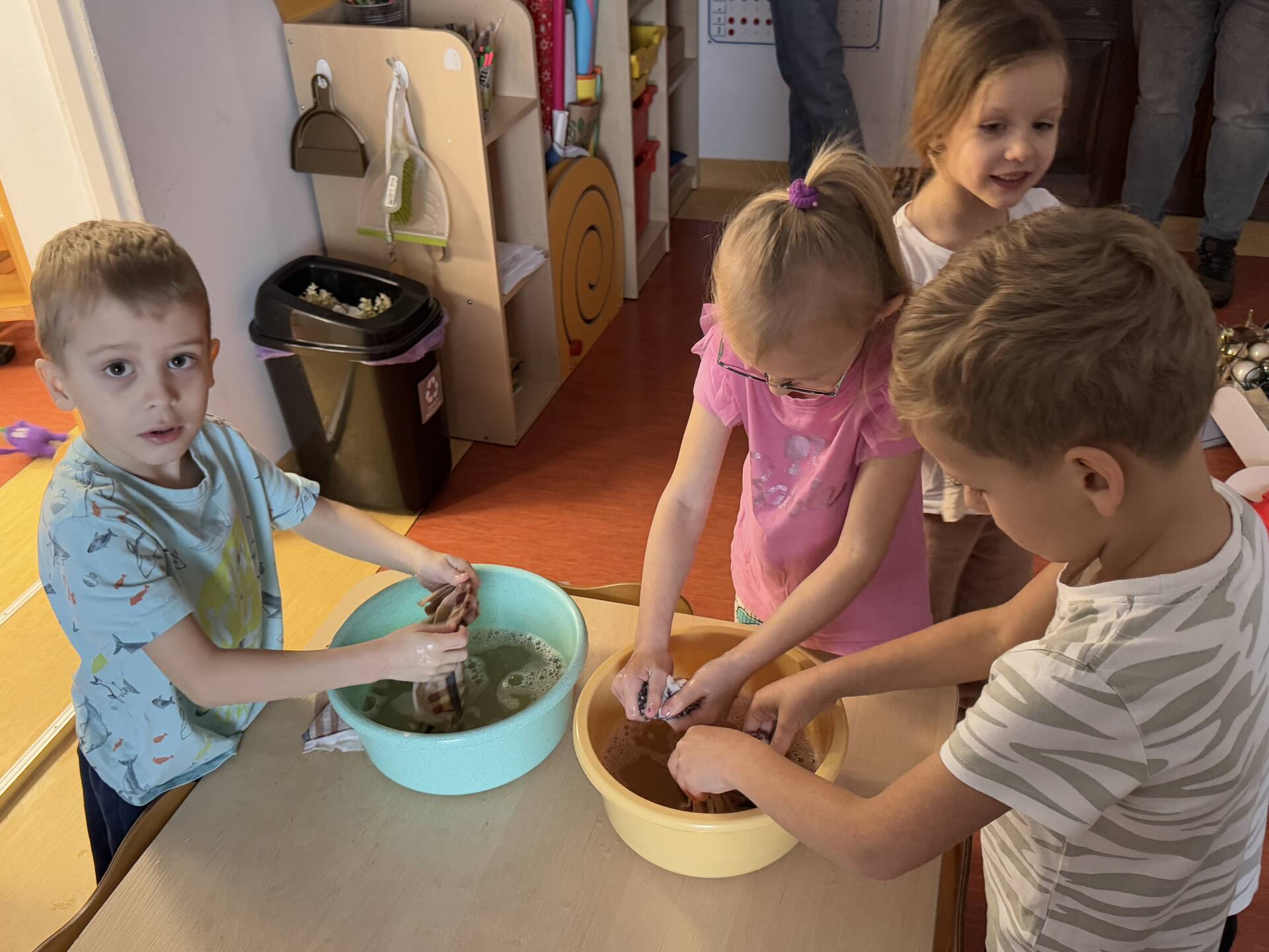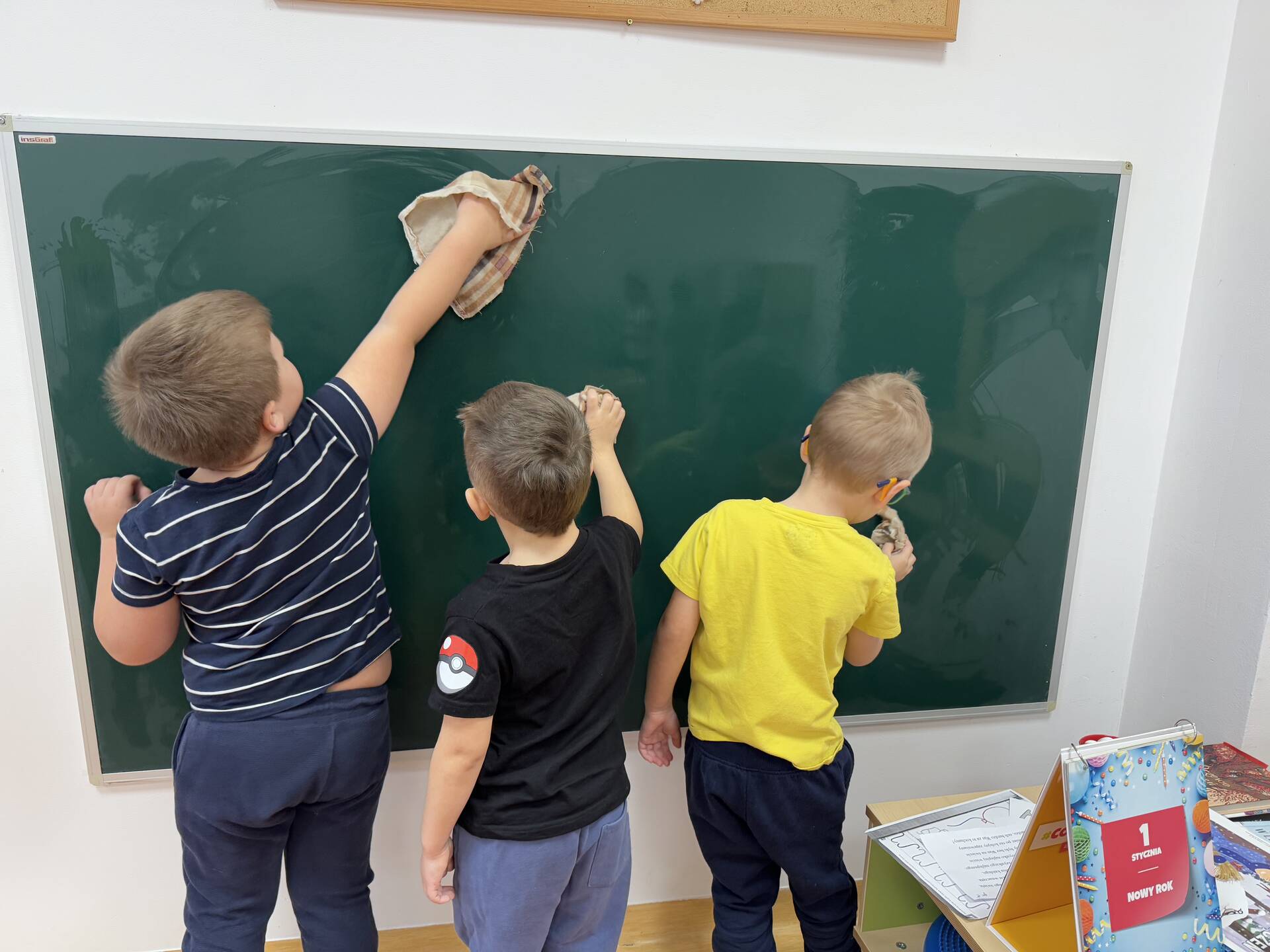Piątek gospodarczy u „Bławatków”. Dzieci z wielkim zaangażowaniem myły półki, układały zabawki, książeczki. Wszystko odbyło się w miłej atmosferze, której towarzyszyły dziecięce szlagiery. Tanecznym krokiem „Bławatki” posprzątały swoje sale.