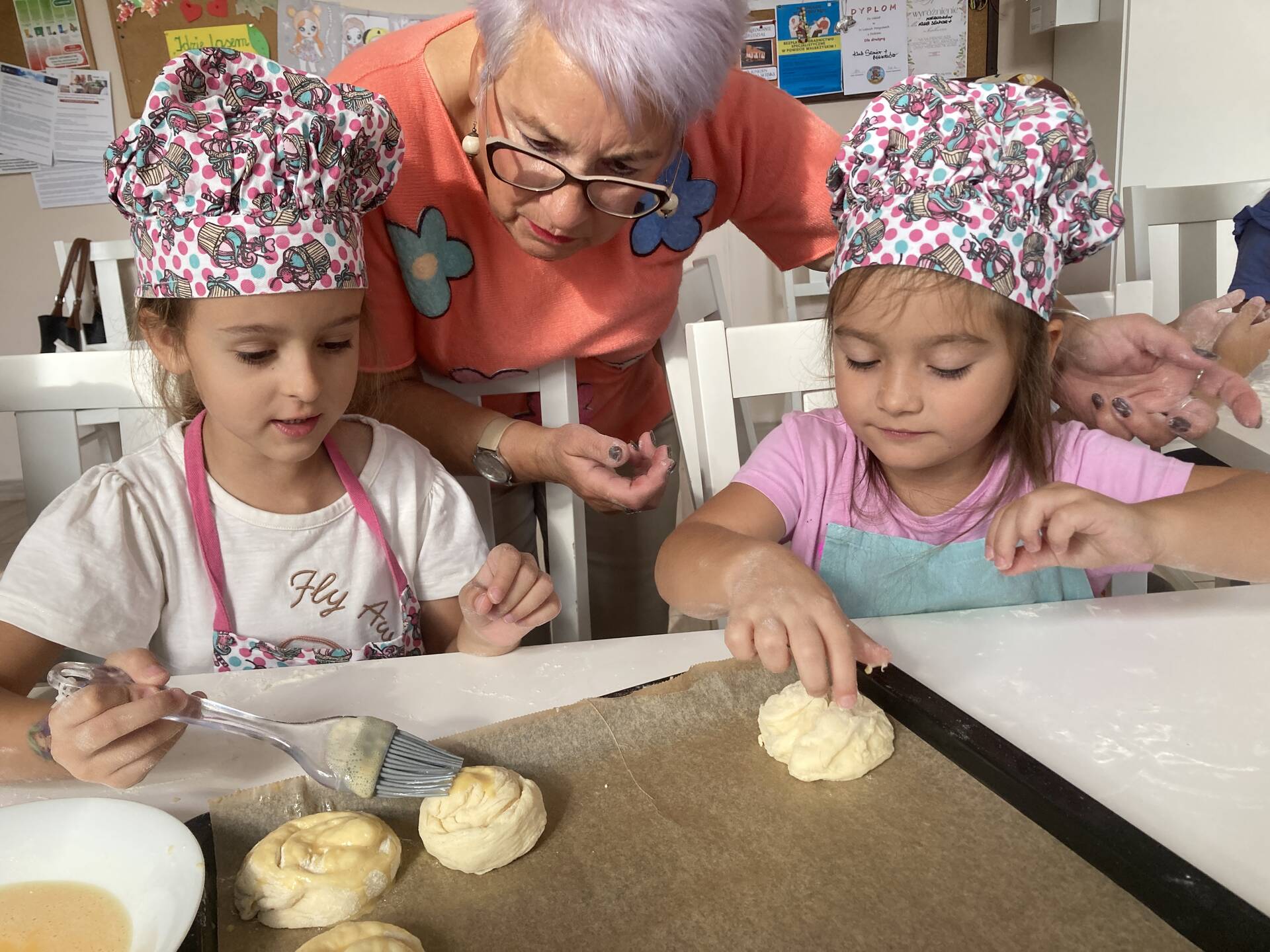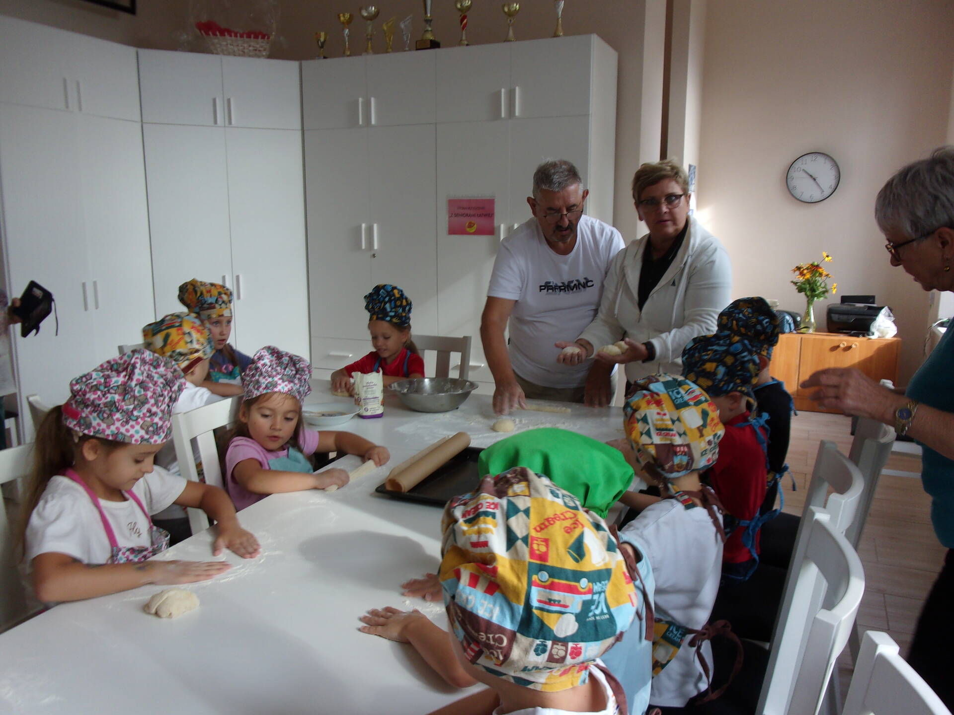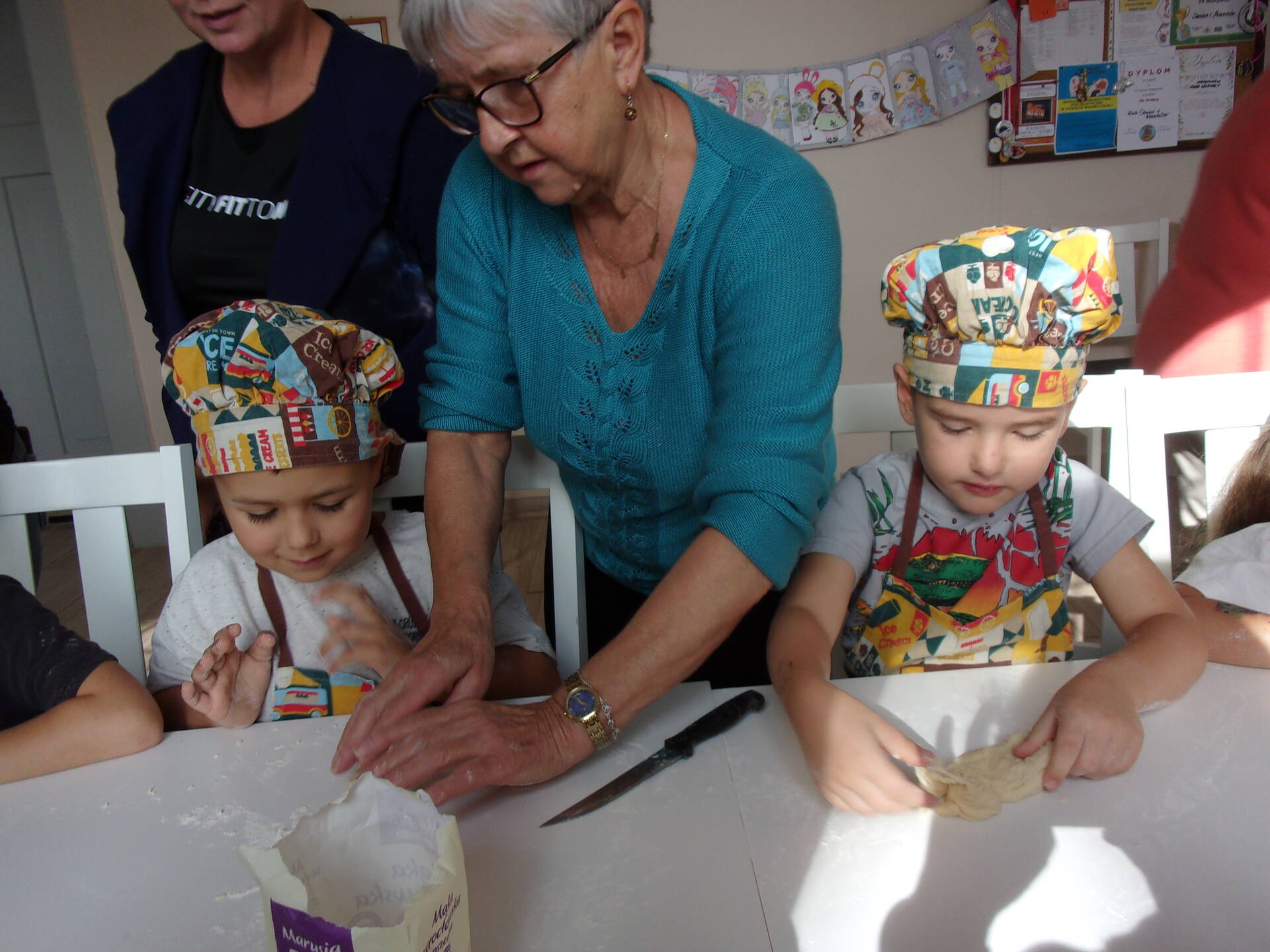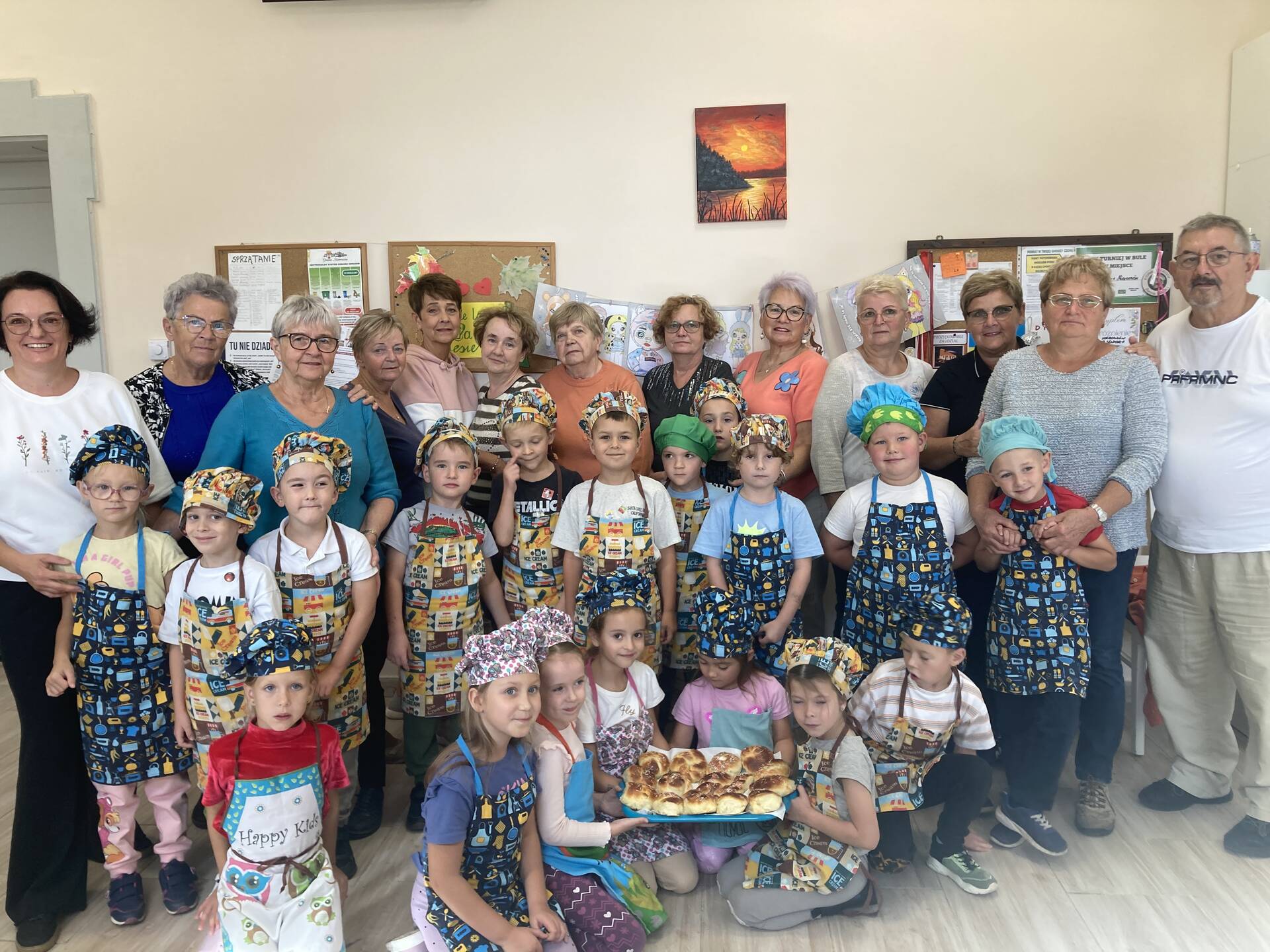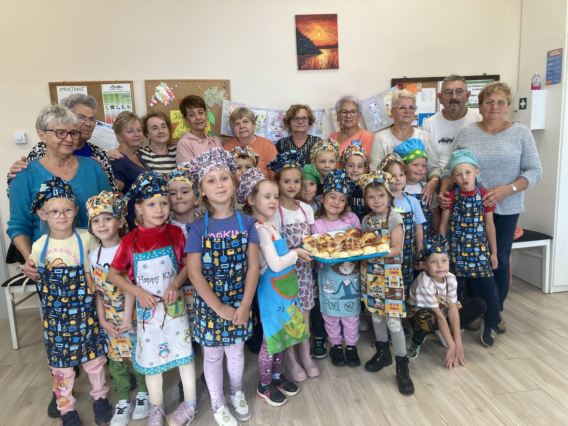 24.09.2025 Gr. V „Niezapominajki” uczestniczyła w warsztatach kulinarnych zorganizowanych przez Stowarzyszenie „Z Seniorami Łatwiej”. Dzieci pod nadzorem doświadczonego piekarza, pana Mikołaja Wiatrowa, wspólnie z seniorami upiekły pyszne drożdżowe bułeczki. Gdy bułki piekły się w piekarniku, Niezapominajki śpiewały seniorom piosenki o jesieni oraz kolorowały obrazki. Na koniec jeszcze wspólne zdjęcie – z pachnącymi wypiekami!