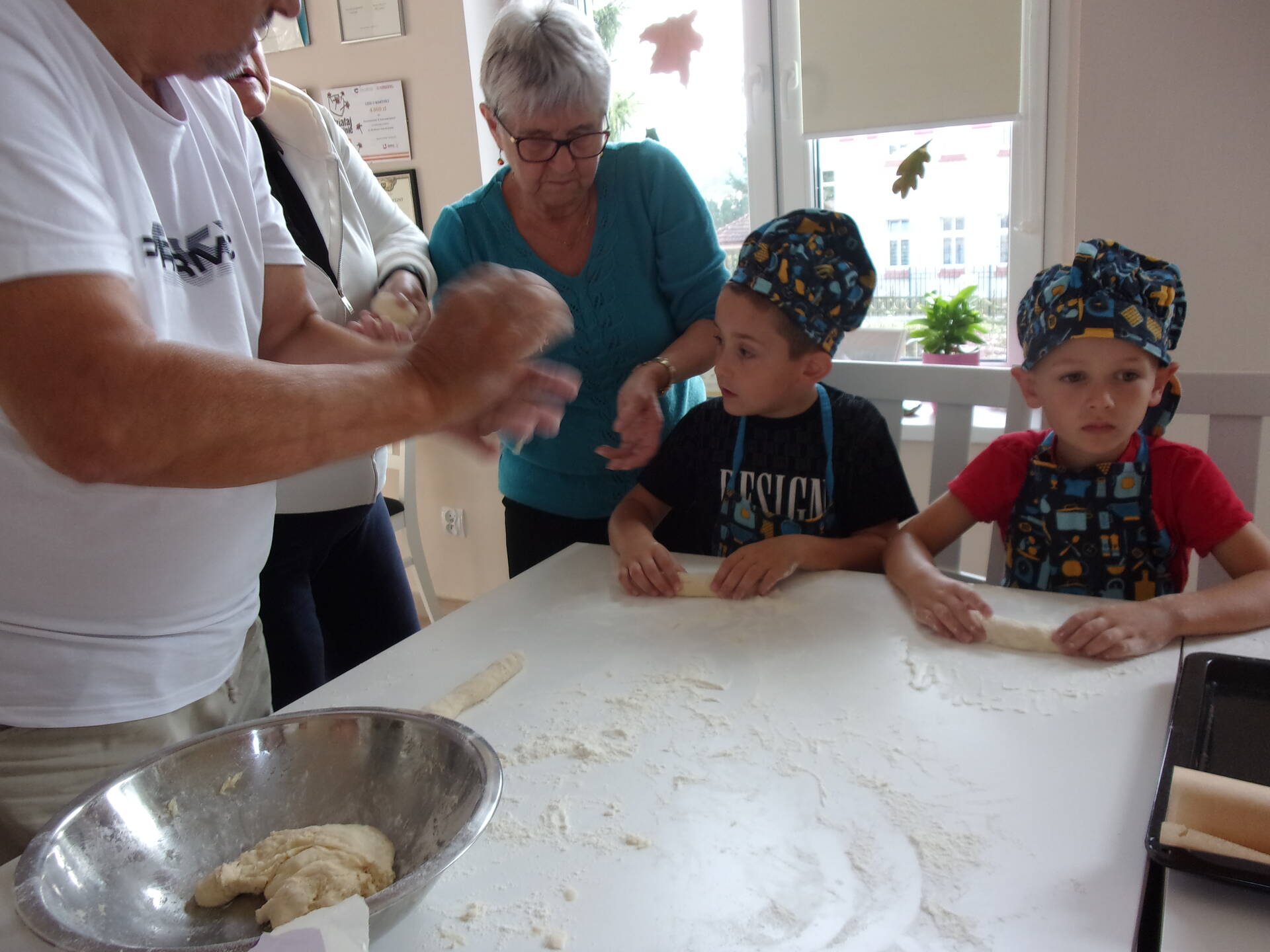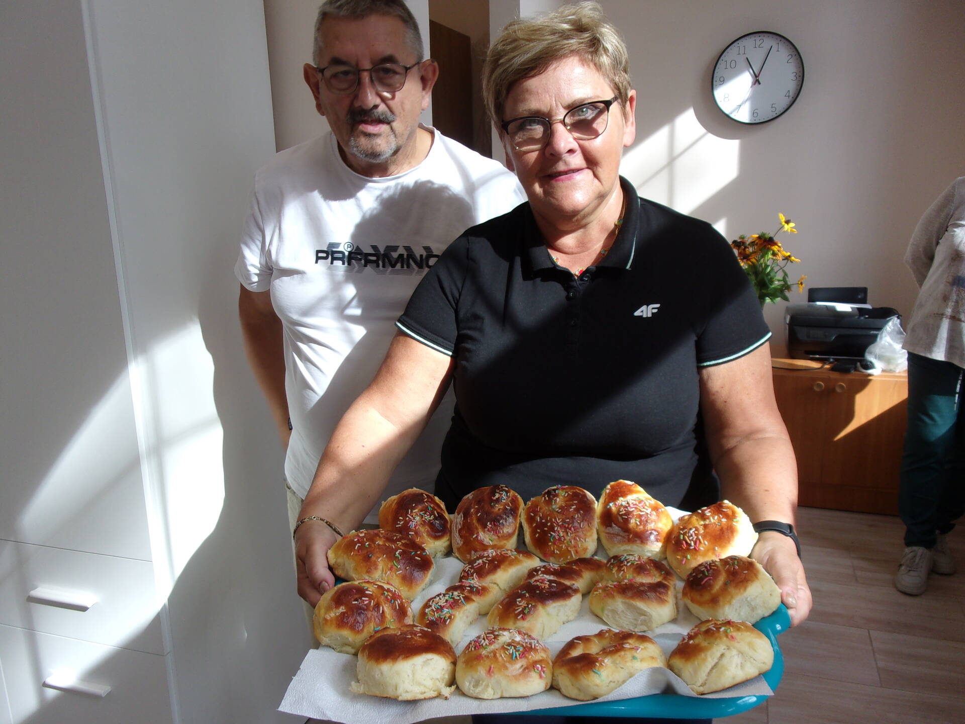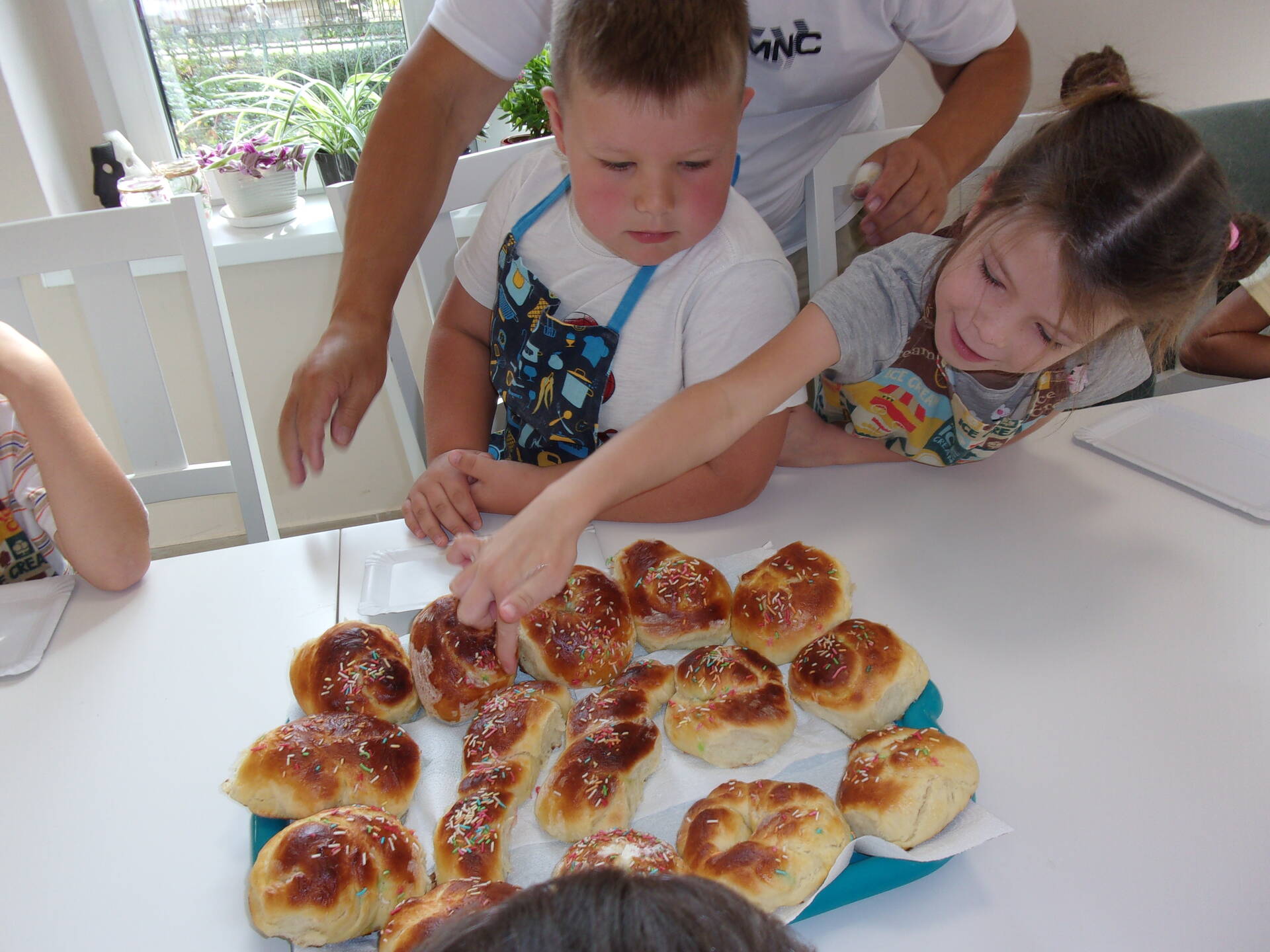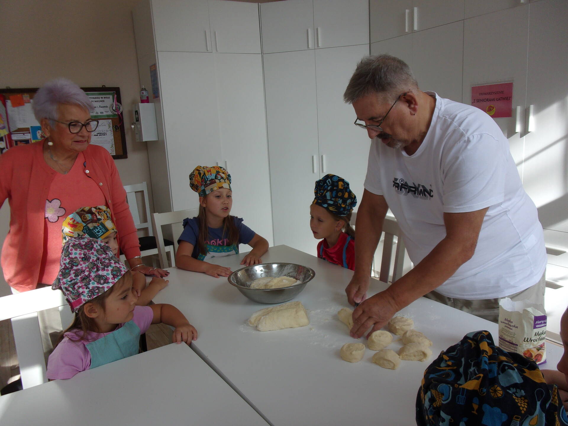 24.09.2025 Gr. V „Niezapominajki” uczestniczyła w warsztatach kulinarnych zorganizowanych przez Stowarzyszenie „Z Seniorami Łatwiej”. Dzieci pod nadzorem doświadczonego piekarza, pana Mikołaja Wiatrowa, wspólnie z seniorami upiekły pyszne drożdżowe bułeczki. Gdy bułki piekły się w piekarniku, Niezapominajki śpiewały seniorom piosenki o jesieni oraz kolorowały obrazki. Na koniec jeszcze wspólne zdjęcie – z pachnącymi wypiekami!