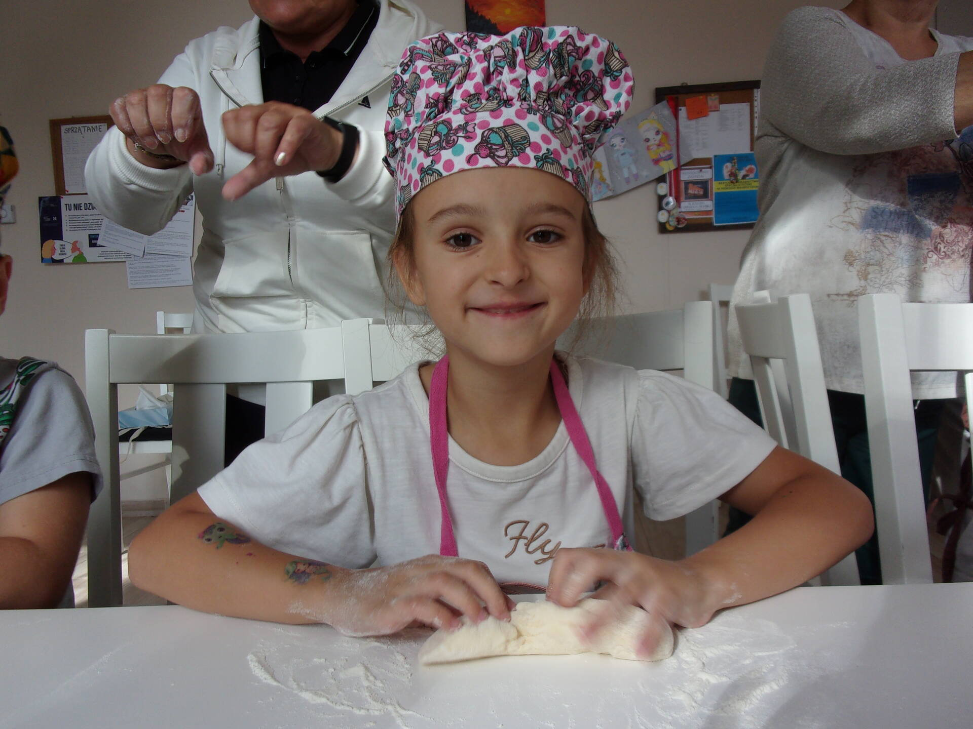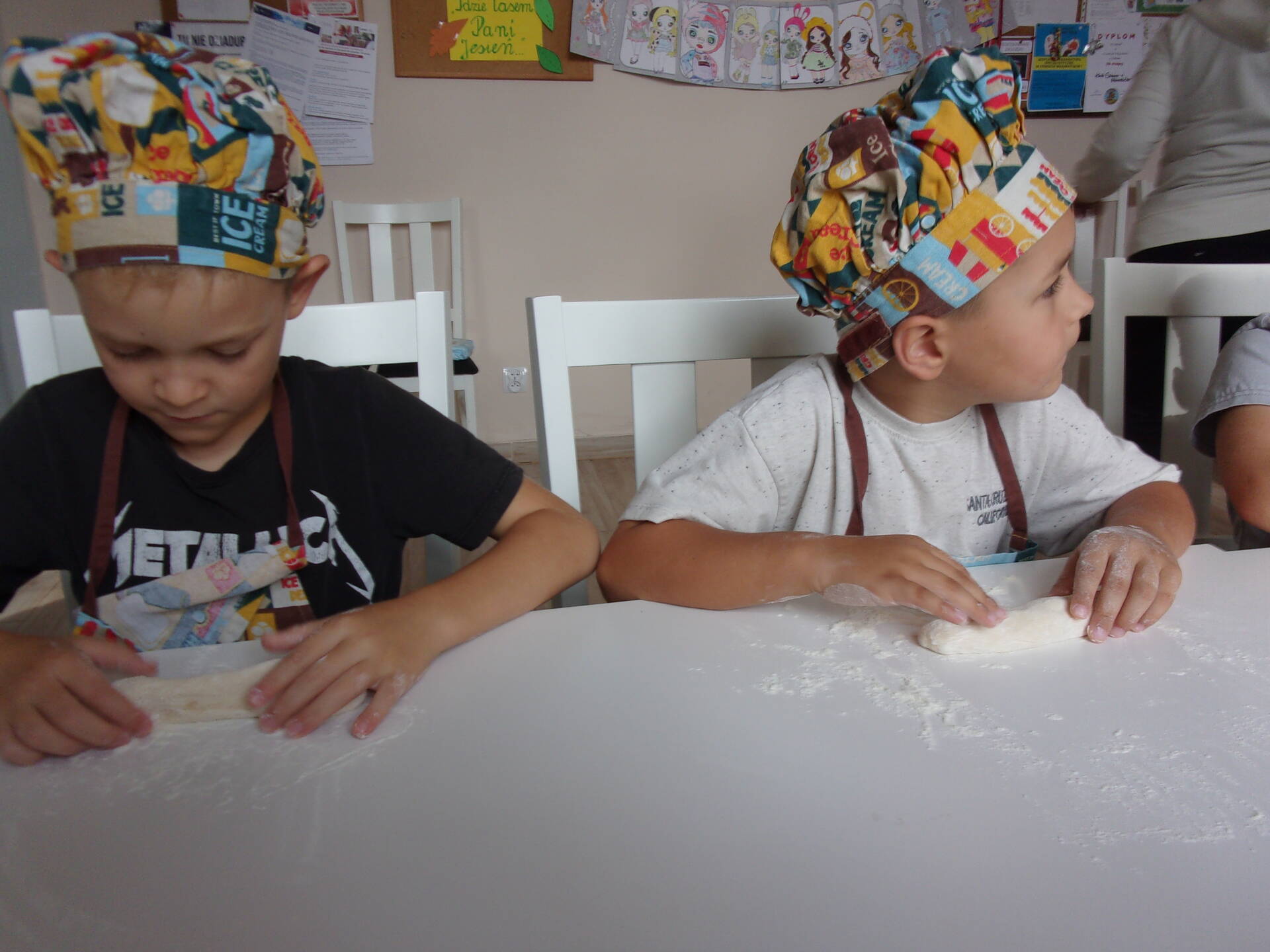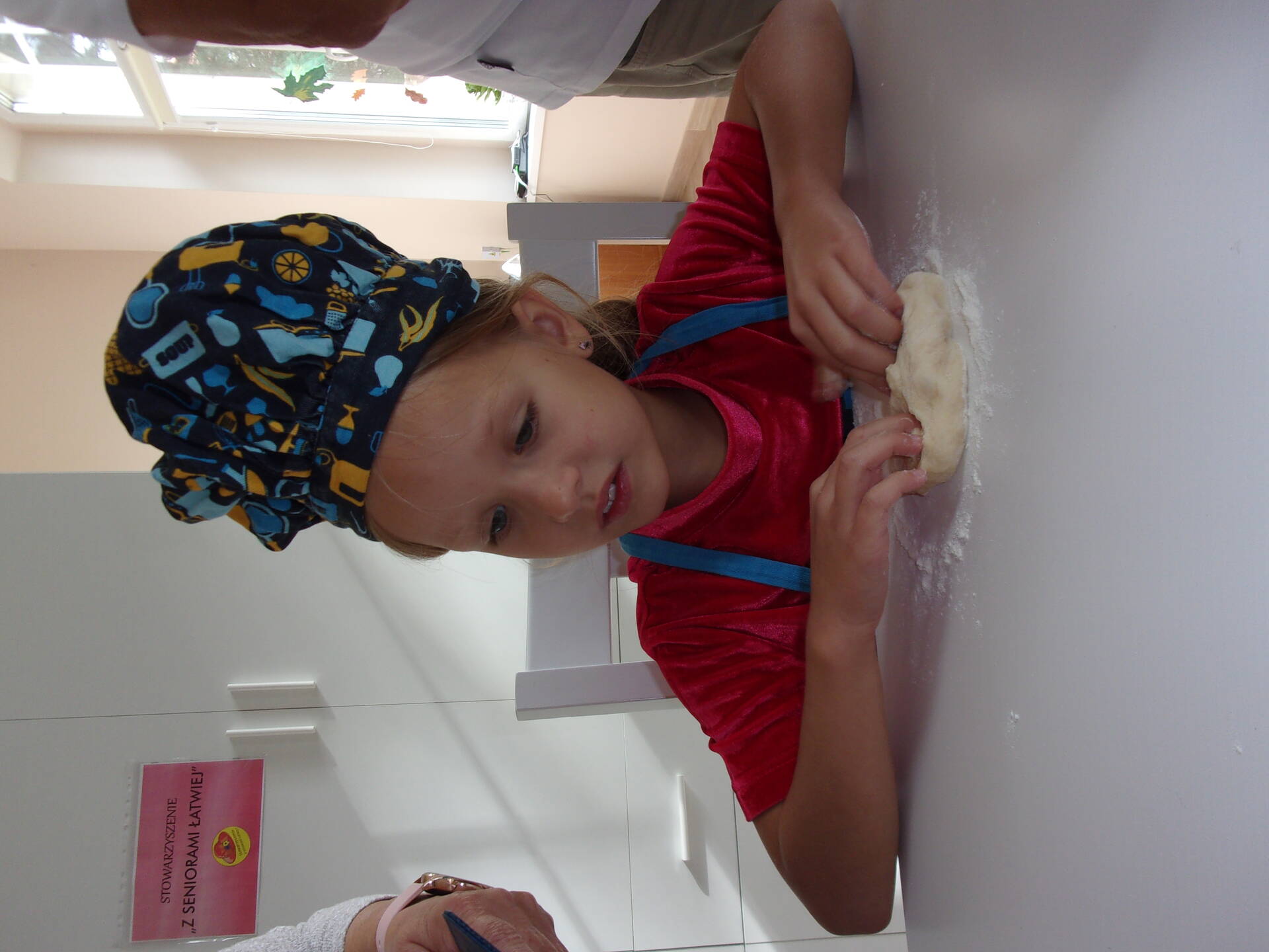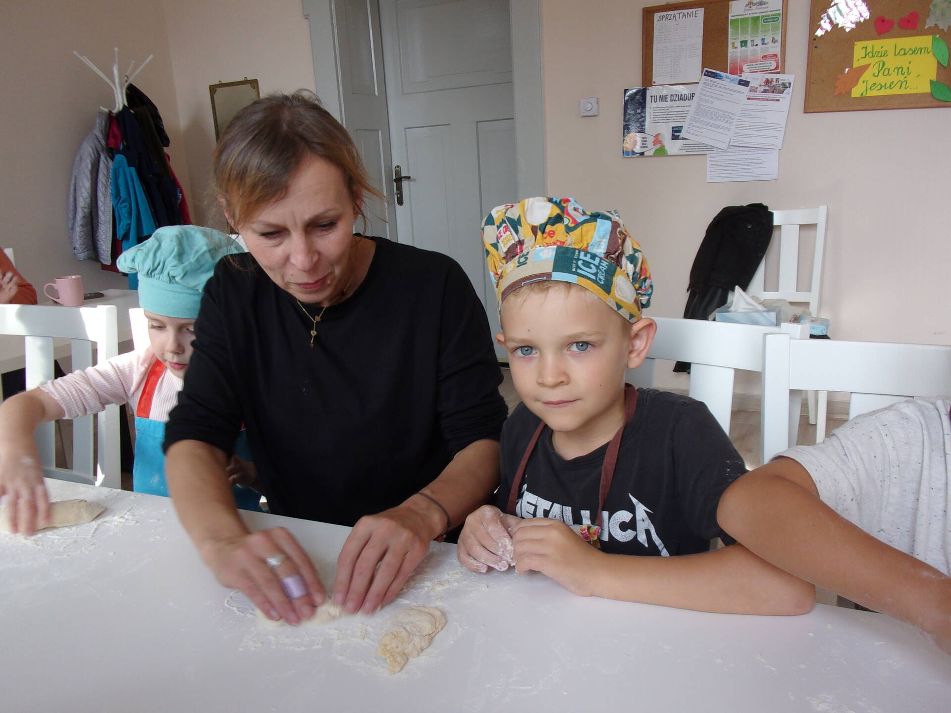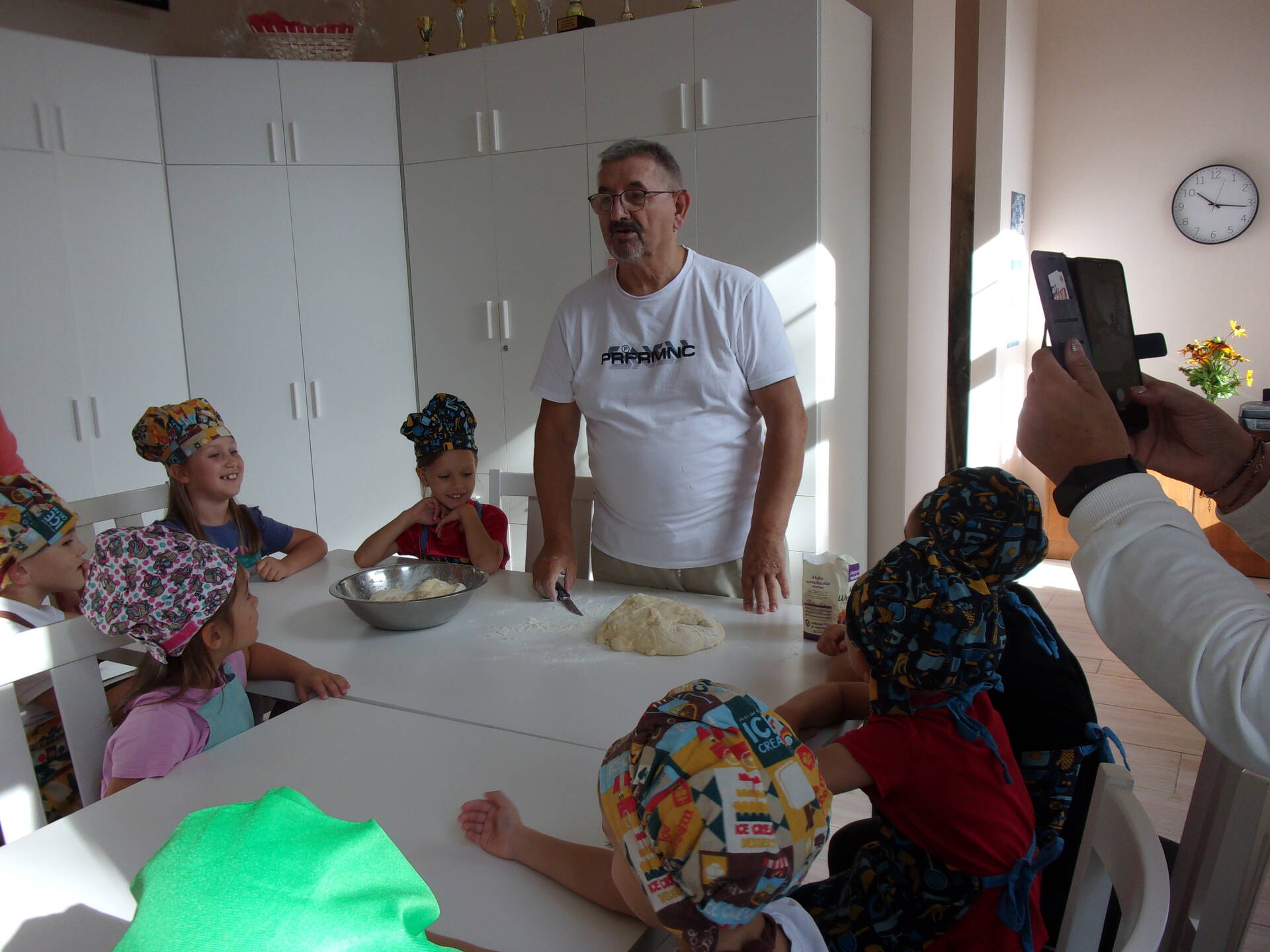 24.09.2025 Gr. V „Niezapominajki” uczestniczyła w warsztatach kulinarnych zorganizowanych przez Stowarzyszenie „Z Seniorami Łatwiej”. Dzieci pod nadzorem doświadczonego piekarza, pana Mikołaja Wiatrowa, wspólnie z seniorami upiekły pyszne drożdżowe bułeczki. Gdy bułki piekły się w piekarniku, Niezapominajki śpiewały seniorom piosenki o jesieni oraz kolorowały obrazki. Na koniec jeszcze wspólne zdjęcie – z pachnącymi wypiekami!