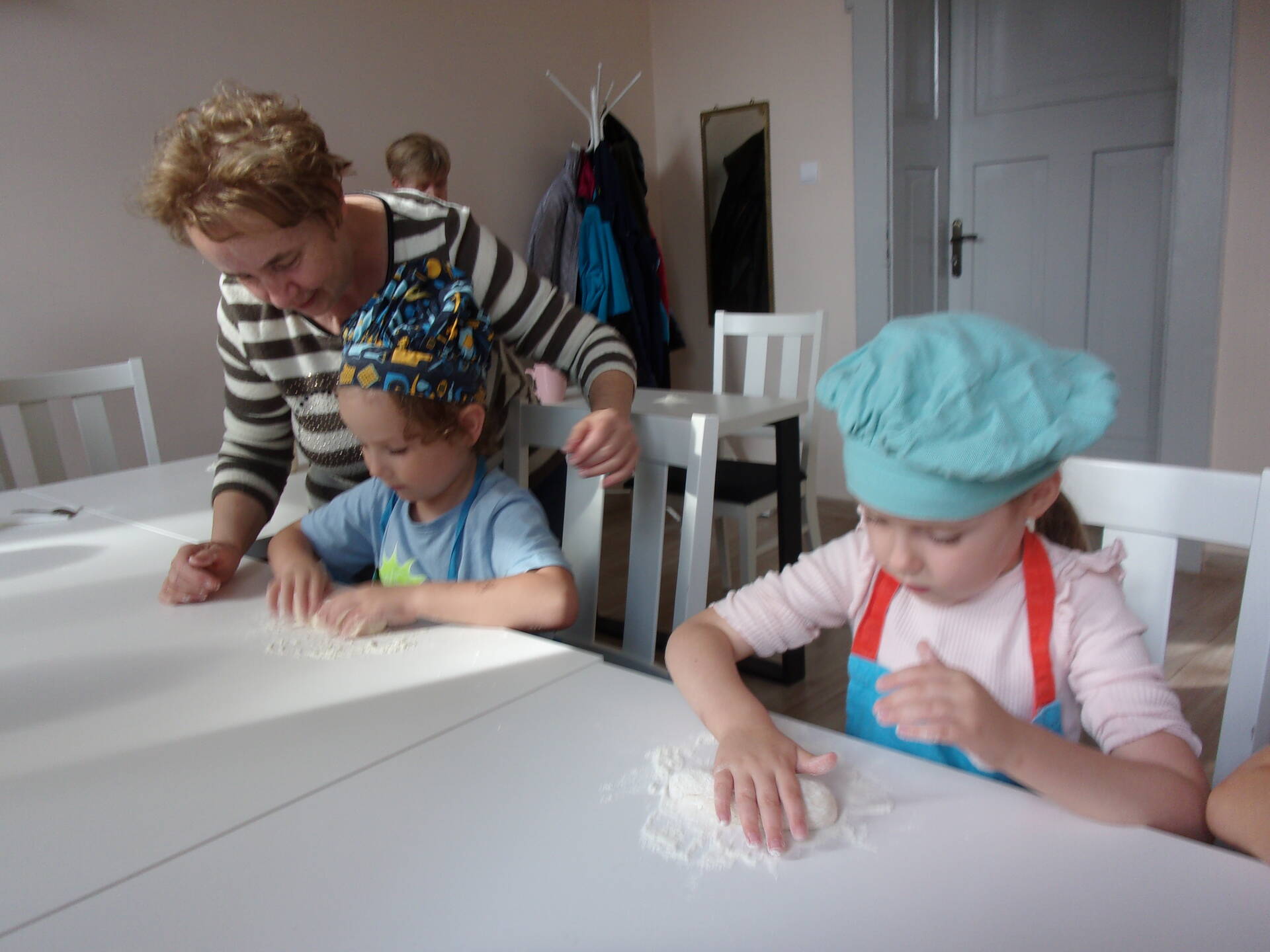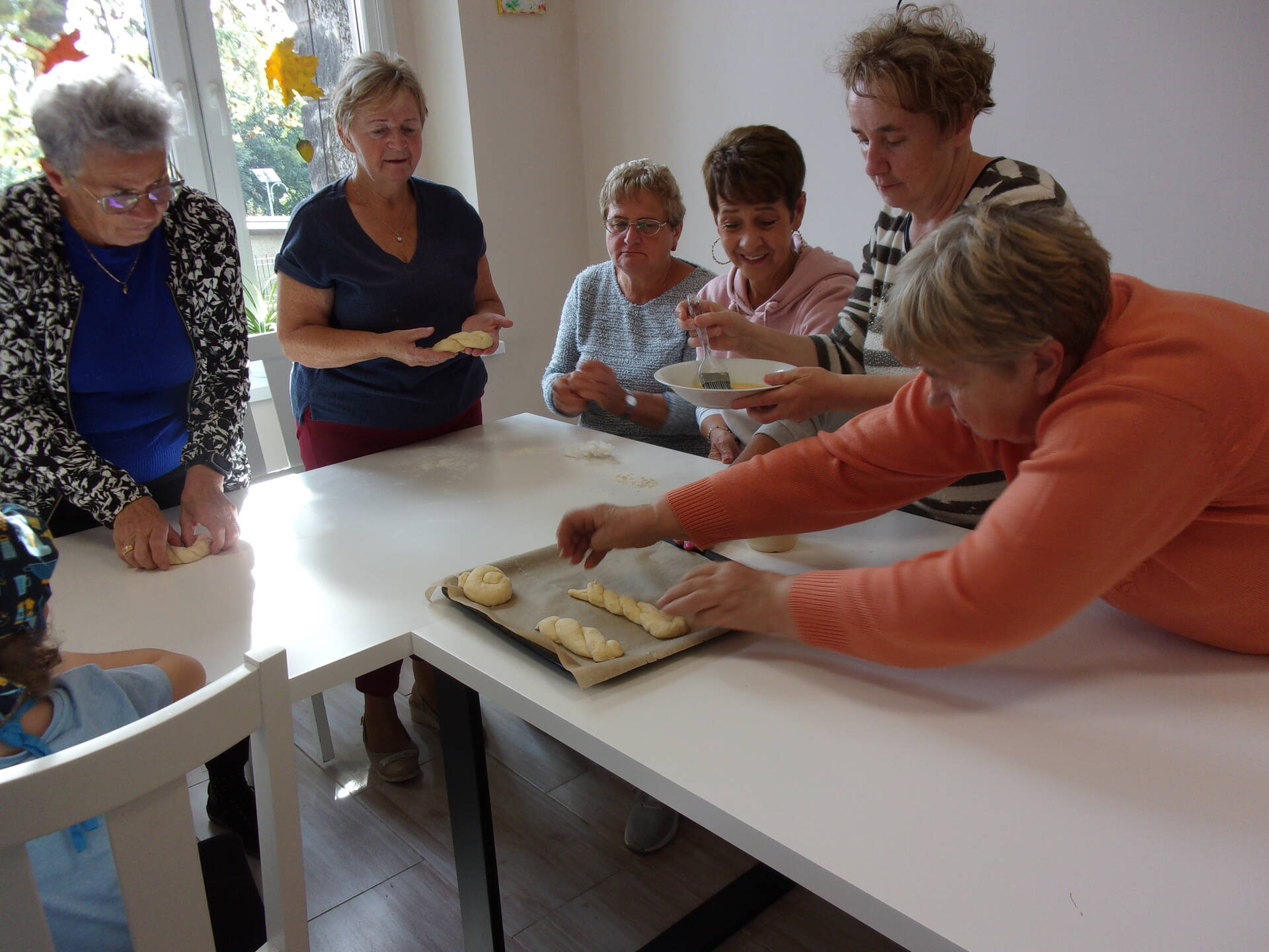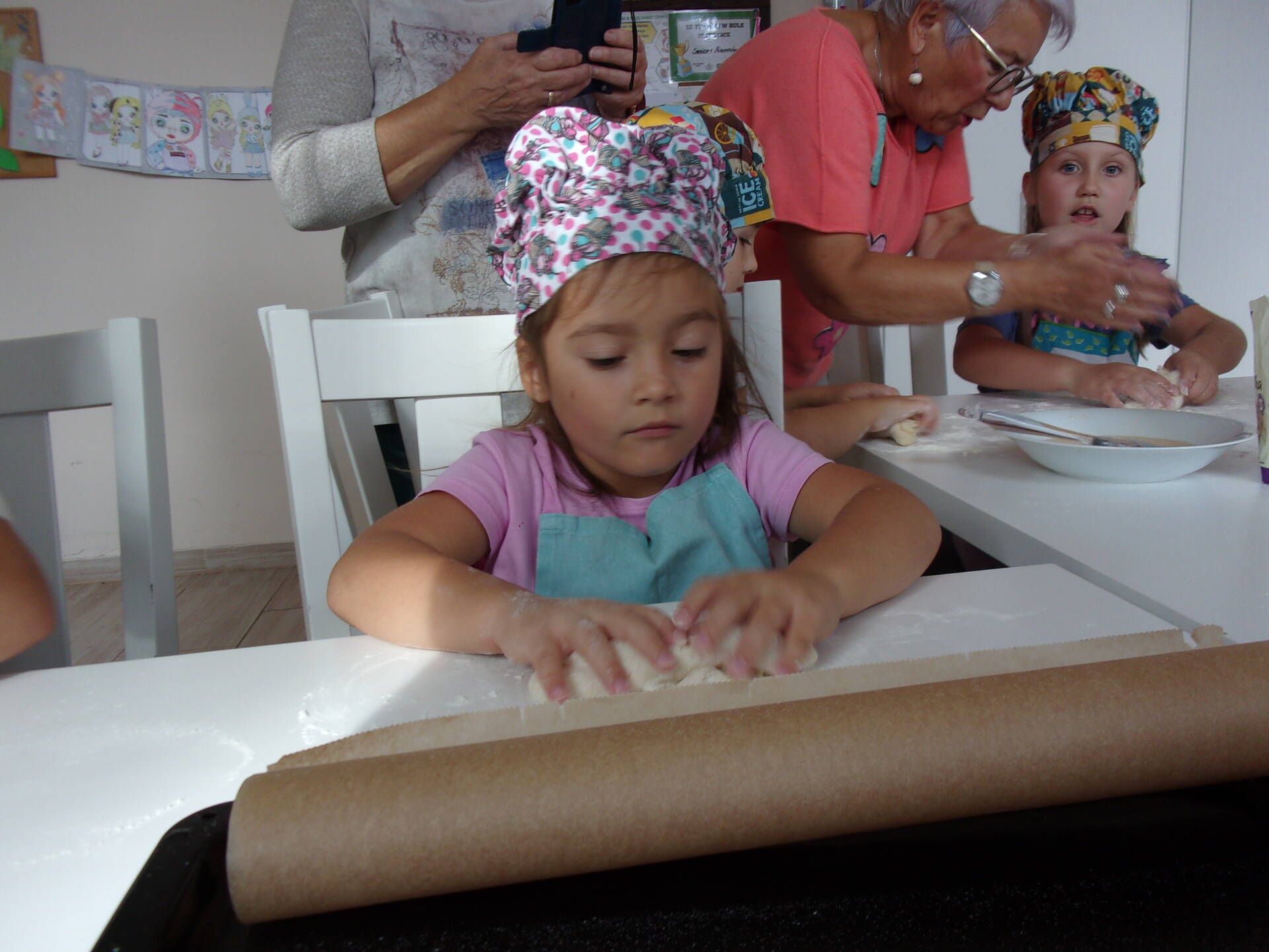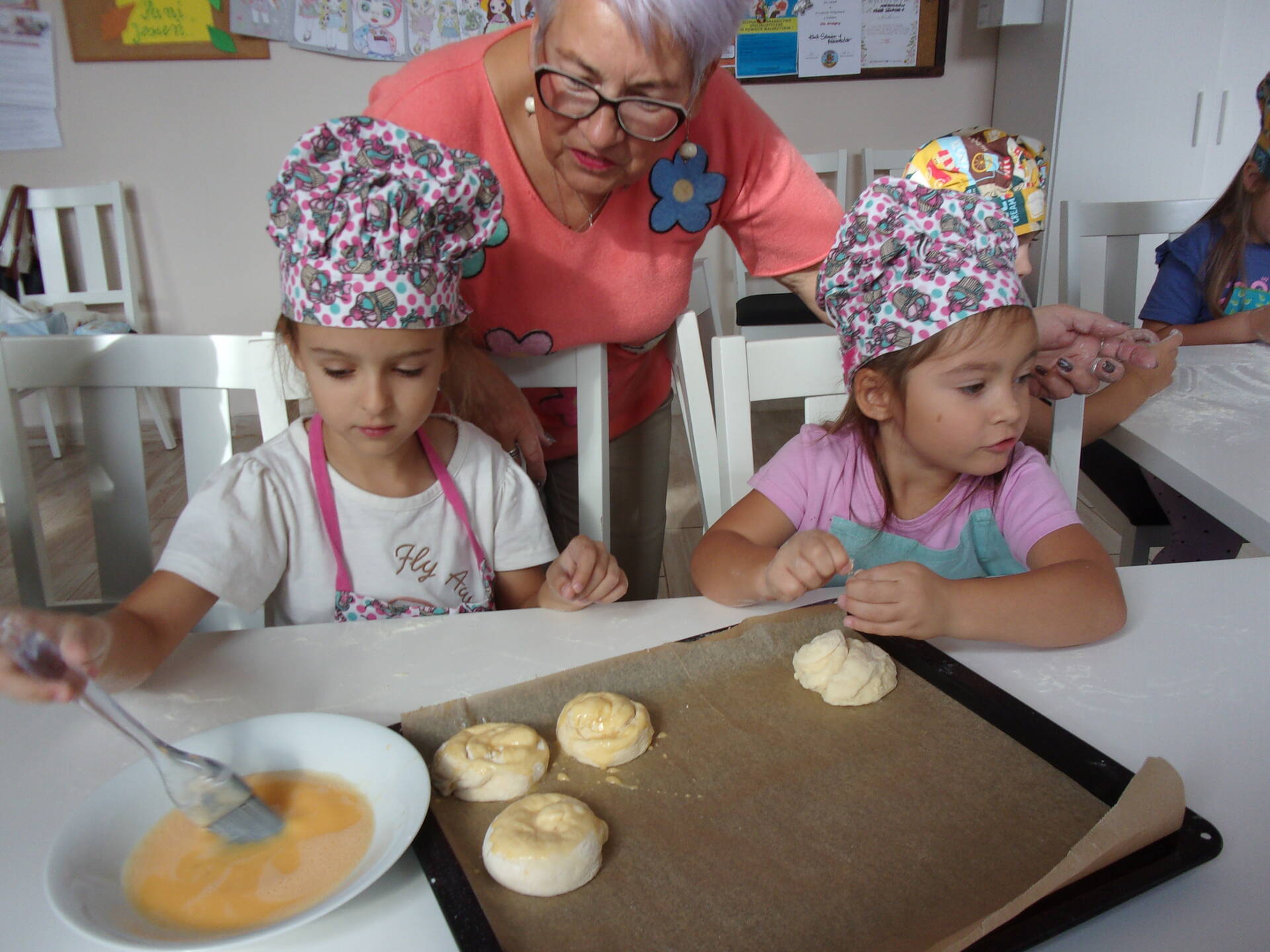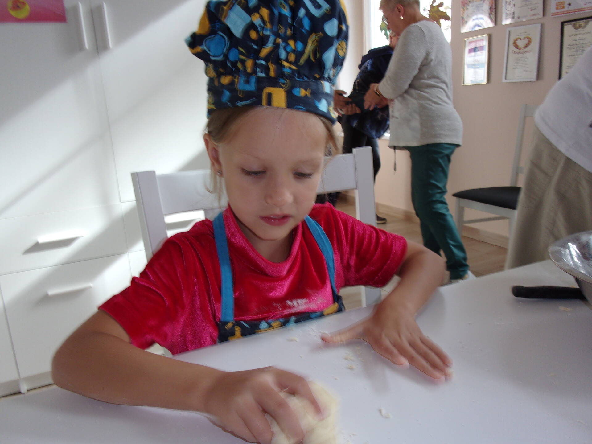 24.09.2025 Gr. V „Niezapominajki” uczestniczyła w warsztatach kulinarnych zorganizowanych przez Stowarzyszenie „Z Seniorami Łatwiej”. Dzieci pod nadzorem doświadczonego piekarza, pana Mikołaja Wiatrowa, wspólnie z seniorami upiekły pyszne drożdżowe bułeczki. Gdy bułki piekły się w piekarniku, Niezapominajki śpiewały seniorom piosenki o jesieni oraz kolorowały obrazki. Na koniec jeszcze wspólne zdjęcie – z pachnącymi wypiekami!