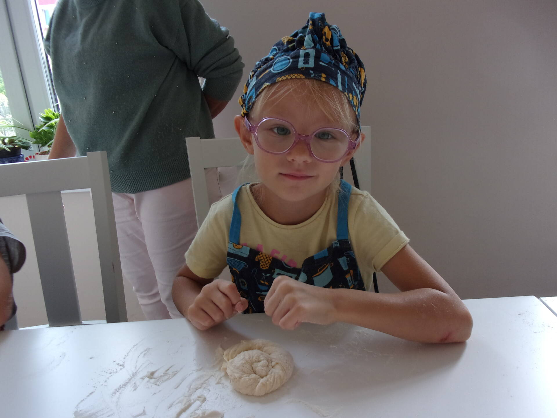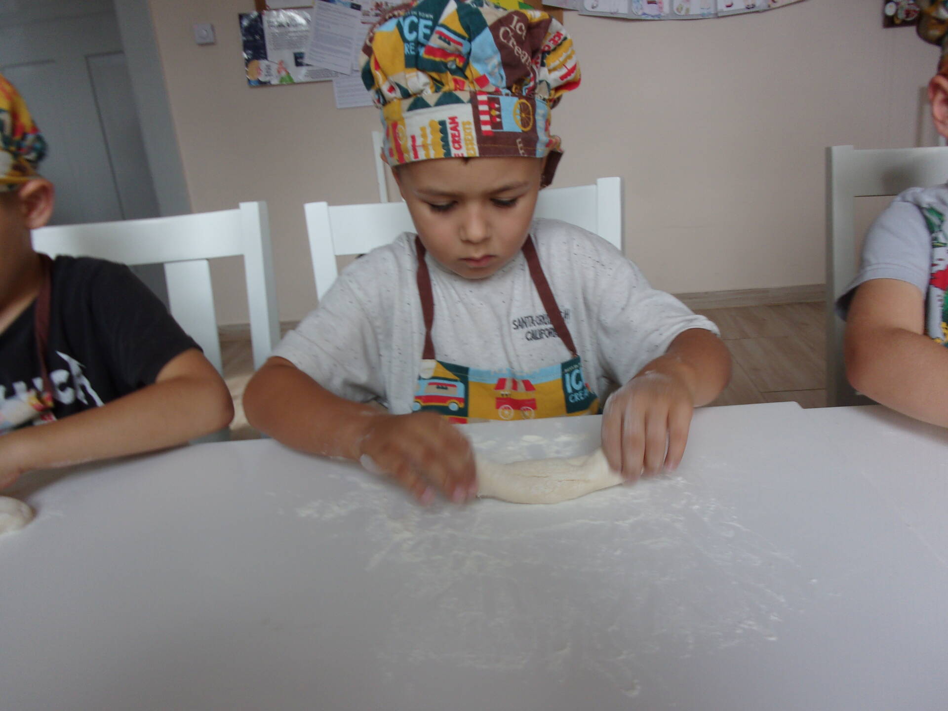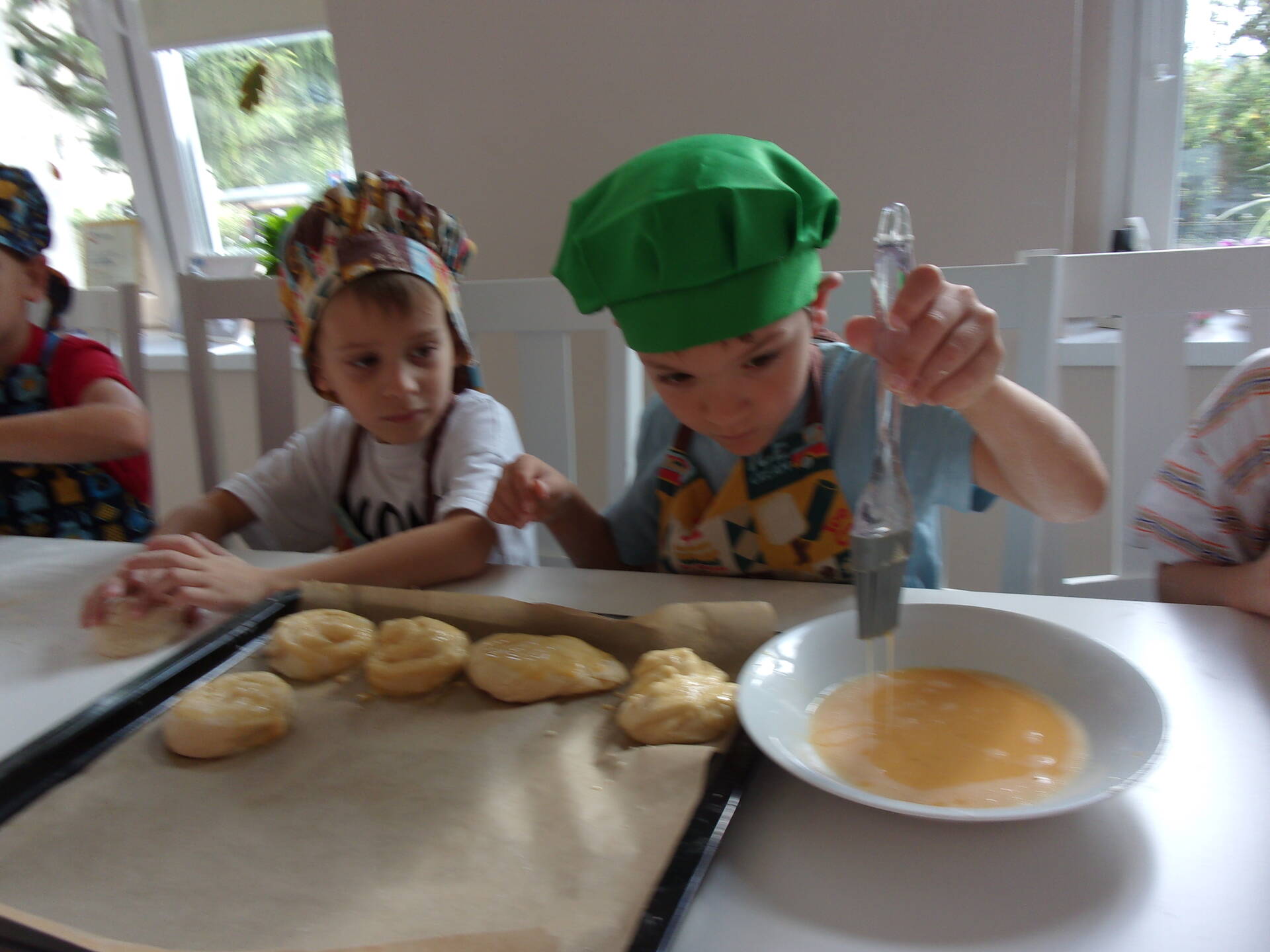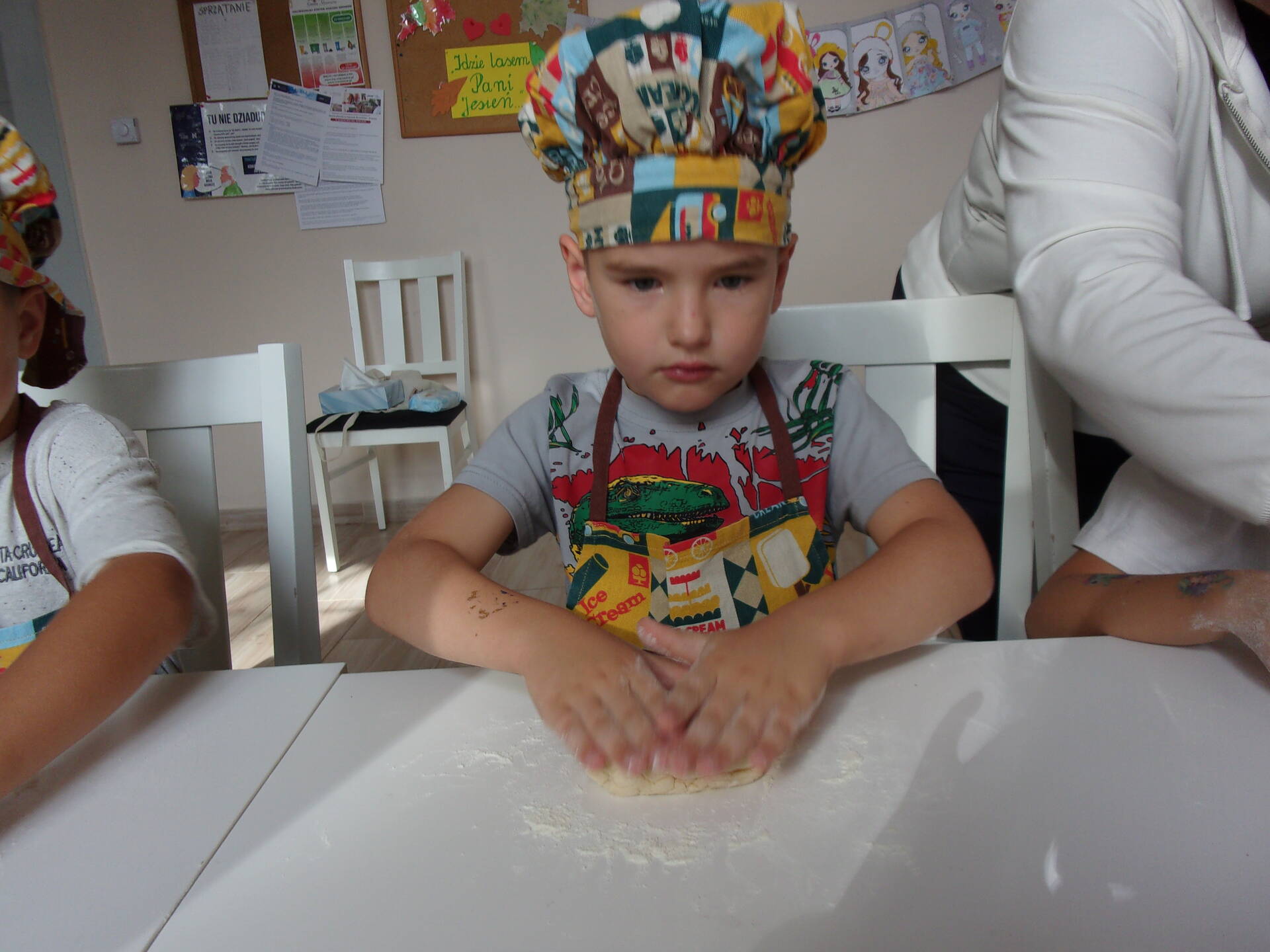 24.09.2025 Gr. V „Niezapominajki” uczestniczyła w warsztatach kulinarnych zorganizowanych przez Stowarzyszenie „Z Seniorami Łatwiej”. Dzieci pod nadzorem doświadczonego piekarza, pana Mikołaja Wiatrowa, wspólnie z seniorami upiekły pyszne drożdżowe bułeczki. Gdy bułki piekły się w piekarniku, Niezapominajki śpiewały seniorom piosenki o jesieni oraz kolorowały obrazki. Na koniec jeszcze wspólne zdjęcie – z pachnącymi wypiekami!