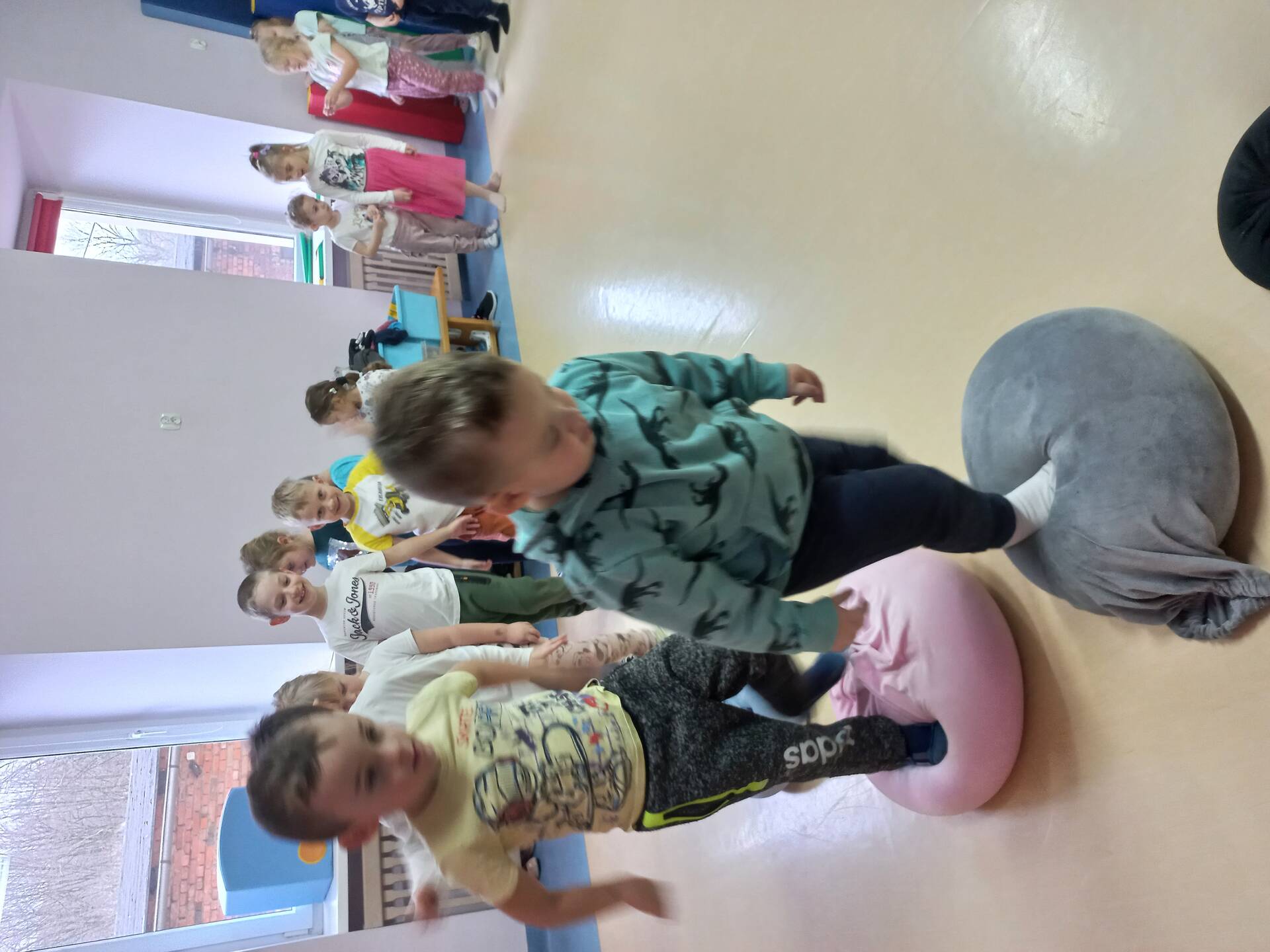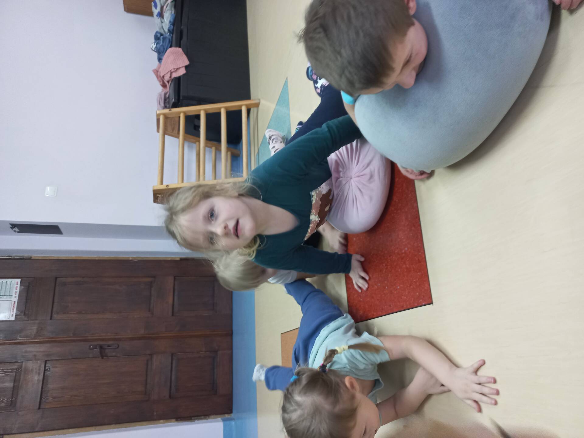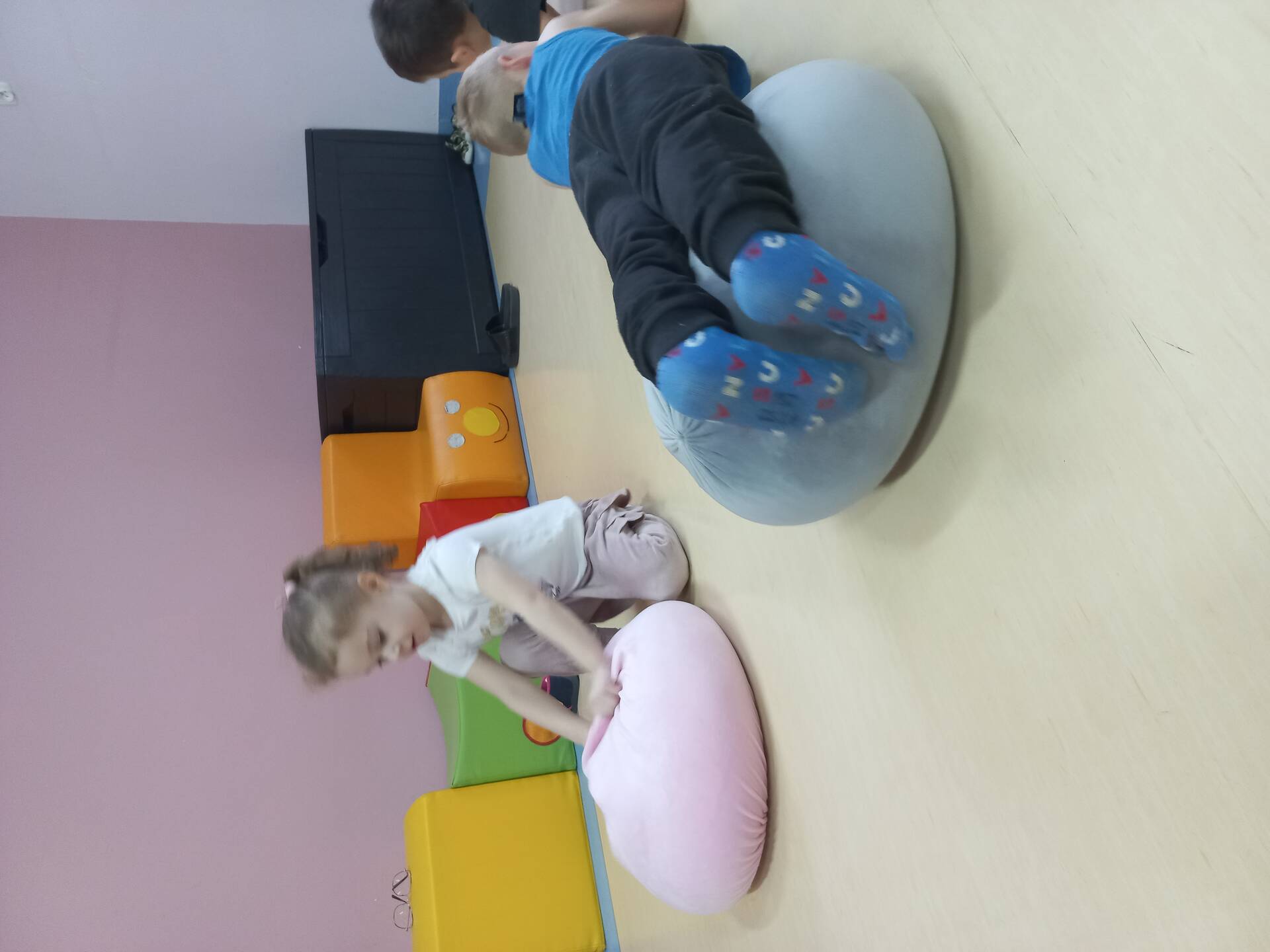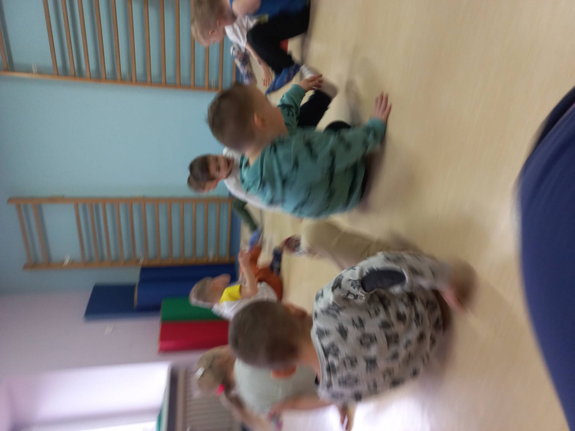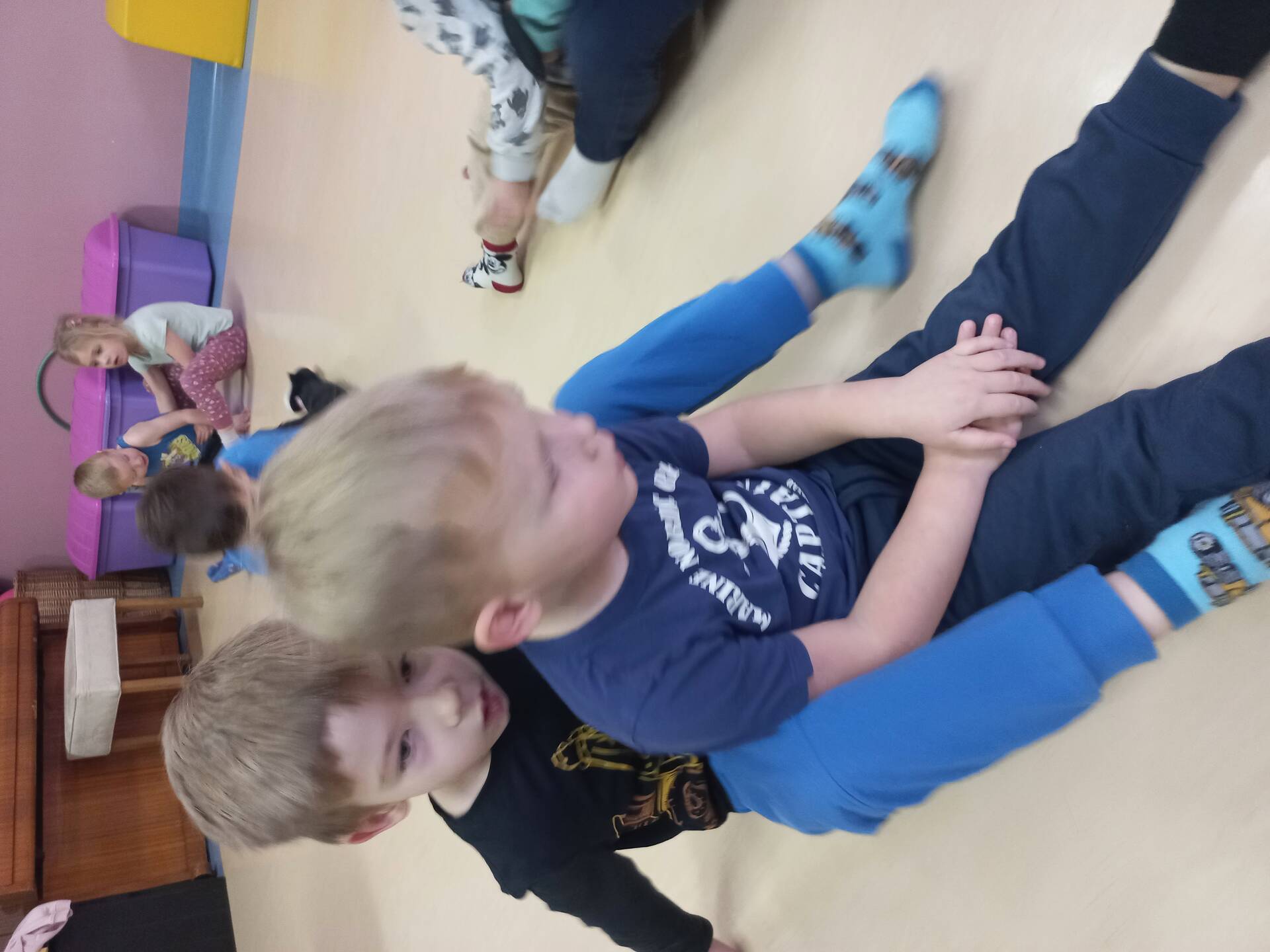 25.01.2024r. Bratki I Fiołki wspólnie bawiły się w zabawy ruchowe z wykorzystaniem kul Sensolyke. Zajęcia zaczęły się od budowania wzajemnych relacji -najlepszą metodą jest Metoda Ruchu Rozwijającego W. Sherborne. Dzieci dobrały się w pary -maluszek ze starszakiem i wspólnie wykonywały ćwiczenia. Takie zabawy są okazją do budowania wzajemnego zaufania i oraz uczą współpracy. Następnie dzieci bawiły się kulami Sensolyke. Wszystkie zabawy mają pozytywny wpływ na integrację sensoryczną. Dzieci toczyły, ugniatały i przeskakiwały. To był bardzo miło spędzony czas.