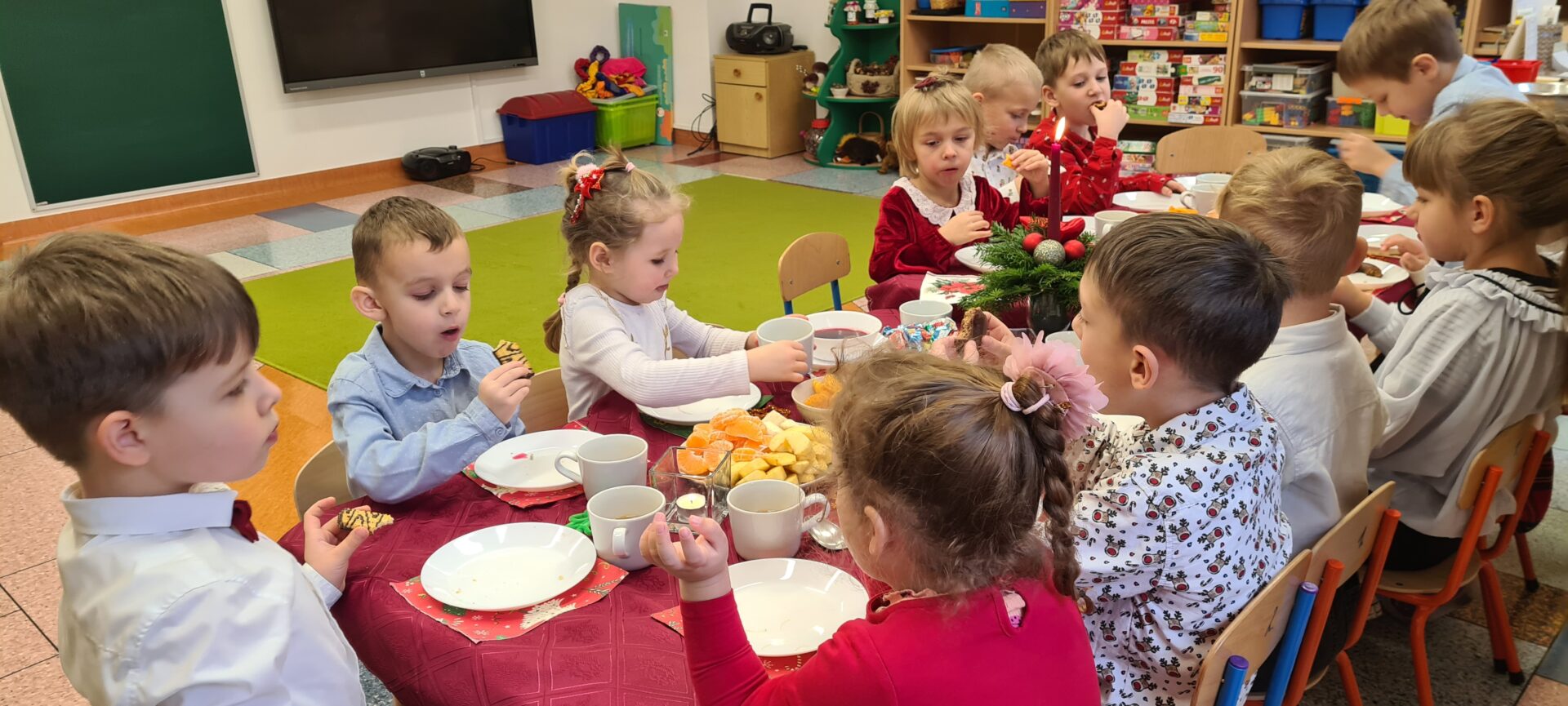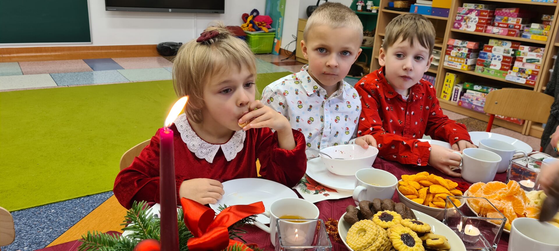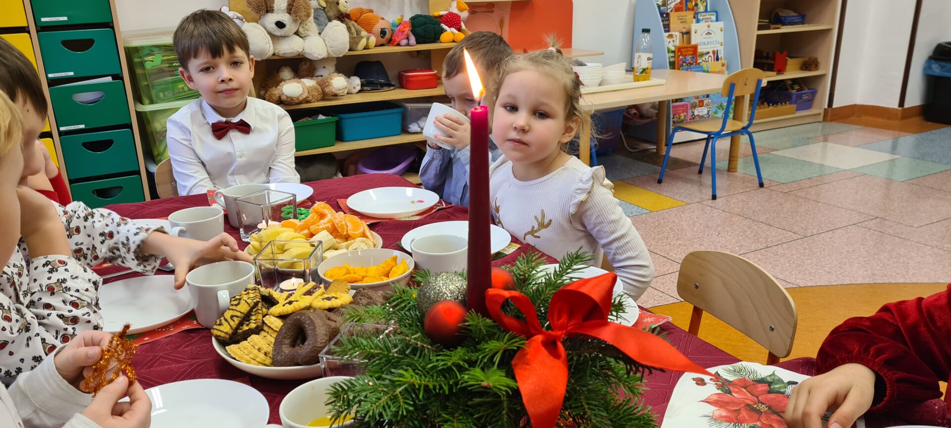18 grudnia Bratki usiadły do wspólnej, grupowej Wigilii. Pięknie przystrojony stół, zastawiony świątecznymi przysmakami, a także składanie życzeń i uroczysta atmosfera w przedszkolu zapowiadały nadchodzące Święta Bożego Narodzenia i wprowadzały ten jedyny w roku, wyjątkowy nastrój.