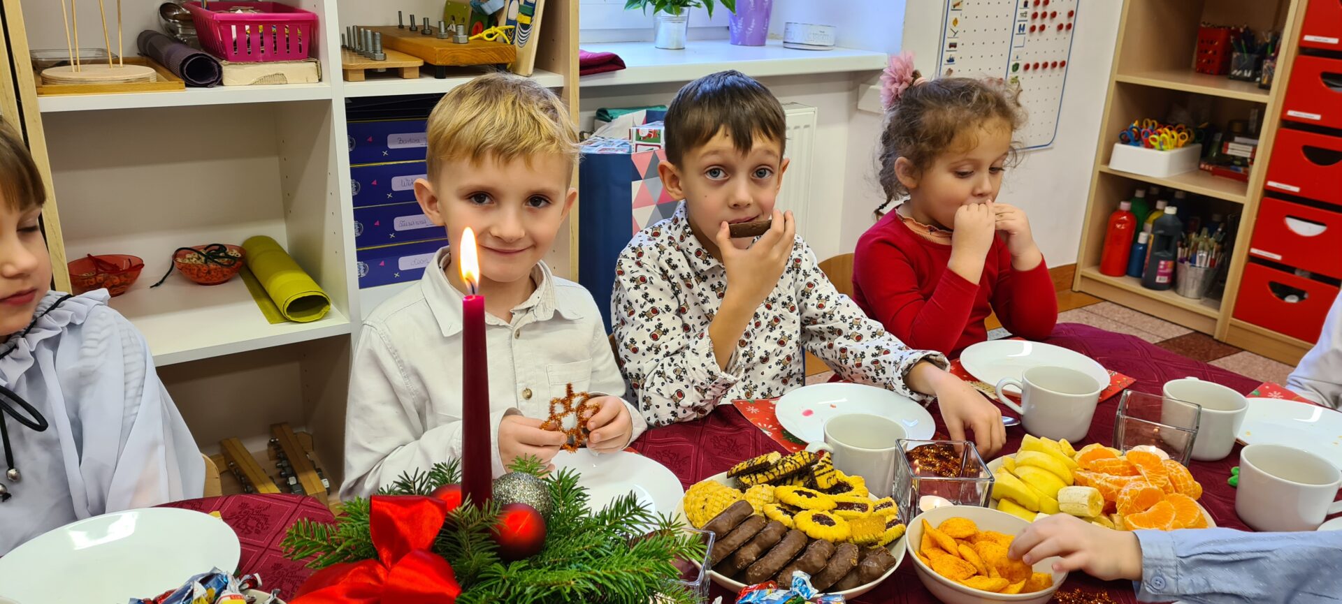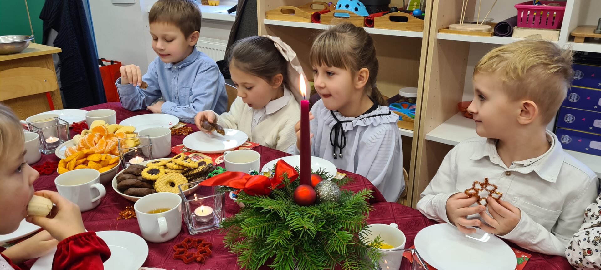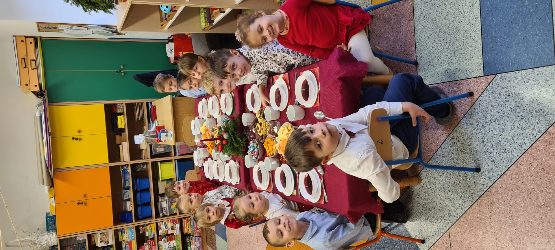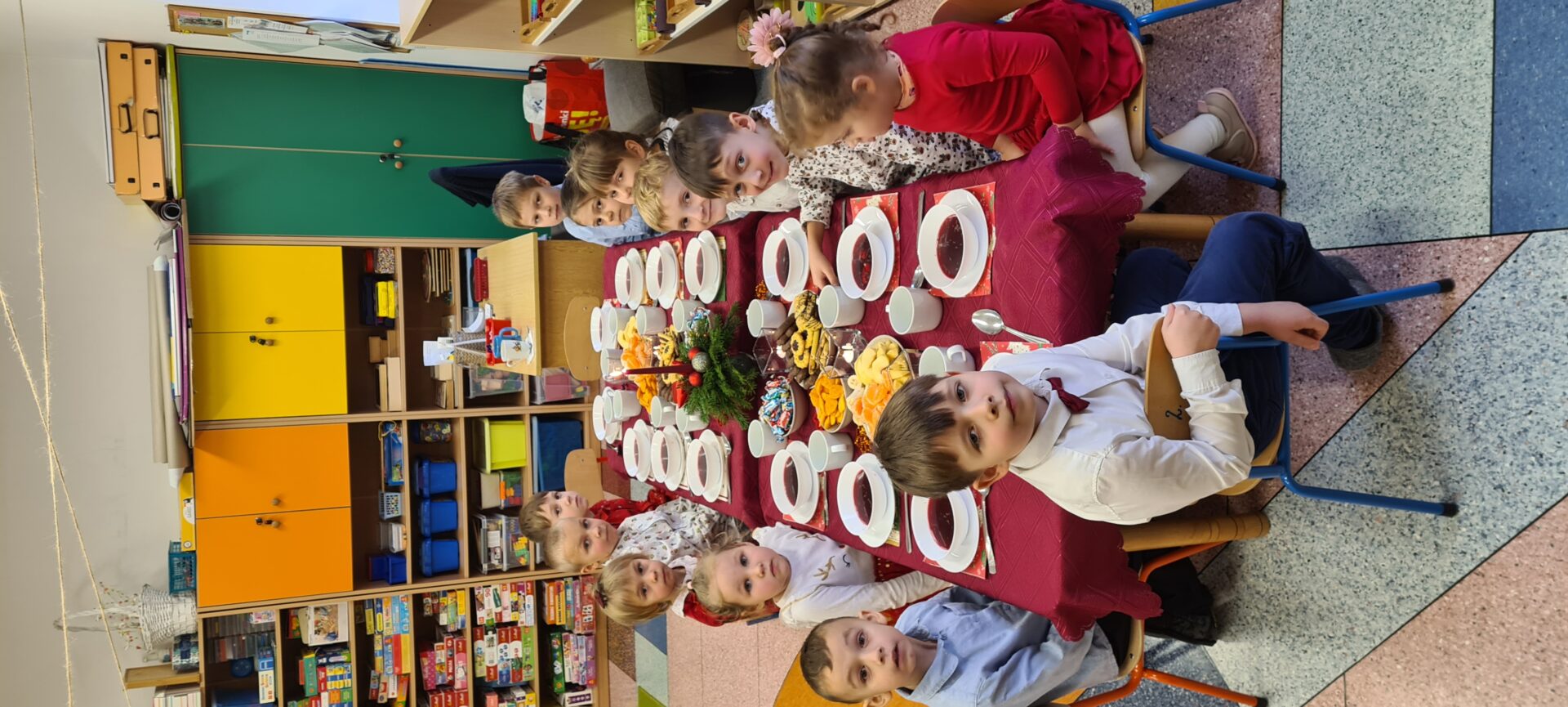 18 grudnia Bratki usiadły do wspólnej, grupowej Wigilii. Pięknie przystrojony stół, zastawiony świątecznymi przysmakami, a także składanie życzeń i uroczysta atmosfera w przedszkolu zapowiadały nadchodzące Święta Bożego Narodzenia i wprowadzały ten jedyny w roku, wyjątkowy nastrój.