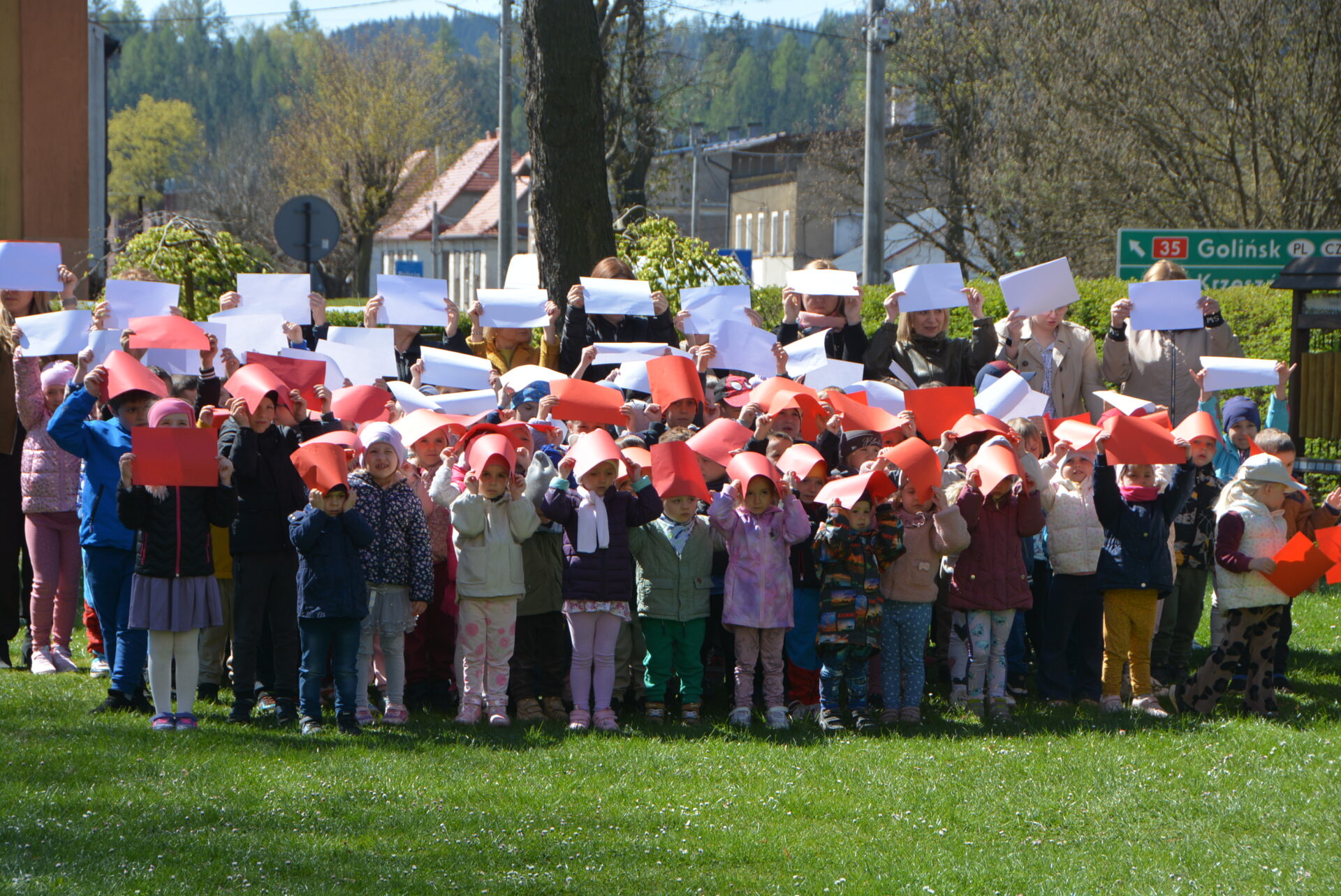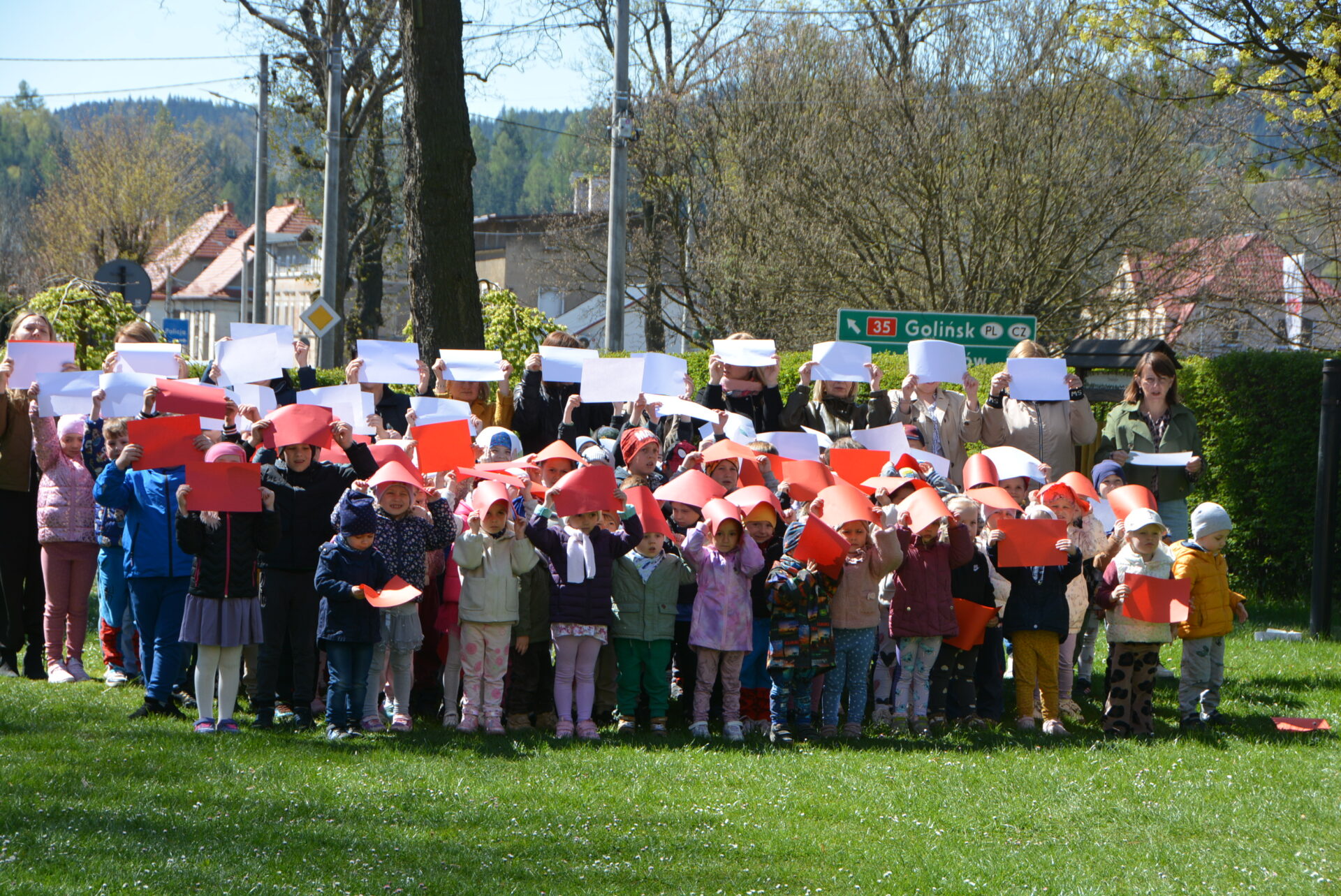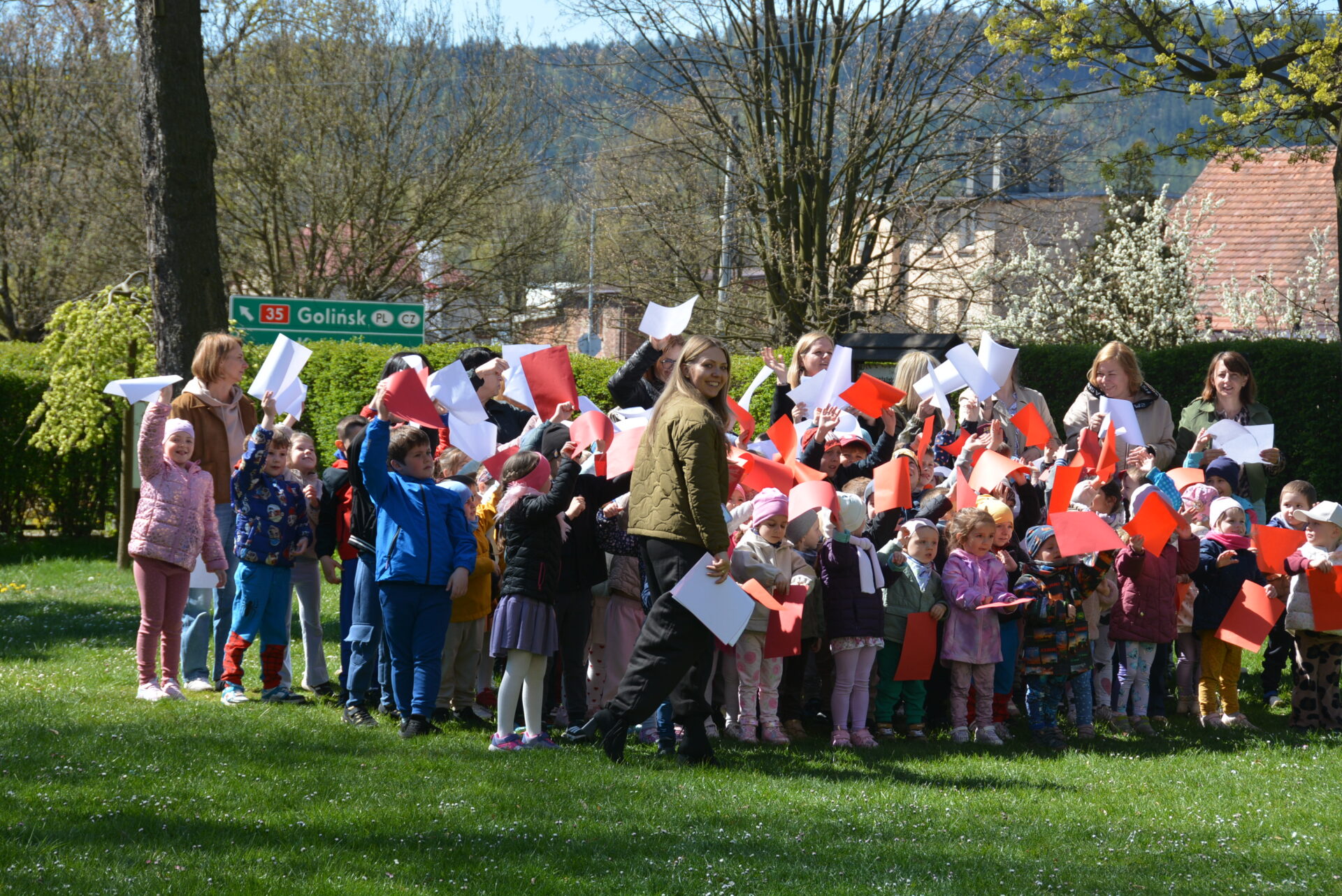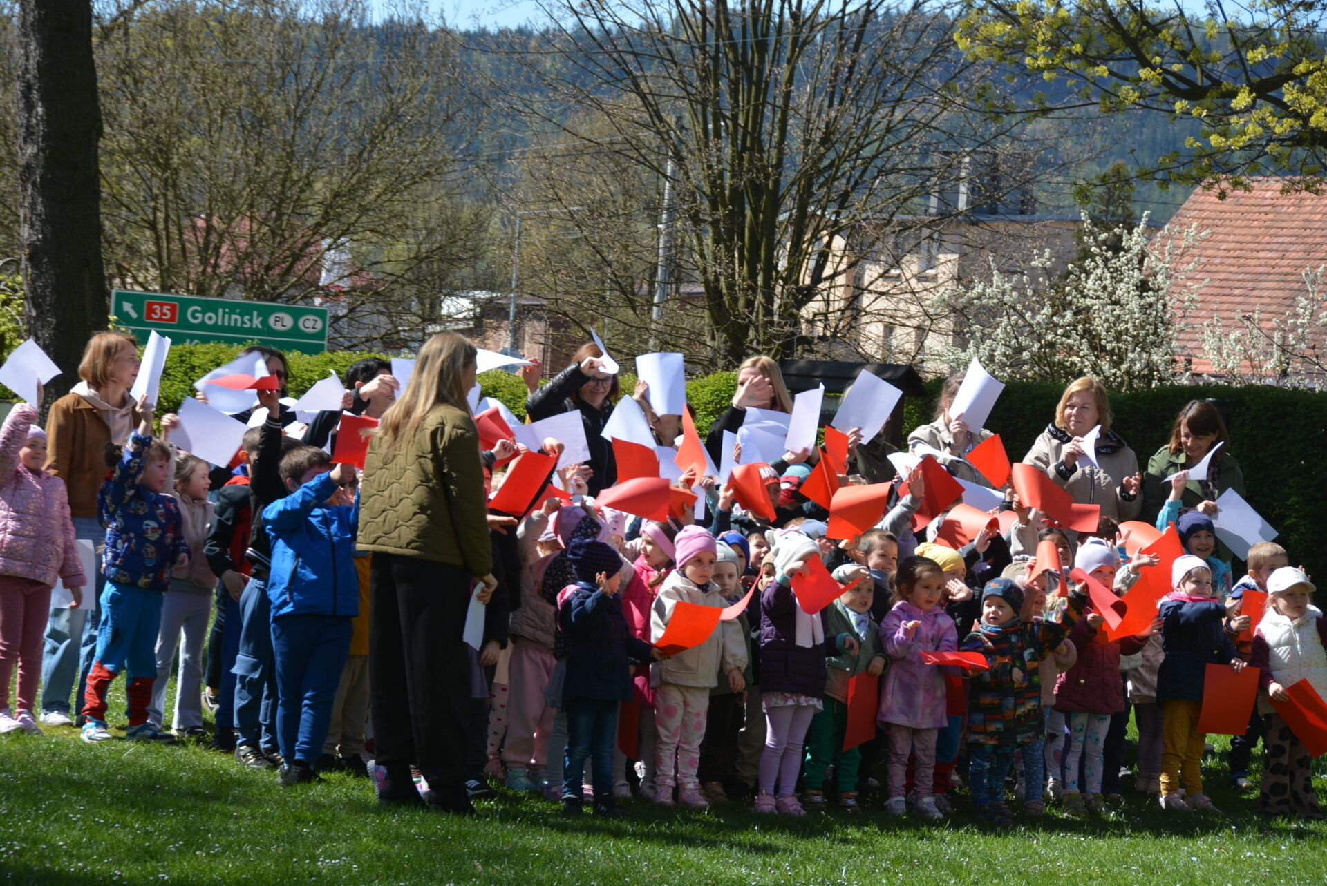 Tuż po otwarciu wystawy przedszkolaki wzięły udział w akcji „ruchoma flaga” i stworzyły pasy barw narodowych w przedszkolnym ogrodzie – już w sobotę, 2 maja, Dzień Flagi. Dzień upłynął więc na świętowaniu poczucia lokalnej i narodowej tożsamości.